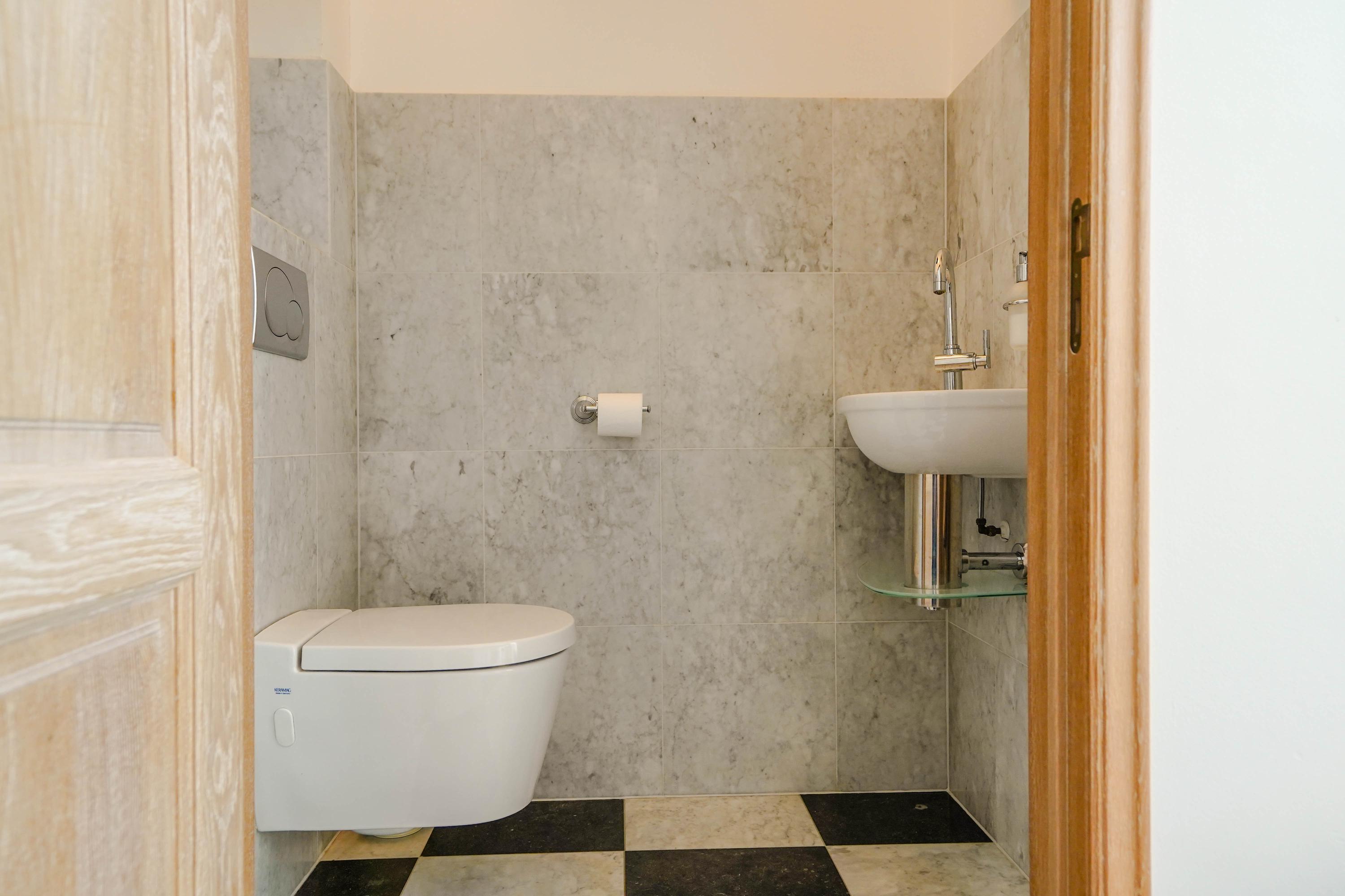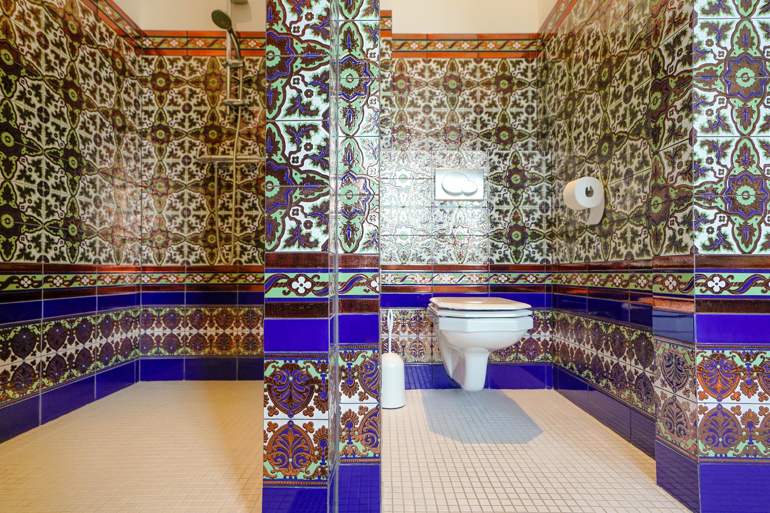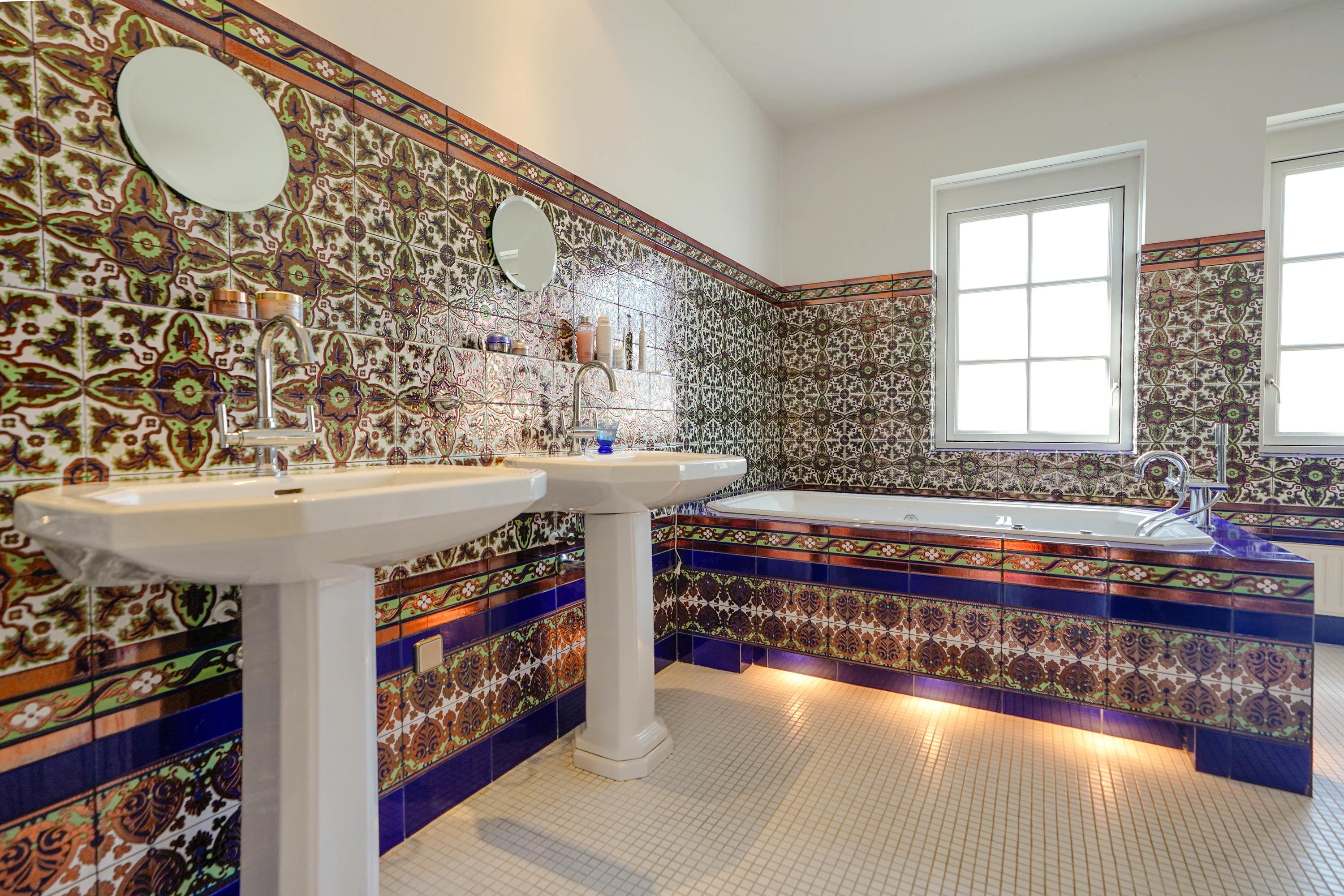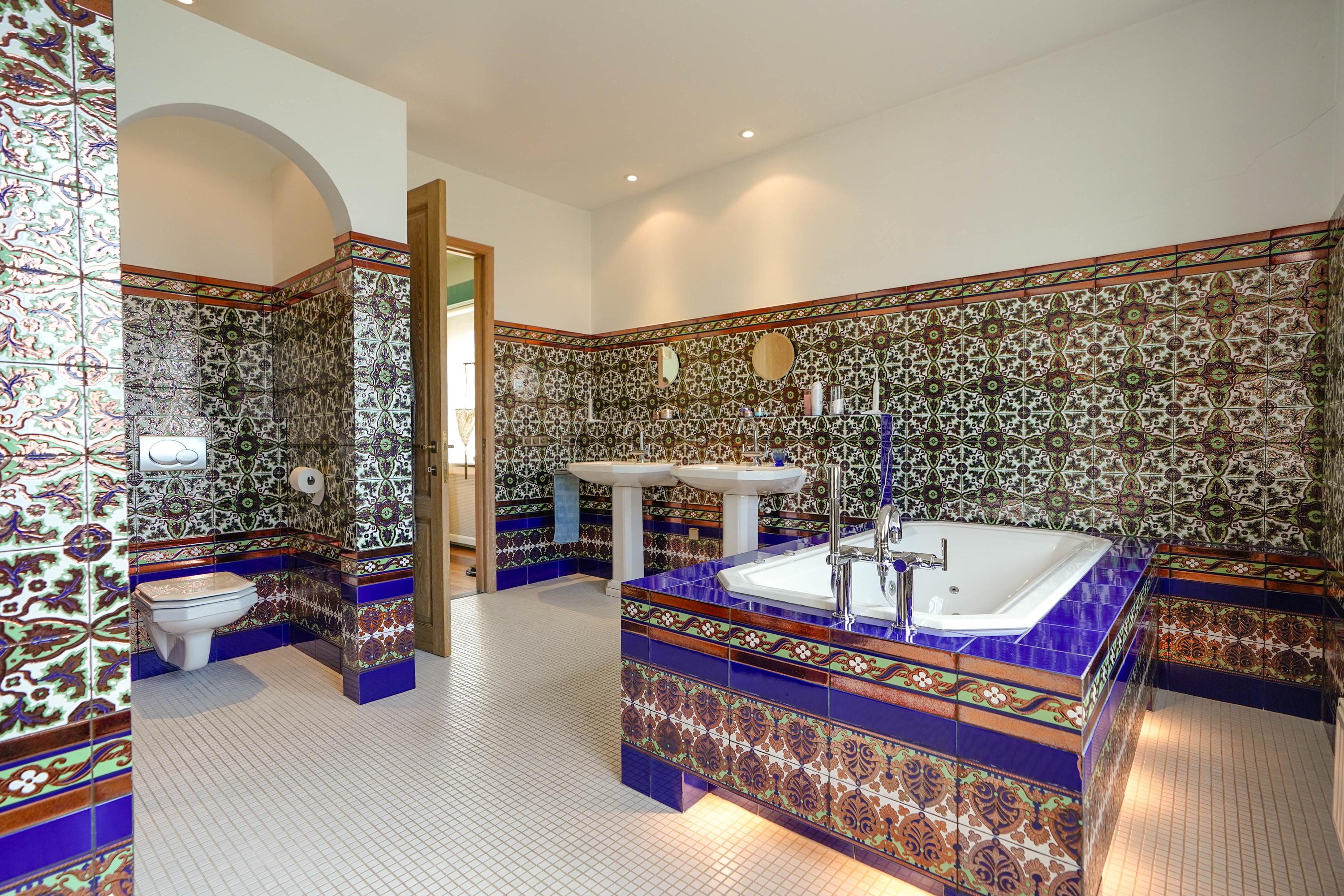 De royale badkamer is ingericht in Andalusische stijl, met een inloopdouche, een bubbelbad, design radiator, twee Sphinx wastafels, een toilet, en bijpassende wandkasten van Sphinx. De exclusieve, nauwgezet op patroon aangebrachte, Andalusische wandtegels zijn speciaal geïmporteerd vanuit Spanje (Mensaque Rodrigues, Triana/Sevilla).