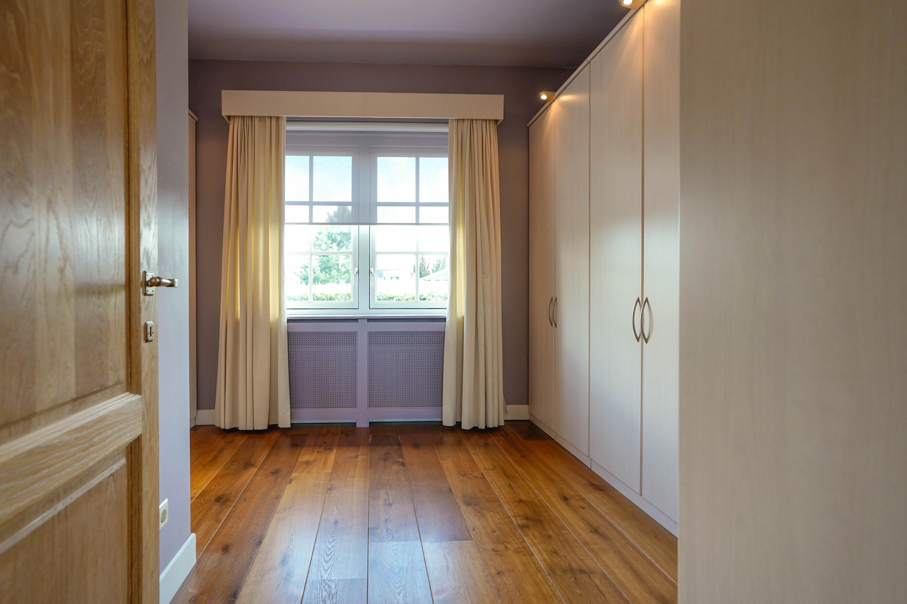 De kleedkamer is aan beide zijden voorzien van garderobekasten.