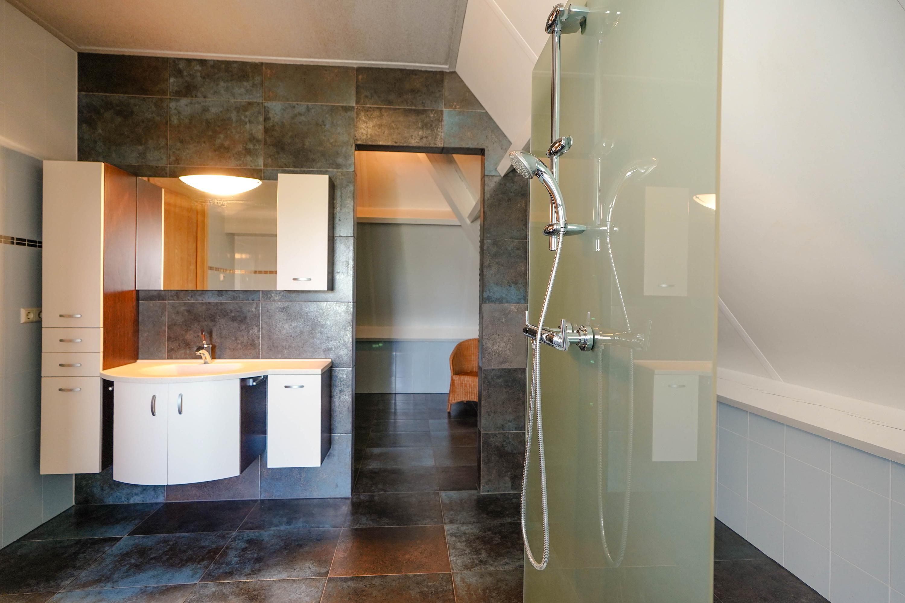 De badkamer/fitness room biedt volop bewegingsruimte. De douche bestaat uit een verticale glasplaat met douchekraan en een vloerrooster, zodat er maar één wand is droog te maken na afloop. De ruimte biedt plaats aan meerdere fitnessapparaten en staat in open verbinding met de saunaruimte. De Villeroy & Boch infrarood sauna is nooit in gebruik genomen en is in nieuwstaat.