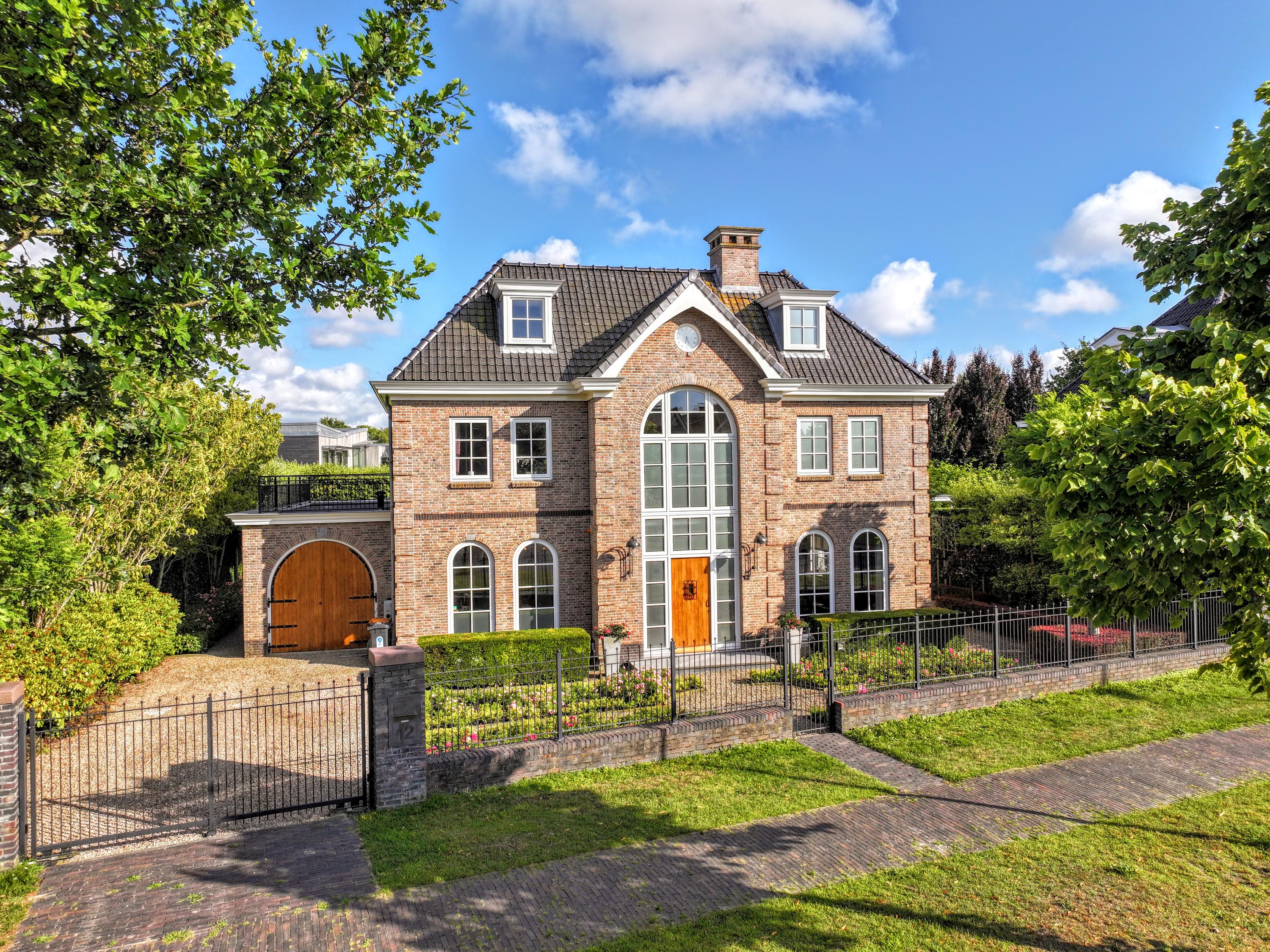 De villa is bepaald geen standaard ontwerp. Dat is meteen te zien aan de vier rondboogramen tot aan de vloer en de getoogde glaspui in de vooruitspringende middenpartij. Een individueel ontwerp in landhuisstijl, met vele, exclusieve details, zoals gemetselde hoekblokken, een robuuste, eiken voordeur met speciaal ontworpen, gesmeed beslag, zware, getoogde ‘staldeuren’ van de garage en een stijlvolle detaillering van de schoorsteen en de boeiranden. Ook de handvorm gevelstenen en de keramische dakpannen zijn zorgvuldig gekozen. De satelliet gestuurde klok in de topgevel schakelt automatisch over op zomer- en wintertijd.