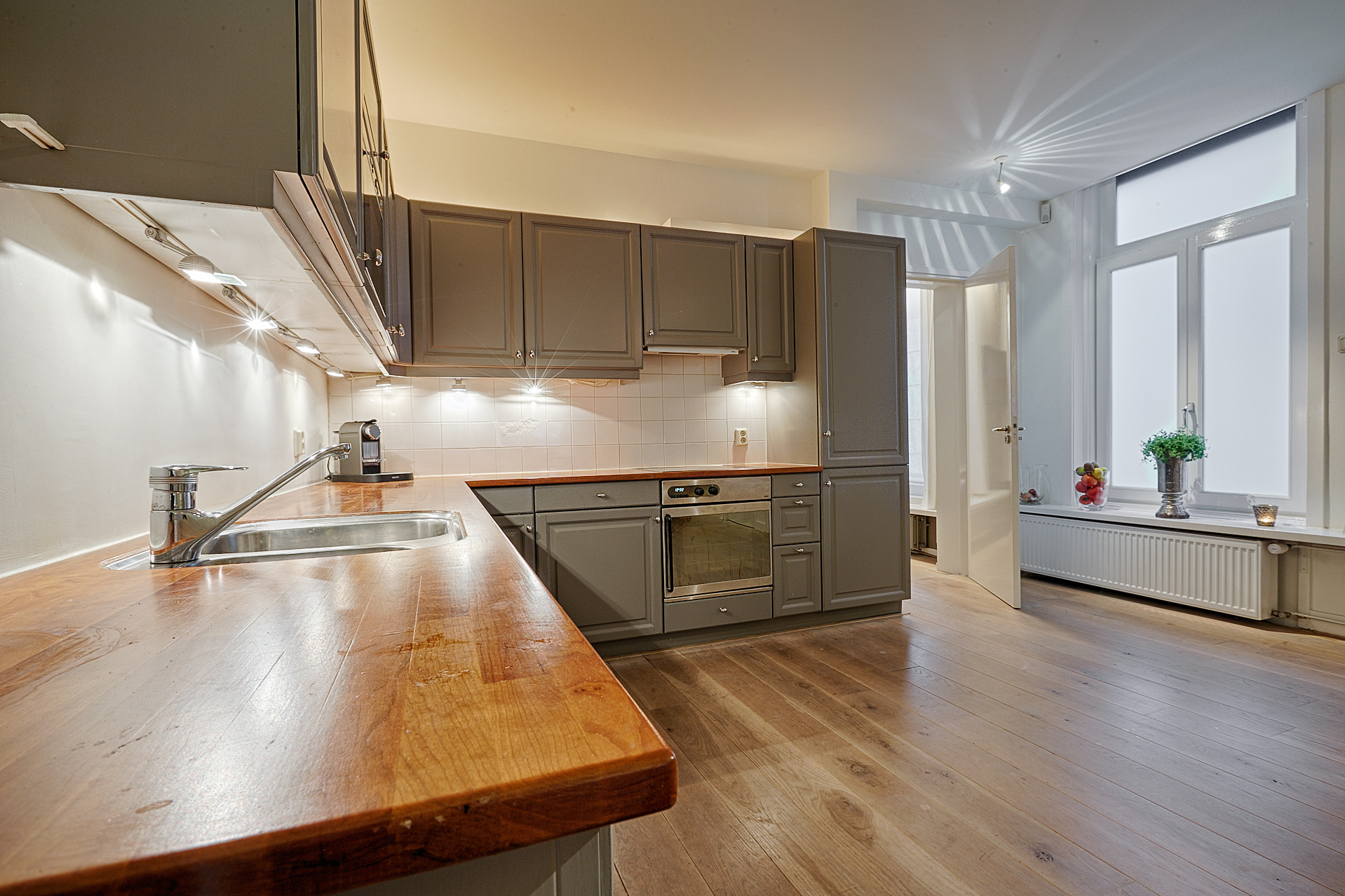 At the front of the building is the imposing living room, high ceilings, a stylish fireplace, and a phenomenal view of the Hofvijver. From the living room, there is an elegant passageway to a spacious library or bedroom, complete with open bookcases. Adjacent is a hallway with ample closet space and a finished marble bathroom with a vanity, shower, and toilet. The kitchen is equipped with built-in appliances and ample closet space. At the rear of the apartment is the very spacious master bedroom, offering peace and privacy. This room opens onto a hallway with a walk-in closet and space for the gas central heating boiler. There is also a separate laundry room with connections for a washer and dryer and additional storage space. The second, luxurious marble bathroom features a bathtub, a spacious walk-in shower, a stylish vanity with a built-in vanity, and a toilet.