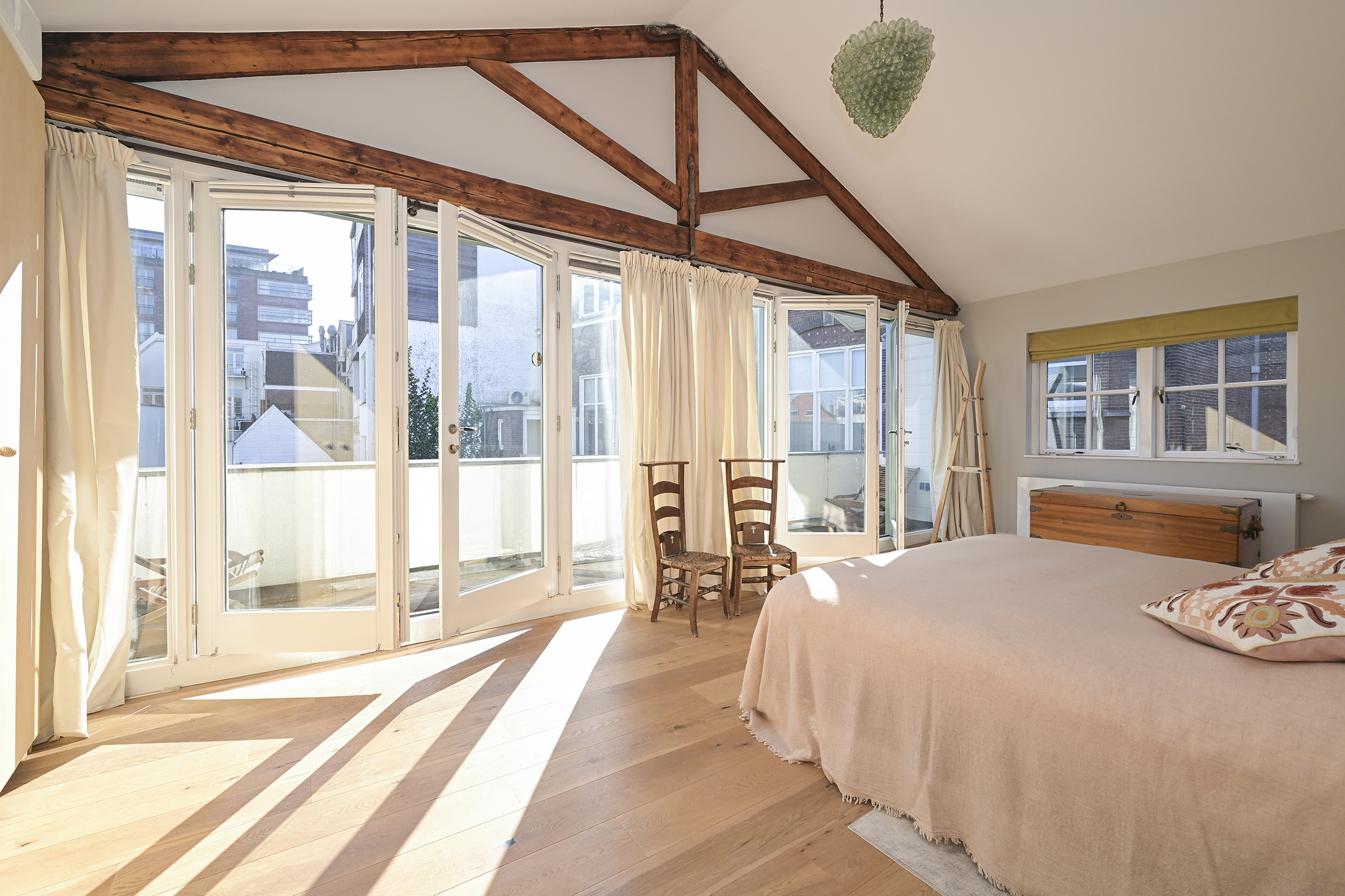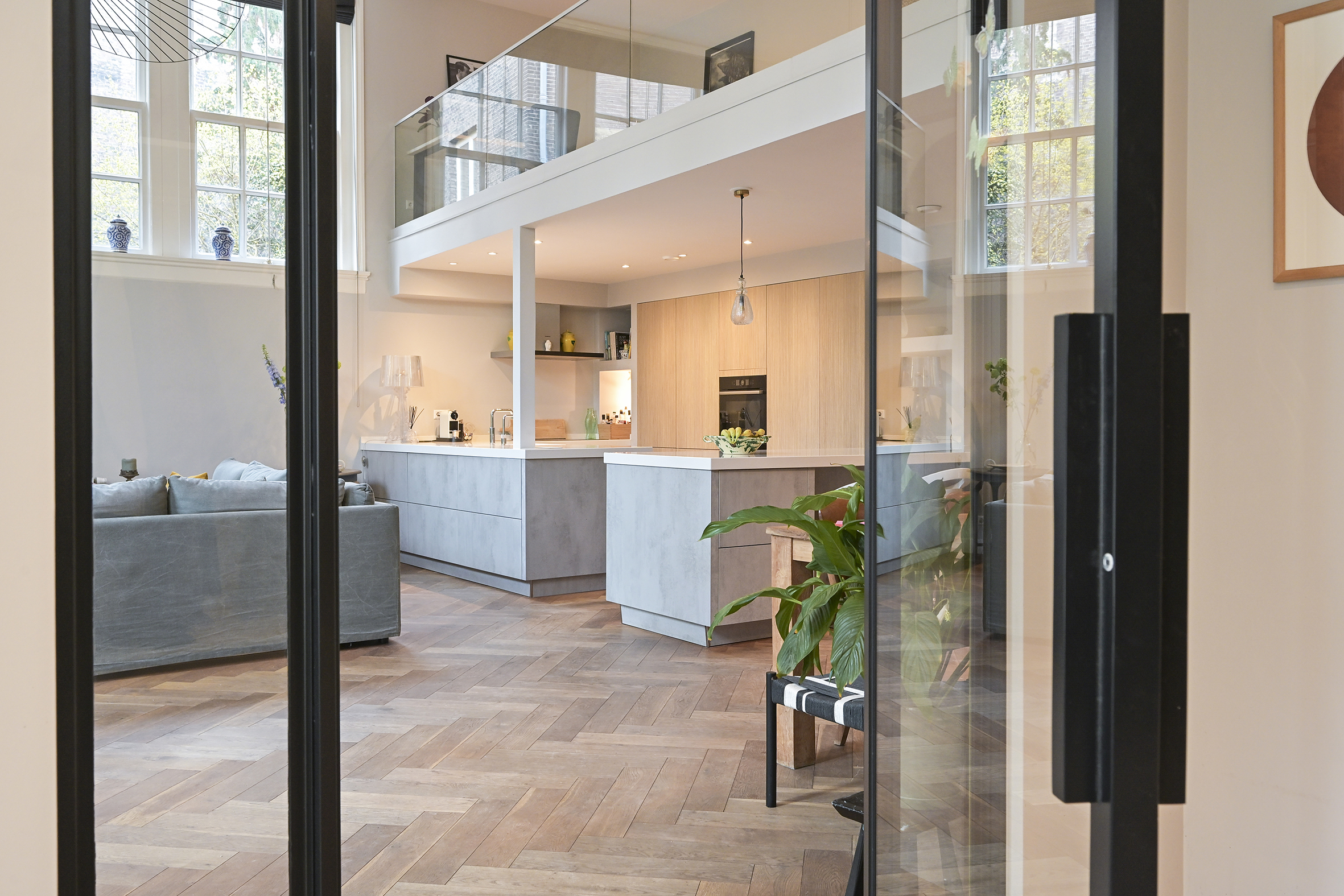 Behind the historic facade lies this spacious and bright home, which features three large bedrooms, two modern bathrooms, and an impressive living room of approximately 70 m². The high ceilings and open loft enhance the feeling of space. French doors leading to the courtyard with its own south-facing terrace offer a sense of freedom and privacy. This privacy is particularly high, partly because the entrance gate is closed in the evenings and on weekends.