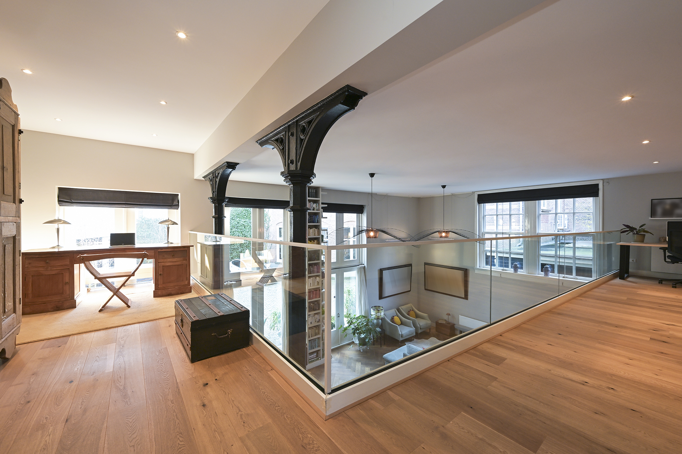 De 1e verdieping bestaat uit een grote L-vormige vide die op verschillende wijze kan worden benut. Thans zijn hier twee heerlijke lichte werkplekken gesitueerd maar mocht men behoefte hebben aan extra slaapkamers dan kunnen deze hier worden gecreëerd.