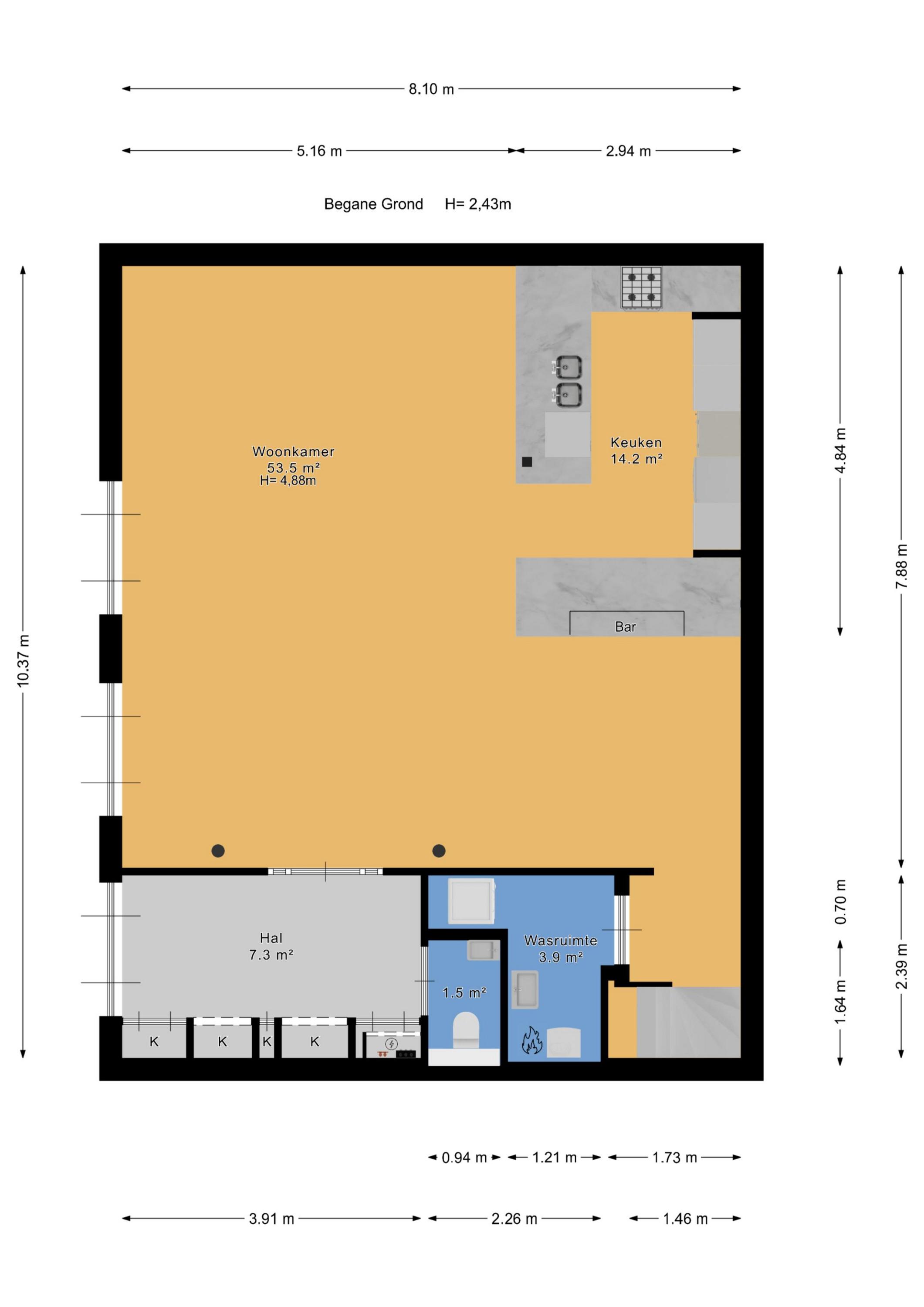 Entree, ruime hal met ingebouwde garderobekasten, moderne wc met fonteintje, via het stalen frame met glas komen we in de royale zit/eetkamer met open moderne keuken voorzien van inbouw apparatuur. Deze ruimte heeft een loftachtig gevoel door de hoogte en de grote raampartijen komt er veel licht binnen. De vloerafwerking is een fraaie eiken parket vloer en er zijn twee sets openslaande deuren naar het terras voor het huis. De begane grond wordt gecompleteerd door een interne berging voorzien van de Cv en waterpomp & ontharder en de aansluitingen voor wasmachine en droger.