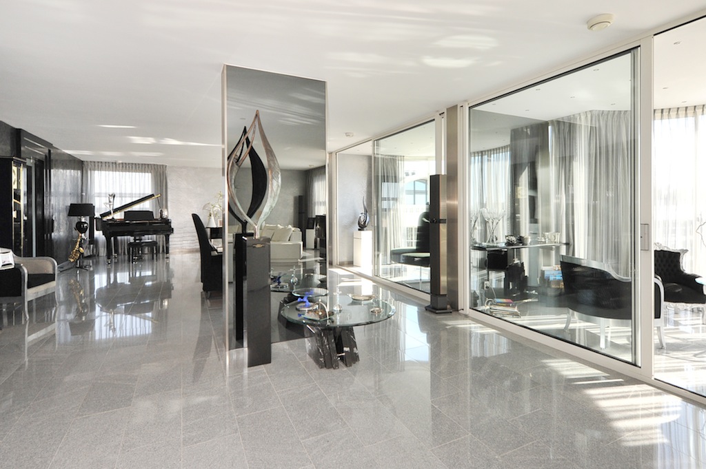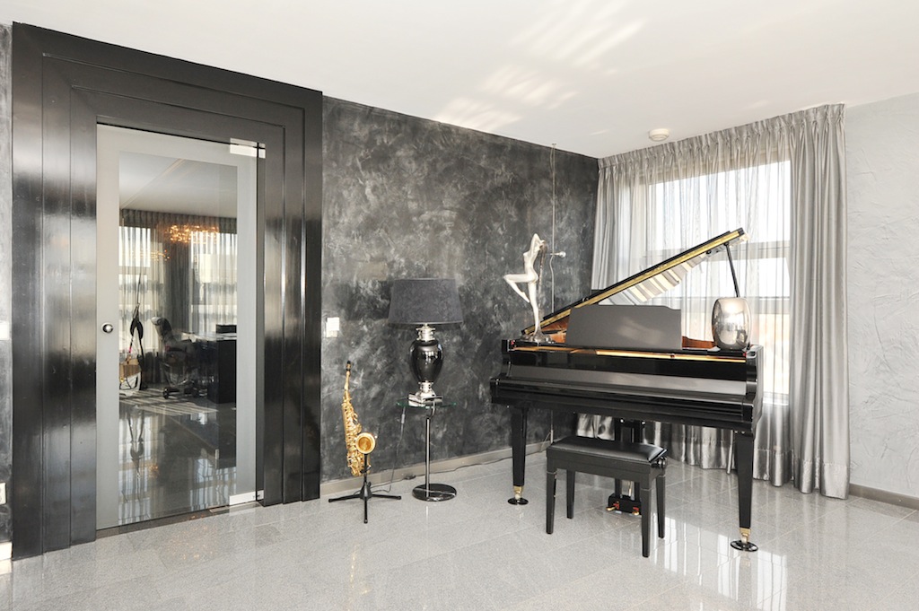 10th floor: private entrance, spacious hall with a coat area, two separate restrooms, generous bedroom (originally two bedrooms) connecting to the private bathroom with a bathtub, shower and toilet, separate kitchen with corner units and a range of appliances, extremely large living room with stunning Chinese travertine flooring, the adjacent corridor opens to a separate dressing room, a second bathroom with a bathtub, shower and vanity, storage room with the central heating unit and laundry station, a separate sauna and large second bedroom.