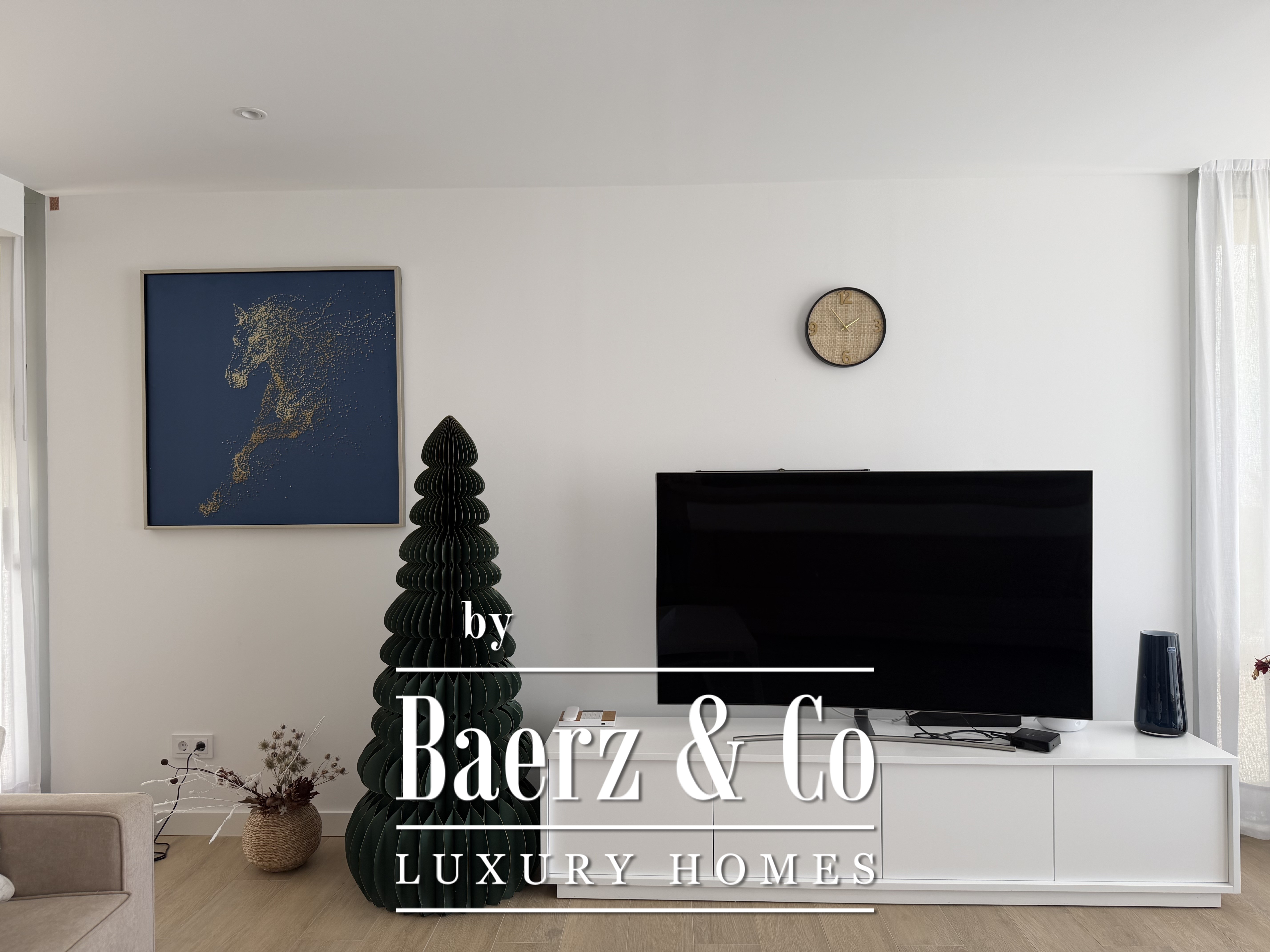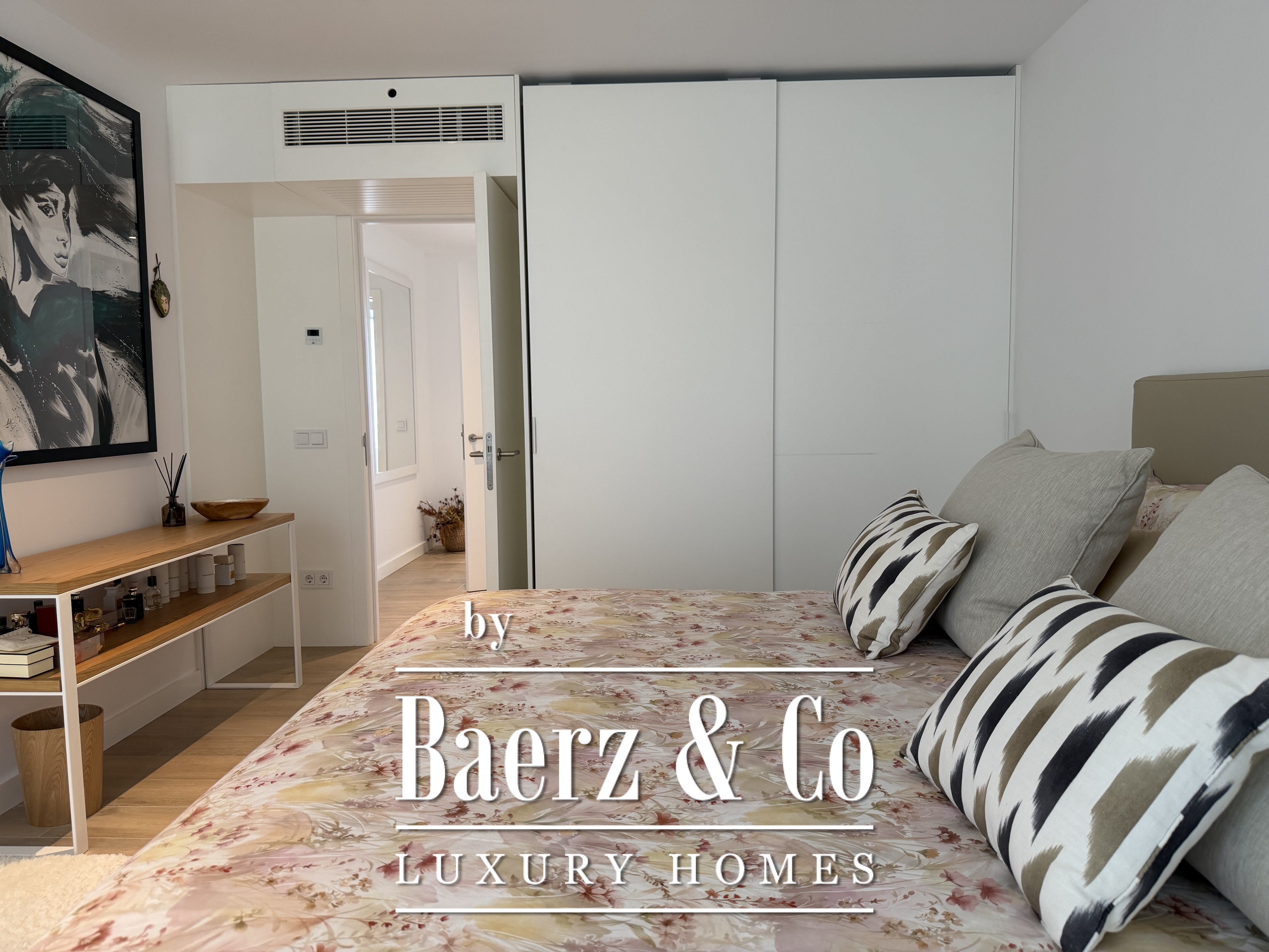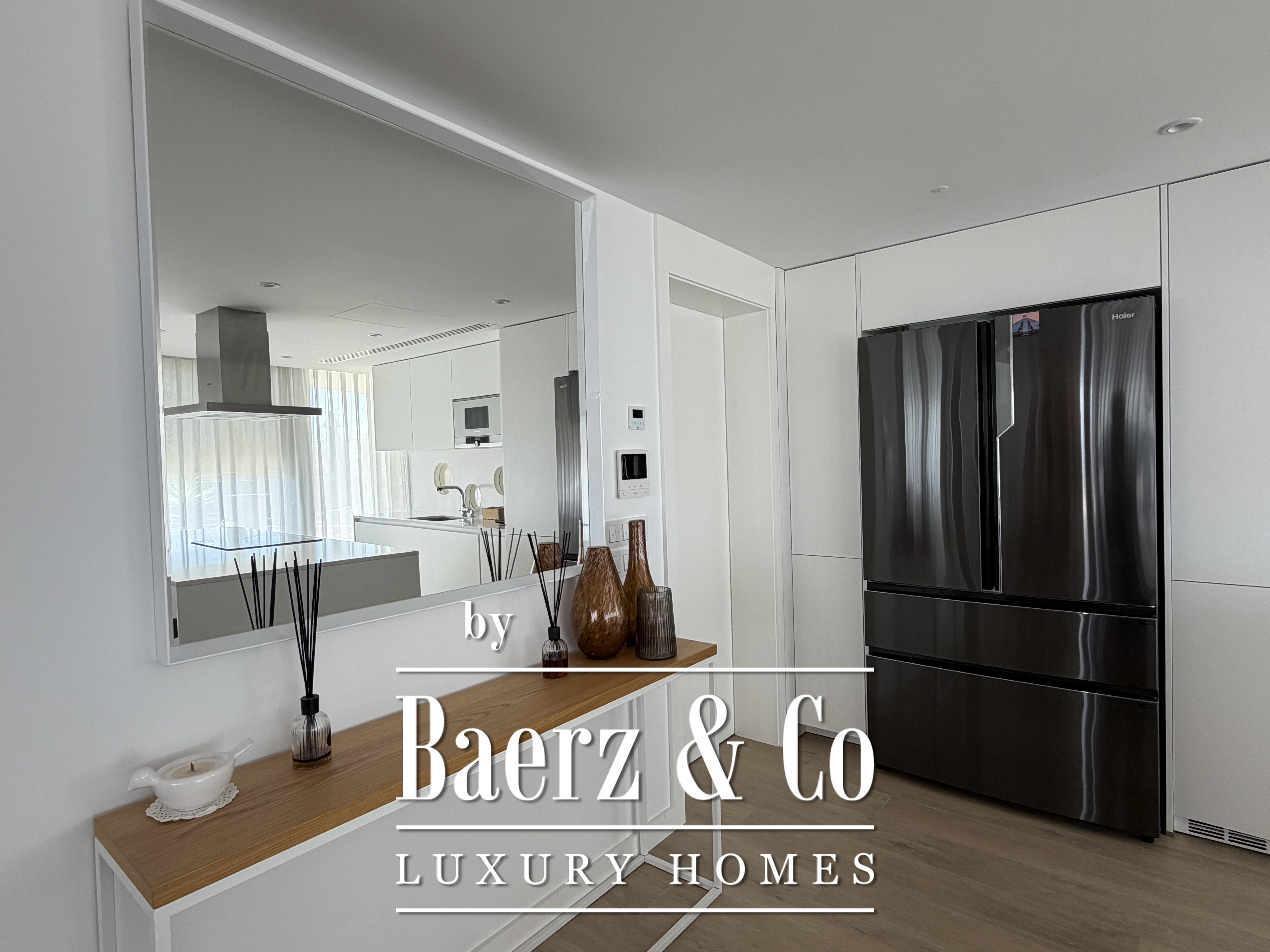 Natural light fills the interiors through expansive windows, framing the horizon and creating seamless access to the terrace and landscaped garden. Three bedrooms offer dressing rooms, while two bathrooms feature modern showers, underscoring the emphasis on refined functionality. The bright living room invites relaxation, whether enjoying a quiet moment or sharing the space with guests.