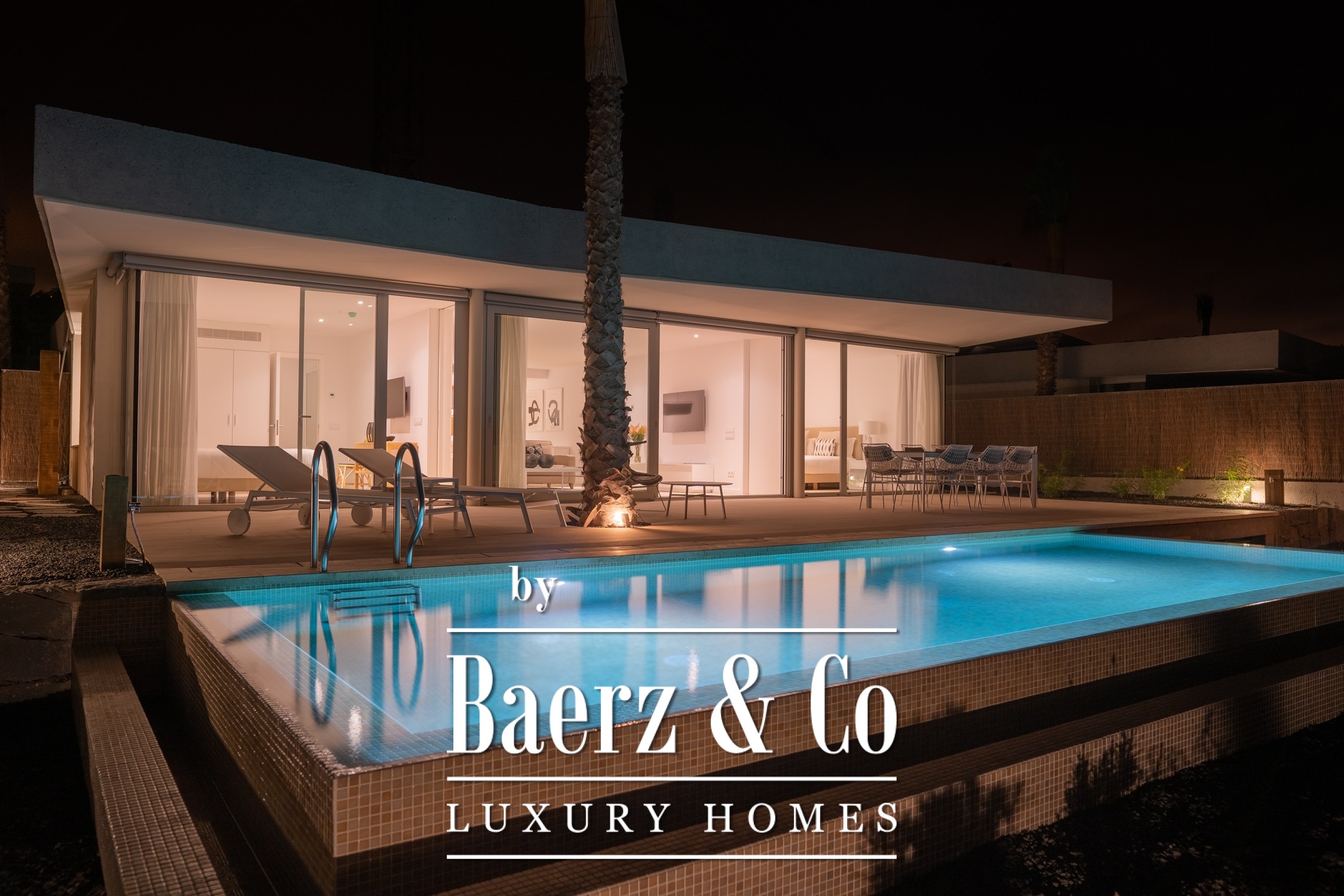 Villa Abama with ocean views welcomes you to the distinguished enclave of southern Tenerife, where contemporary design meets comfort over 265 m² of living space. This single-story villa stands within the esteemed Abama resort, privately set on a 662 m² plot with privileged views across the Atlantic, the golf course, and the island of La Gomera.