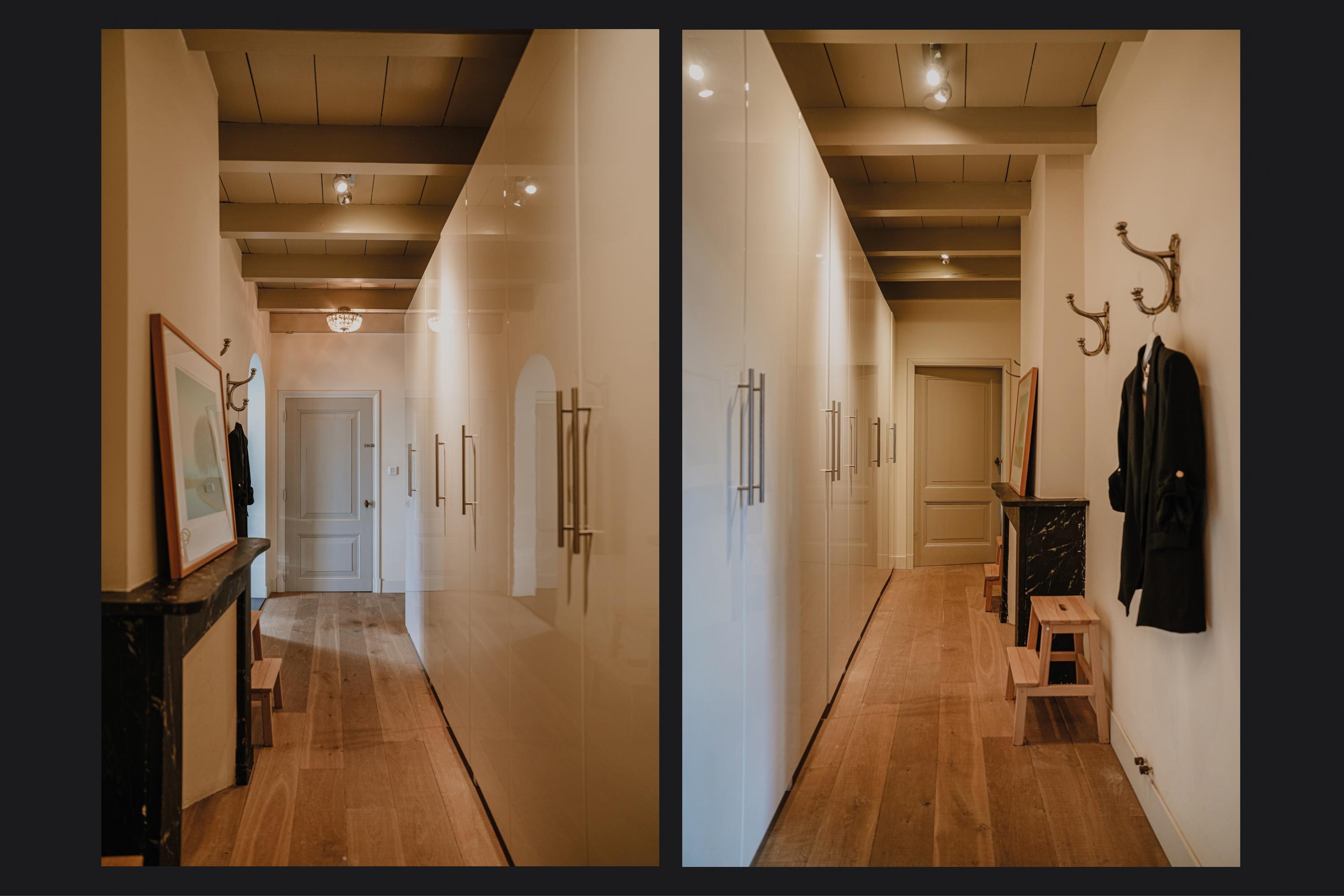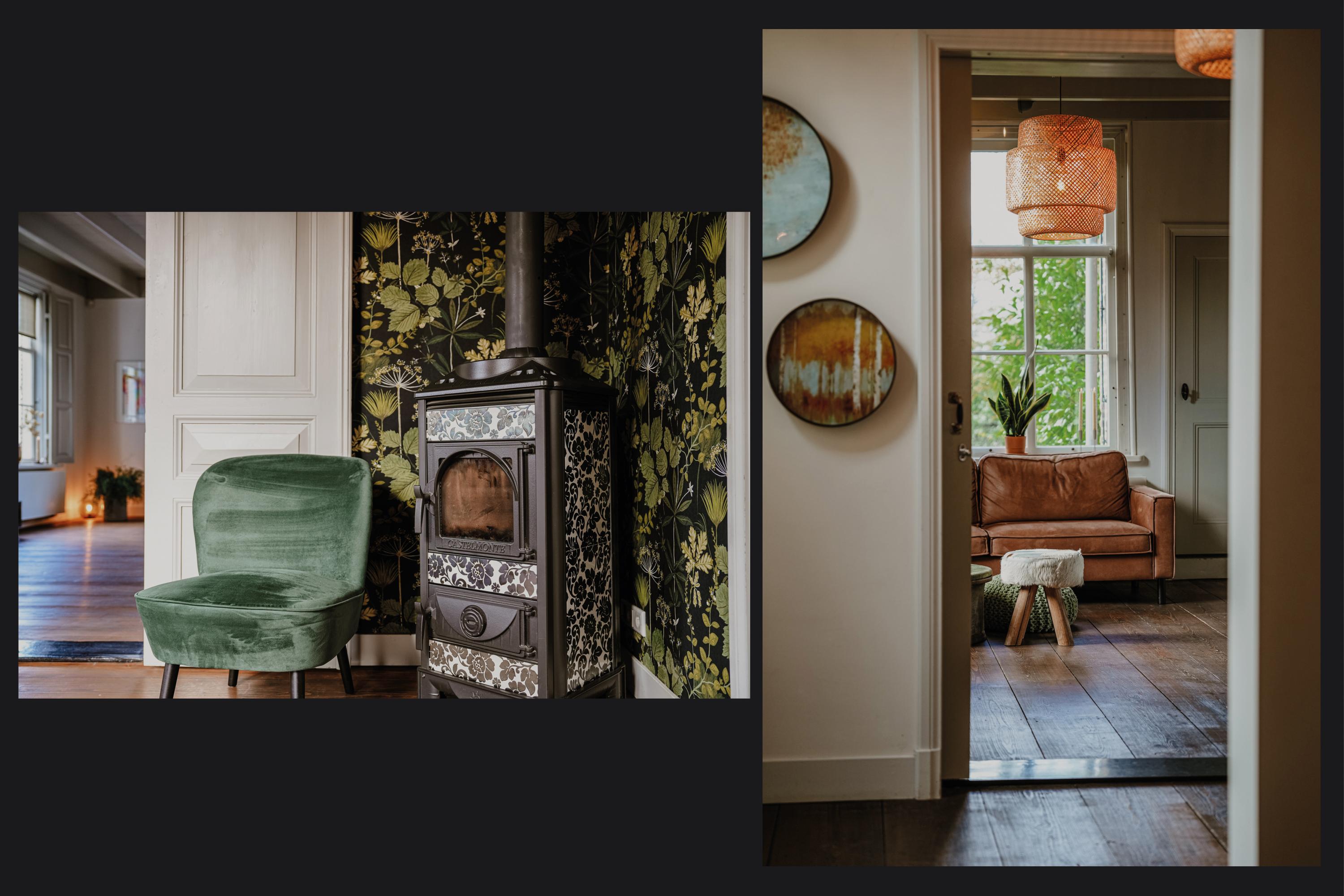 Centrale hal met aan de rechterzijde de voormalige gelagkamer. De antieke toogkast is een stille getuige van een ver verleden. De kamer is momenteel in gebruik als woonkamer, maar leent zich goed als werkruimte, atelier of studio. Er is een hoog balkenplafond, brede vloerdelen en hoge 6-ruits vensters zijn voorzien van Ruysdael monumentenglas, geflankeerd door binnenluiken. Er zijn tijdloze Jaga convectoren toegepast en een luxe Stuv haard zorgt voor maximaal comfort. Antieke paneeldeuren leiden naar de aangrenzende tuinkamer.