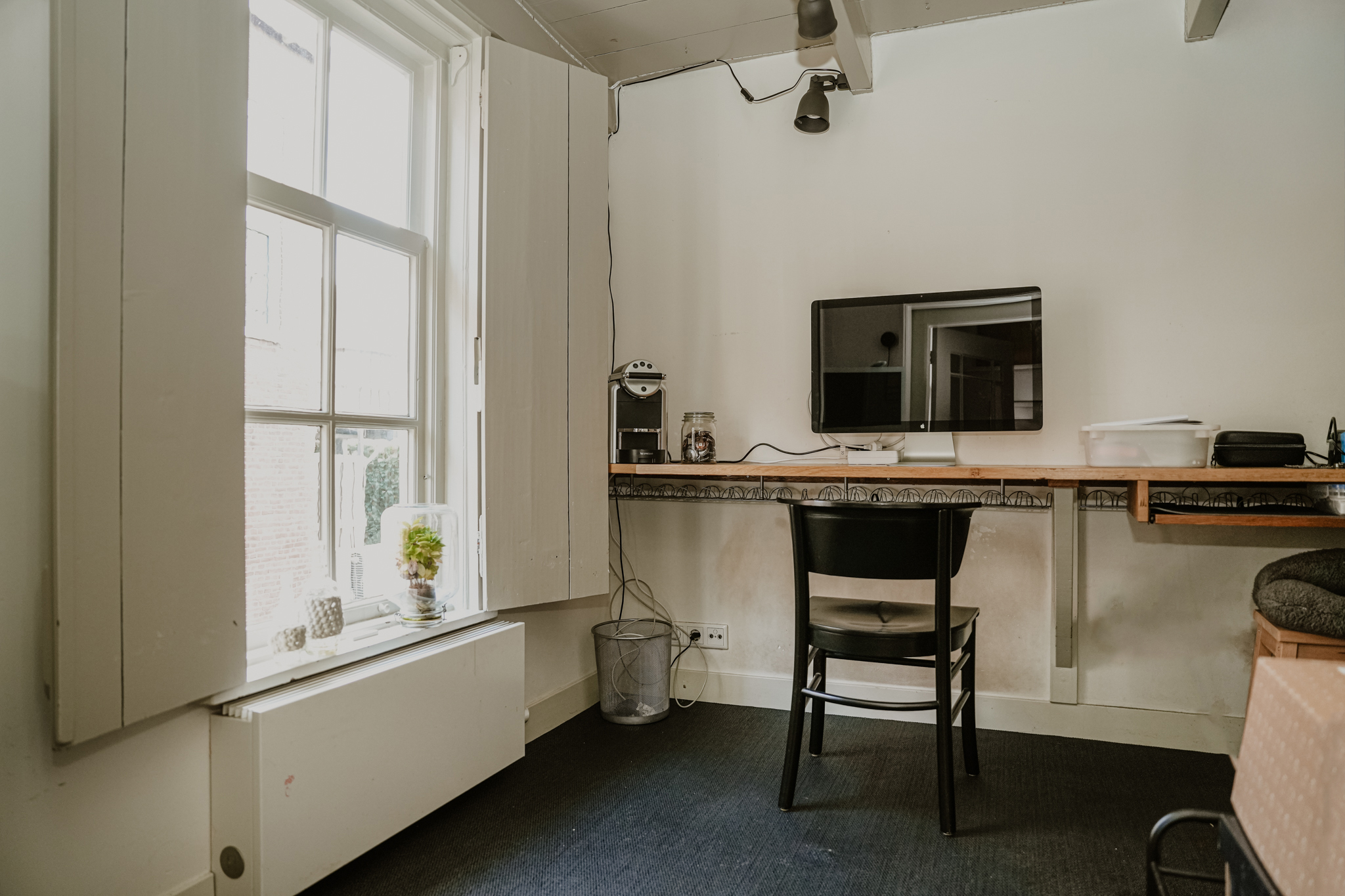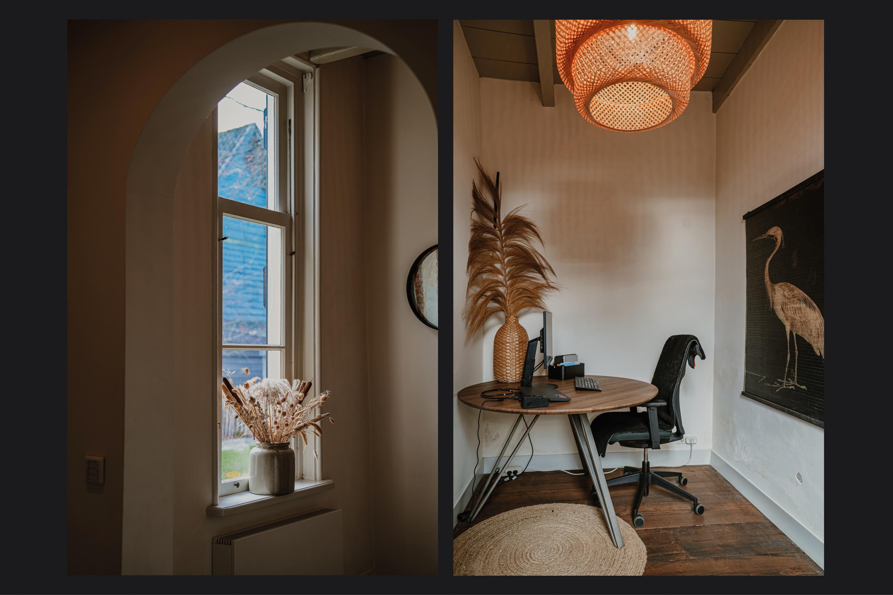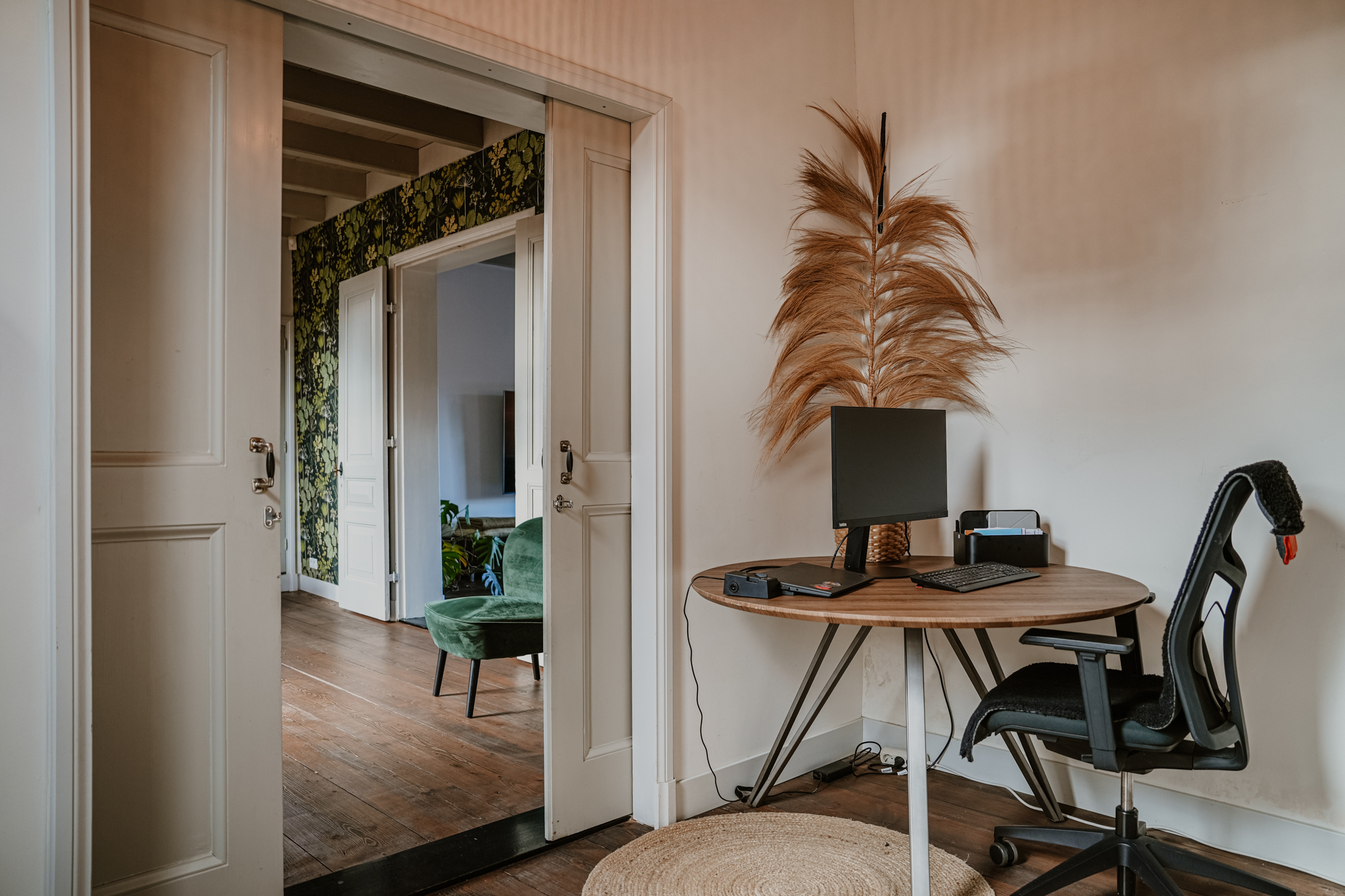 Aan de linkerzijde van de hal bevindt zich een prachtige werk-/eetkamer met antieke schouw, brede vloerdelen, fraaie 6-ruits vensters en een vaste kast. Aan de werk-/eetkamer grenst een technische ruimte waarin onder andere het buffervat voor warm water is opgesteld.