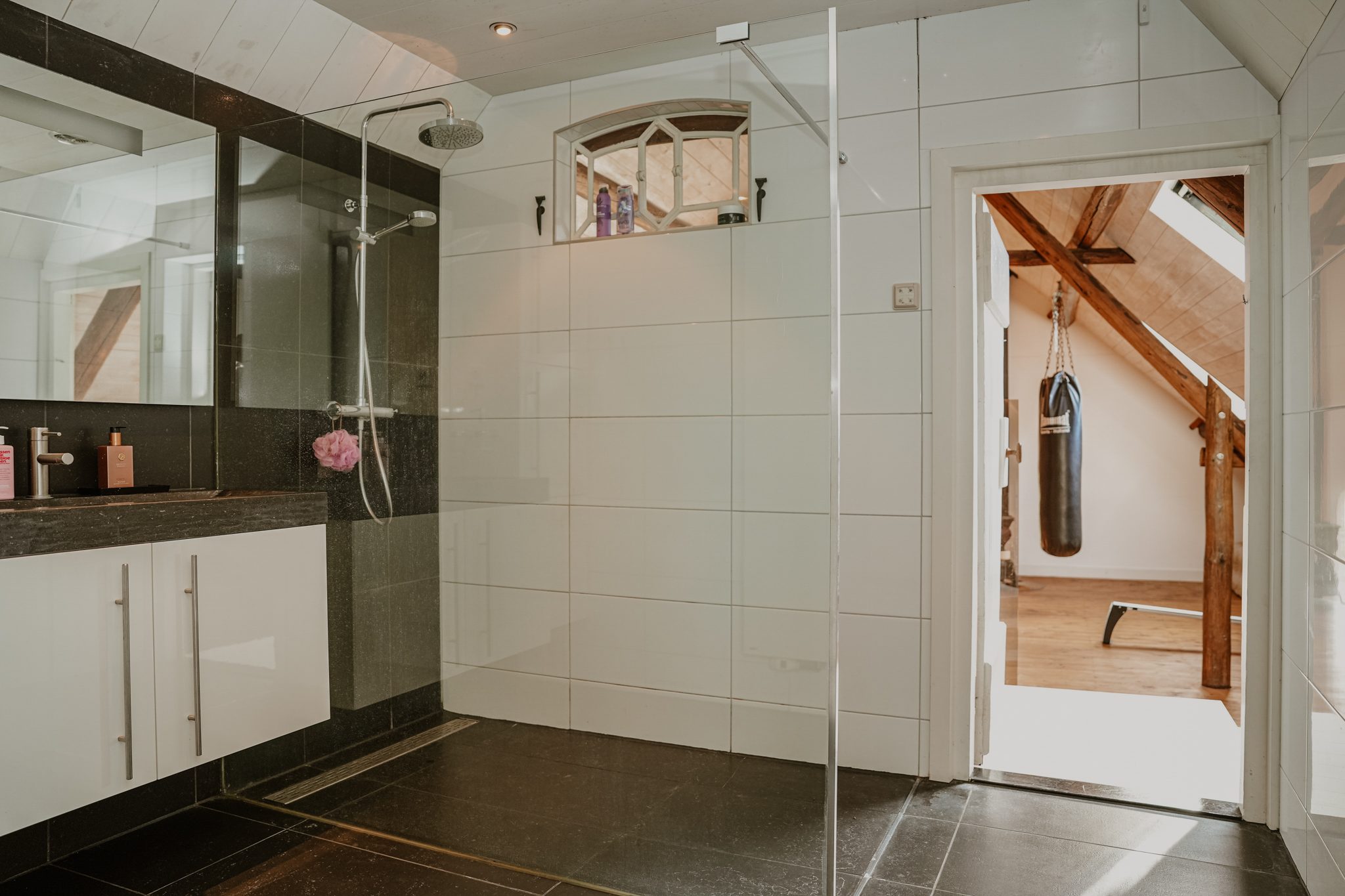 In het achterhuis bevindt zich onder de geïsoleerde kap een 4e slaapkamer die momenteel in gebruik is als sportkamer. In de kamer bevindt zich een grote traditionele sauna en een trap die uitkomt in de eetkamer. Aan de overloop is een 2e badkamer met grote inloopdouche en luxe wastafelmeubel.