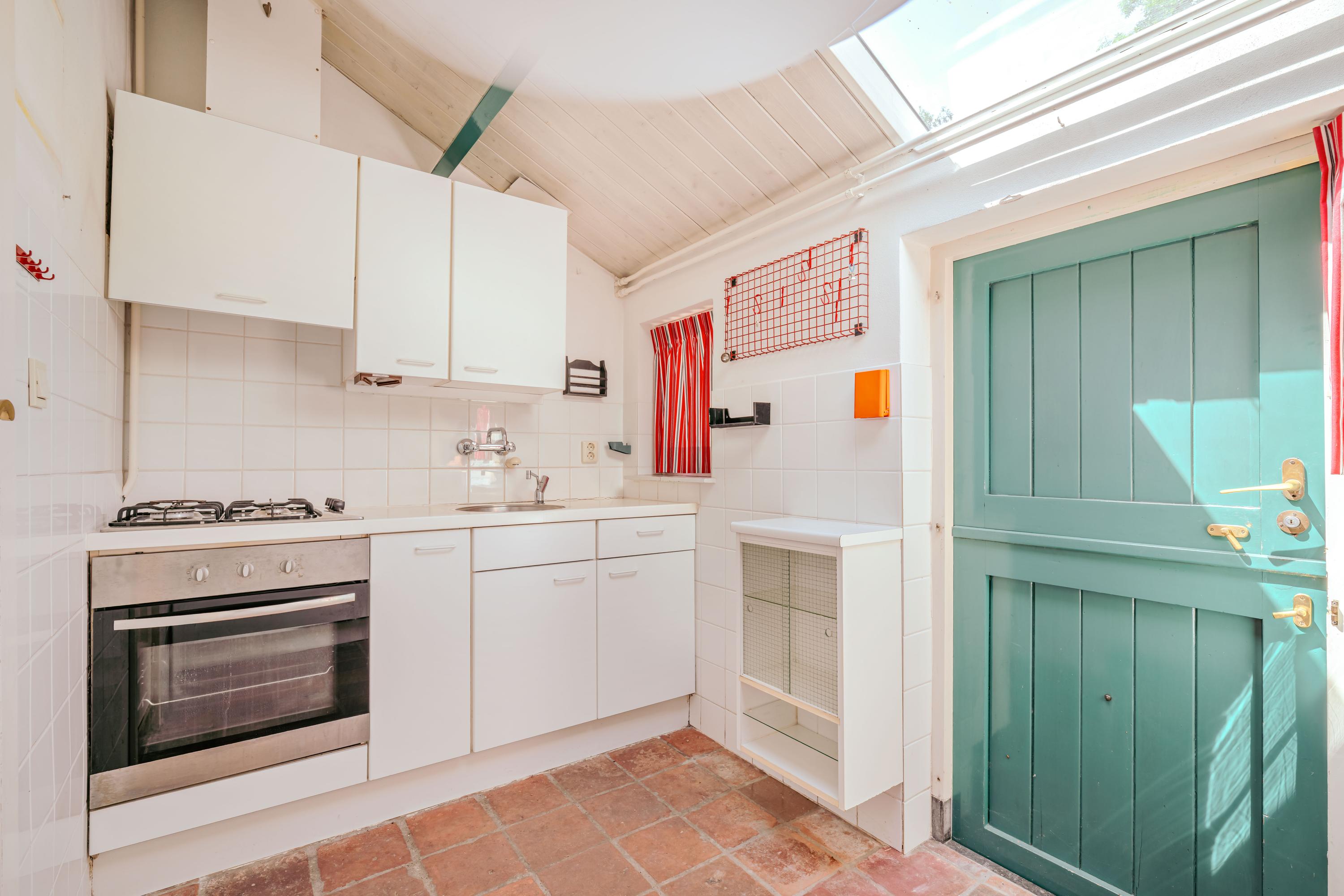 From the courtyard, the main house can be accessed through two doors. The left door opens into the kitchen, where ample daylight enters through skylights. The kitchen is fitted with a sink, four-burner gas hob, oven, and various cabinets and drawers. The central heating boiler and washing machine connection are also located here. Adjoining the kitchen is the living and dining room at the front of the house, featuring wooden beams, built-in cupboards, and windows overlooking the garden. The fireplace, wooden finishes, and view of the dike give the room a warm and inviting atmosphere. Through the hallway with a skylight, you reach the separate toilet with washbasin and the bathroom, which includes a bathtub with shower and a washbasin unit.
