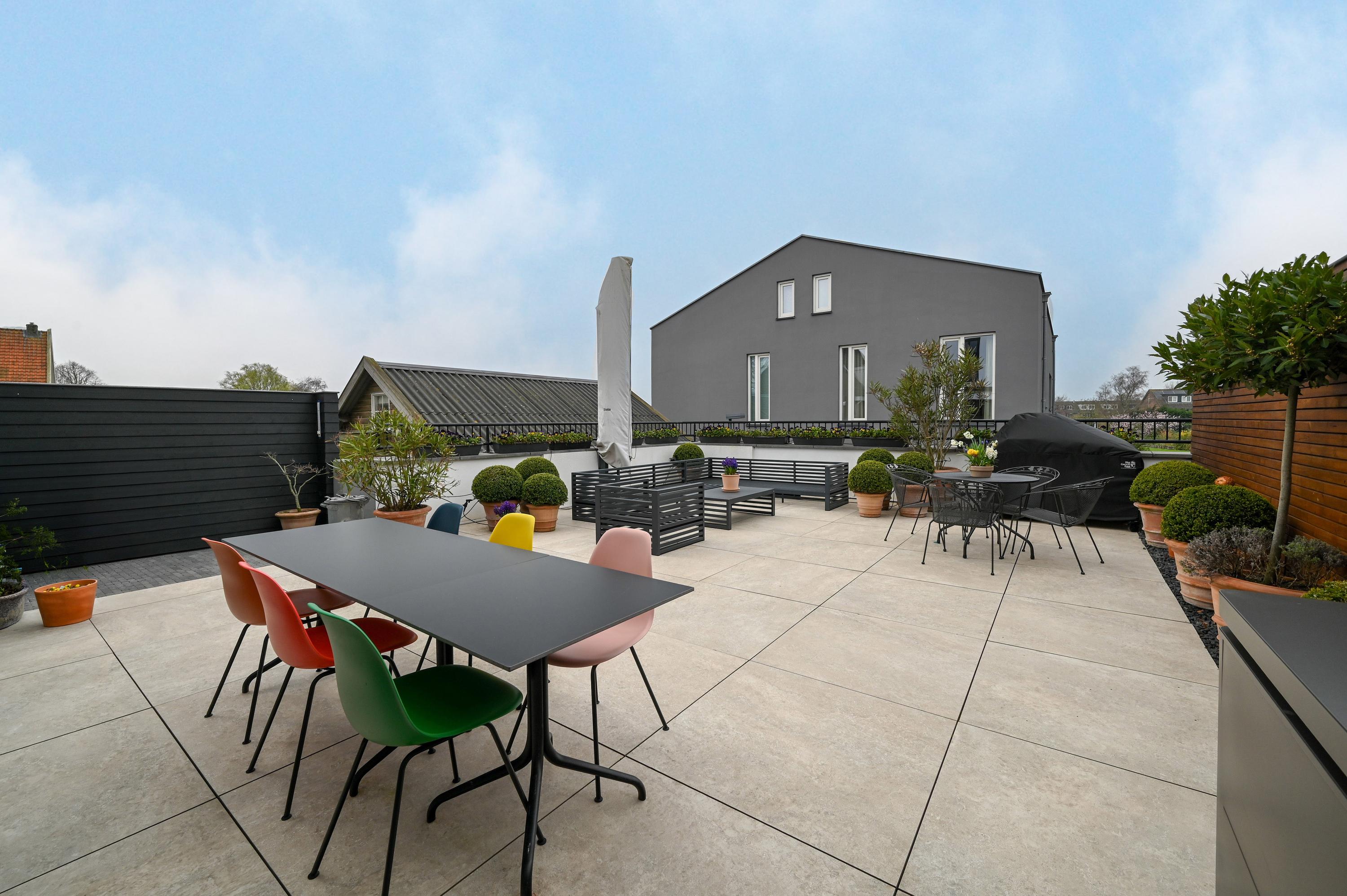The terrace is fully tiled with large, light-colored tiles and bordered by well-maintained planting. Subtle garden lighting creates a stylish and inviting outdoor space, perfect for enjoying the outdoors both during the day and in the evening. An electric awning provides shade when needed.