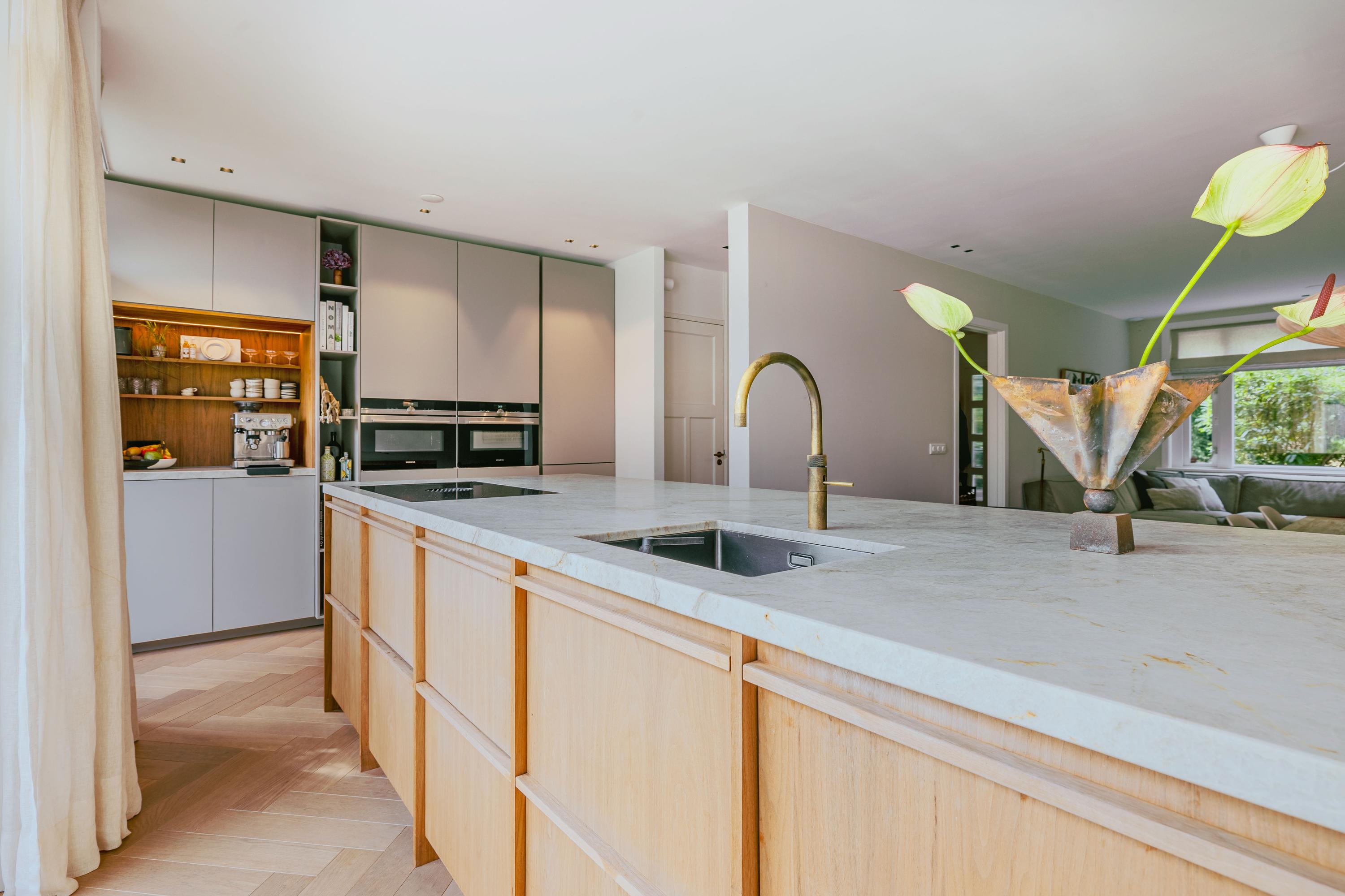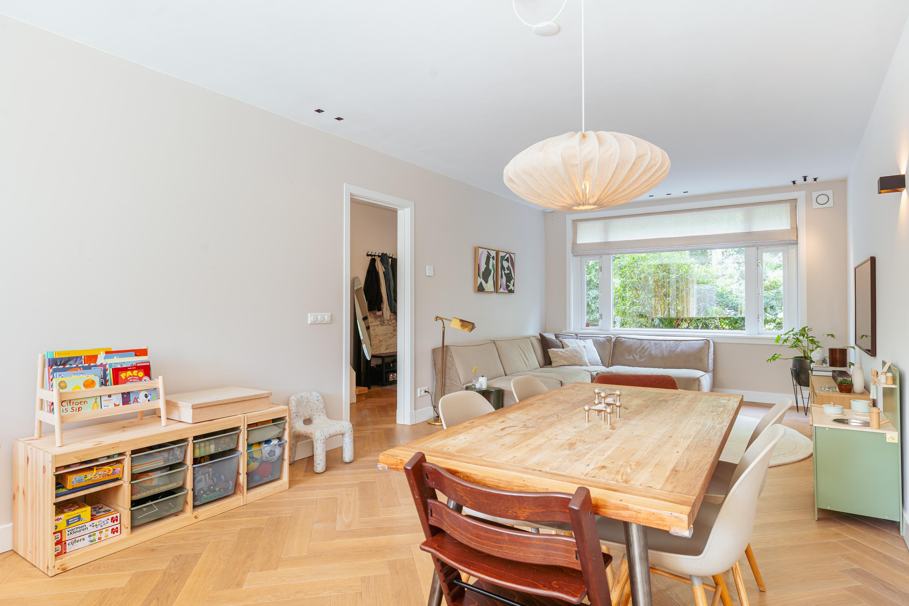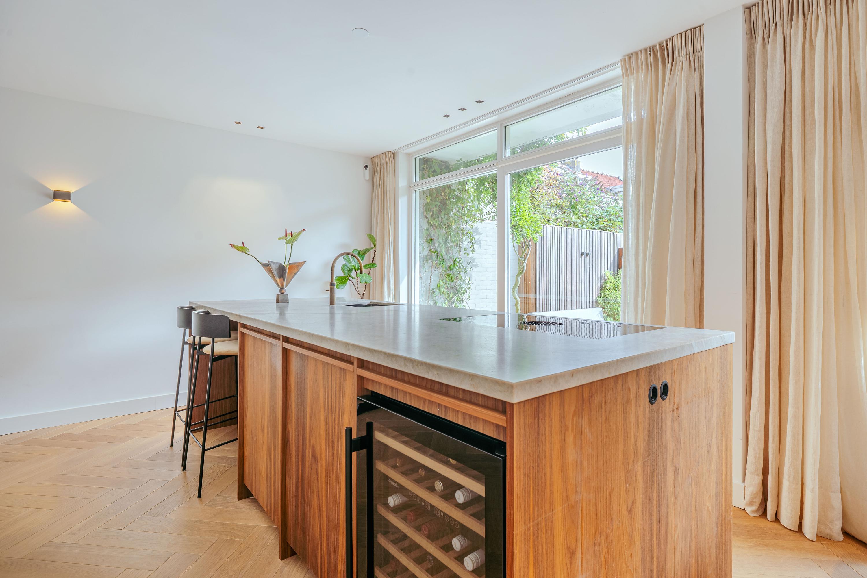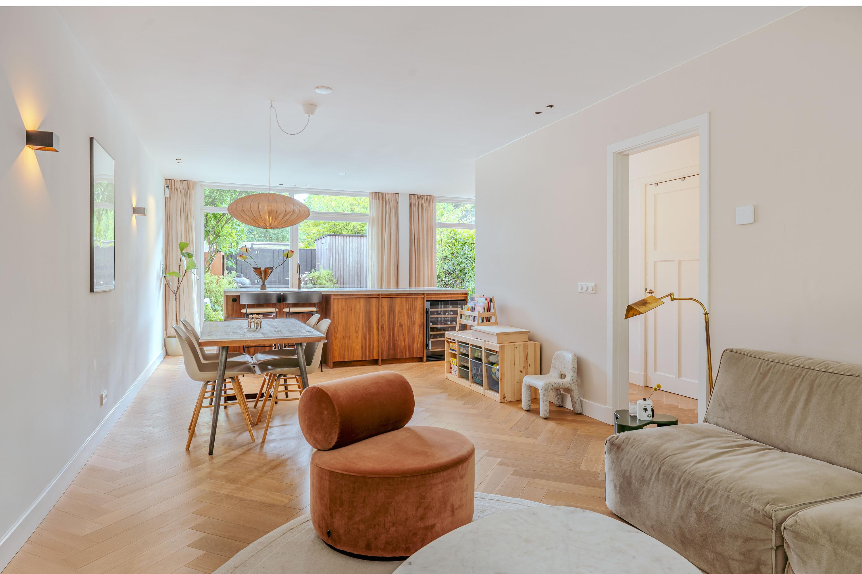 Family home Amstelveen is situated along the prized Bos en Vaartlaan, providing 146 m² of entirely renovated living space completed in 2021. This five-bedroom residence marries modern comfort with understated luxury, offering city access and a tranquil green setting. The property welcomes with a private front garden leading into an efficient hallway, where natural oak herringbone floors with partial underfloor heating introduce a sense of warmth and rhythm throughout the main level. Here, the spacious living area flows into a refined kitchen centered around a quartzite island, fully appointed with high-end appliances and a climate-controlled wine cabinet for ease in everyday living.