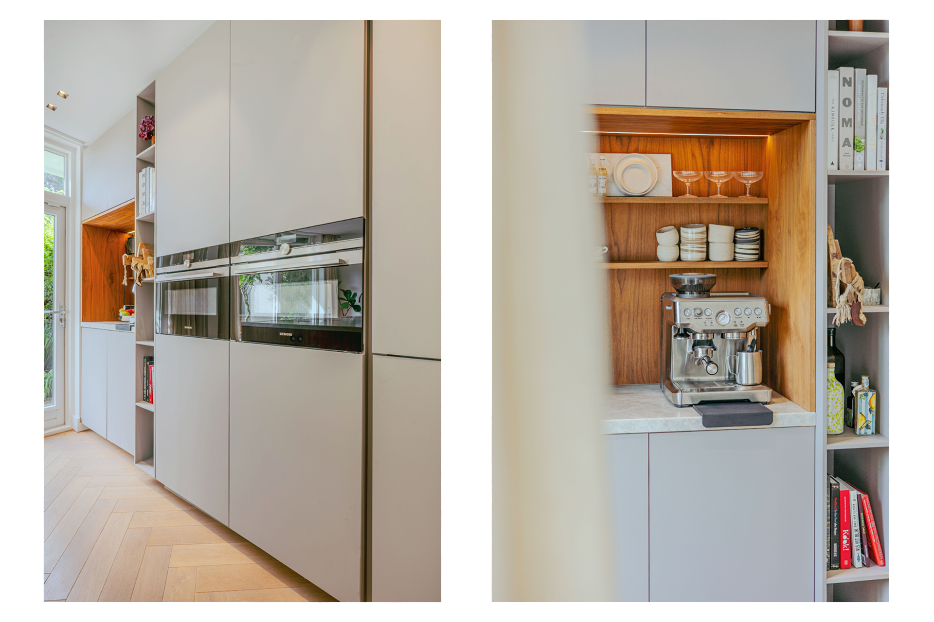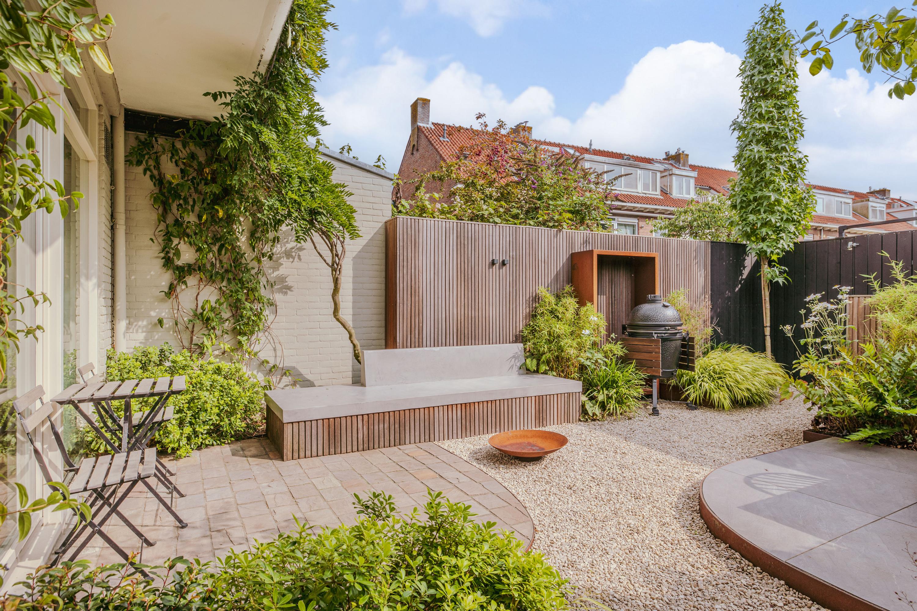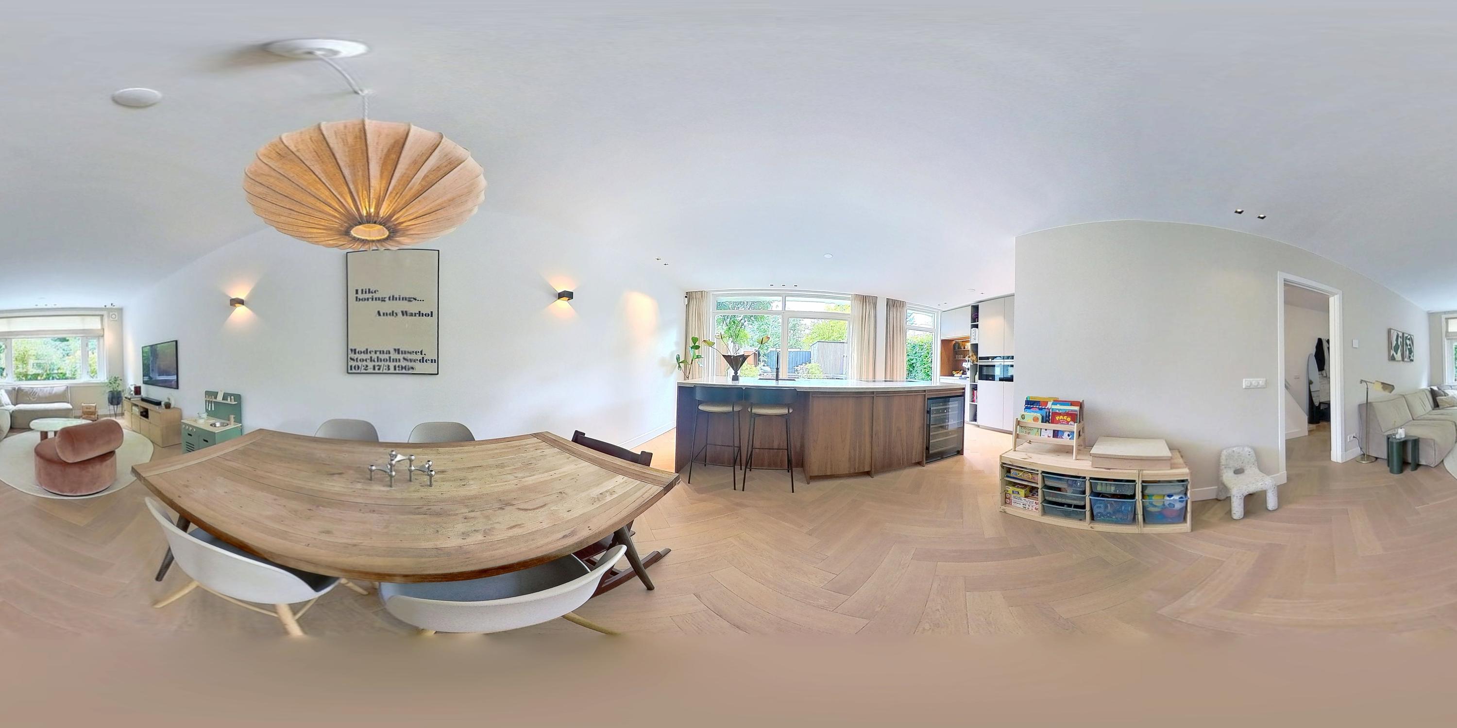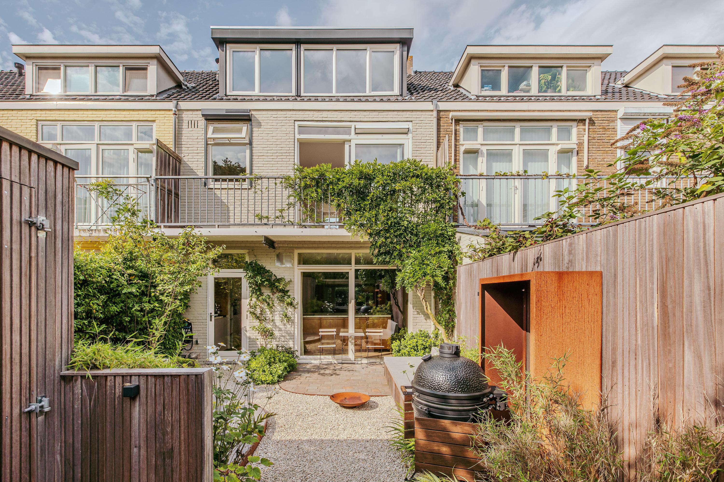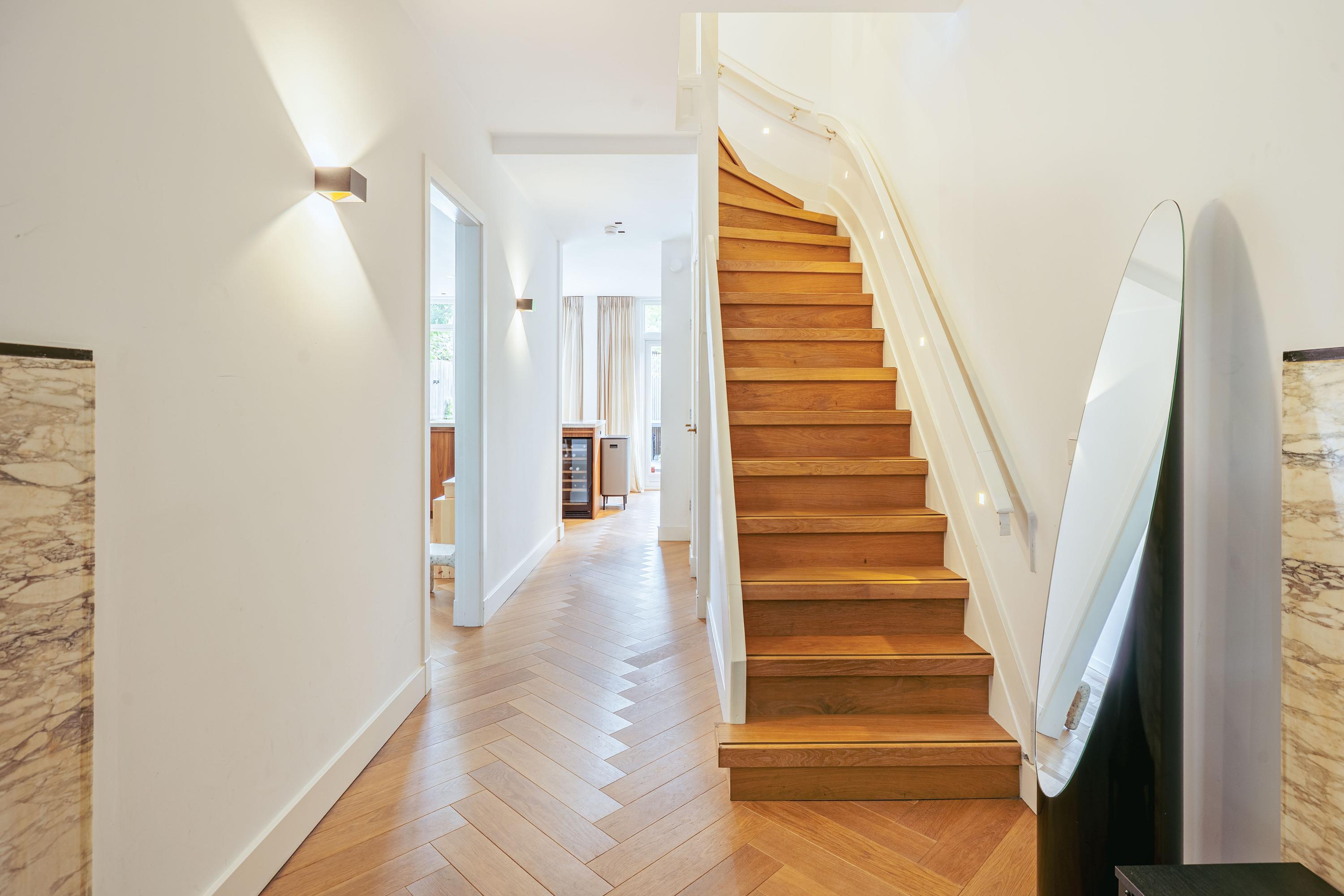 Family home Amstelveen is situated along the prized Bos en Vaartlaan, providing 146 m² of entirely renovated living space completed in 2021. This five-bedroom residence marries modern comfort with understated luxury, offering city access and a tranquil green setting. The property welcomes with a private front garden leading into an efficient hallway, where natural oak herringbone floors with partial underfloor heating introduce a sense of warmth and rhythm throughout the main level. Here, the spacious living area flows into a refined kitchen centered around a quartzite island, fully appointed with high-end appliances and a climate-controlled wine cabinet for ease in everyday living.