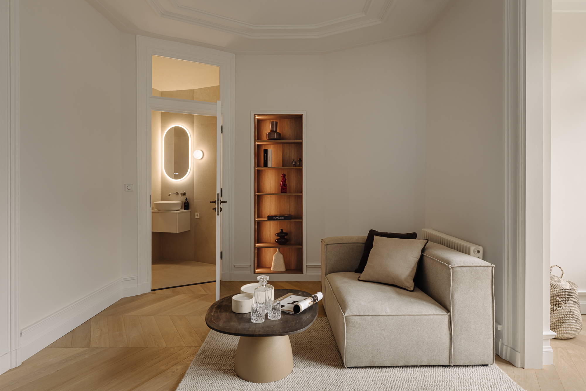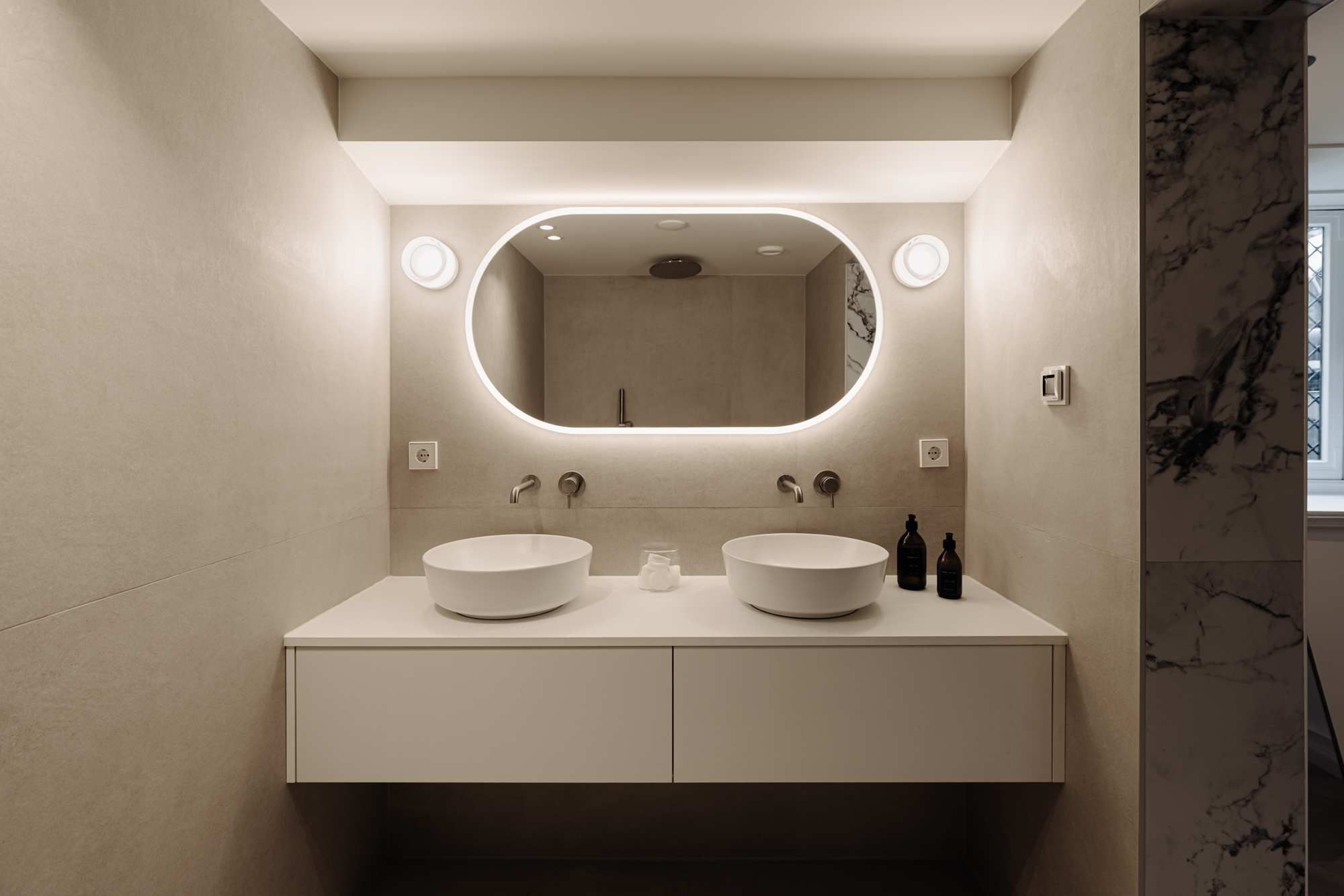 The lower ground floor is arranged as a comfortable sleeping level. At the front is the spacious master bedroom with built-in wardrobes and an en-suite bathroom featuring a walk-in rain shower and double washbasin. At the rear is the second large bedroom, also with its own bathroom equipped with a walk-in shower and washbasin. From this room, there is access to the attractively landscaped rear garden of approximately 18 m². A separate toilet is accessible from the hallway. In addition, the landing provides access to an internal storage room with connections for a washing machine and dryer.