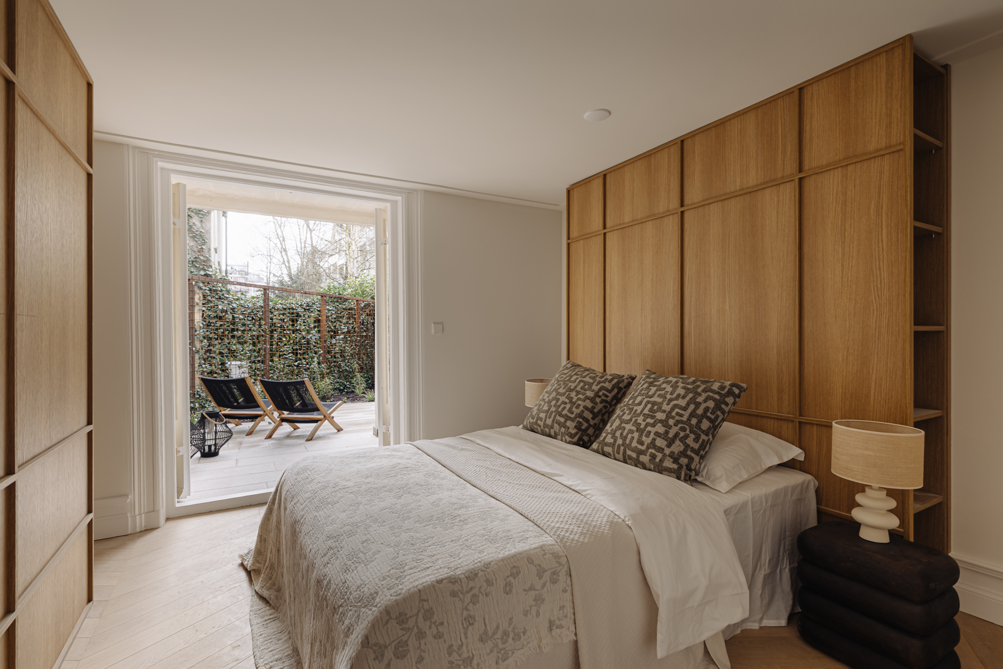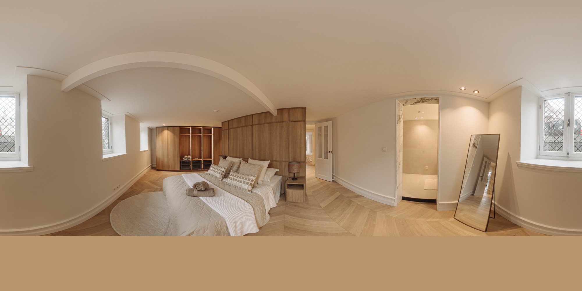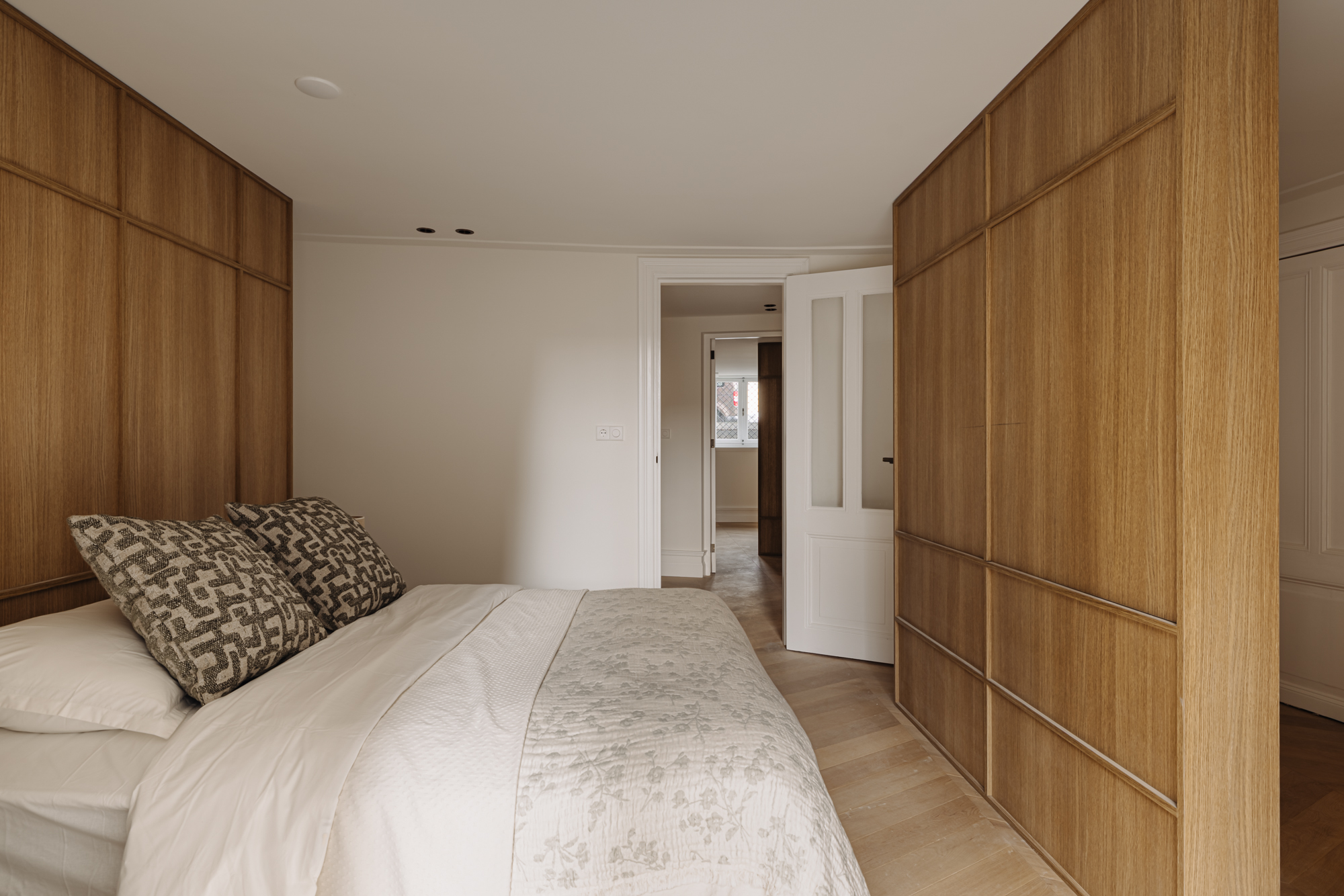 The monumental staircase leads to the landing of the first floor. At the rear is the classic dining room with access to a second internal balcony. This balcony features a folding glass façade, seamlessly connecting indoor and outdoor living. Thanks to its favourable position, you can enjoy the sun here well into the evening. At the front is the spacious kitchen-diner with cooking island—without doubt the centrepiece of the home. The kitchen is finished in beautiful dark oak and complemented by an elegant composite worktop. It is equipped with high-end Siemens StudioLine appliances, a Bora cooktop, and a Quooker tap. The island also features a welcoming bar area. With a width of nearly 7 metres and three large windows, the kitchen enjoys wonderful open views towards Jan Luijkenstraat. From both the kitchen and the landing, the fourth (bed)room can be accessed, which is ideal as a home office or study.