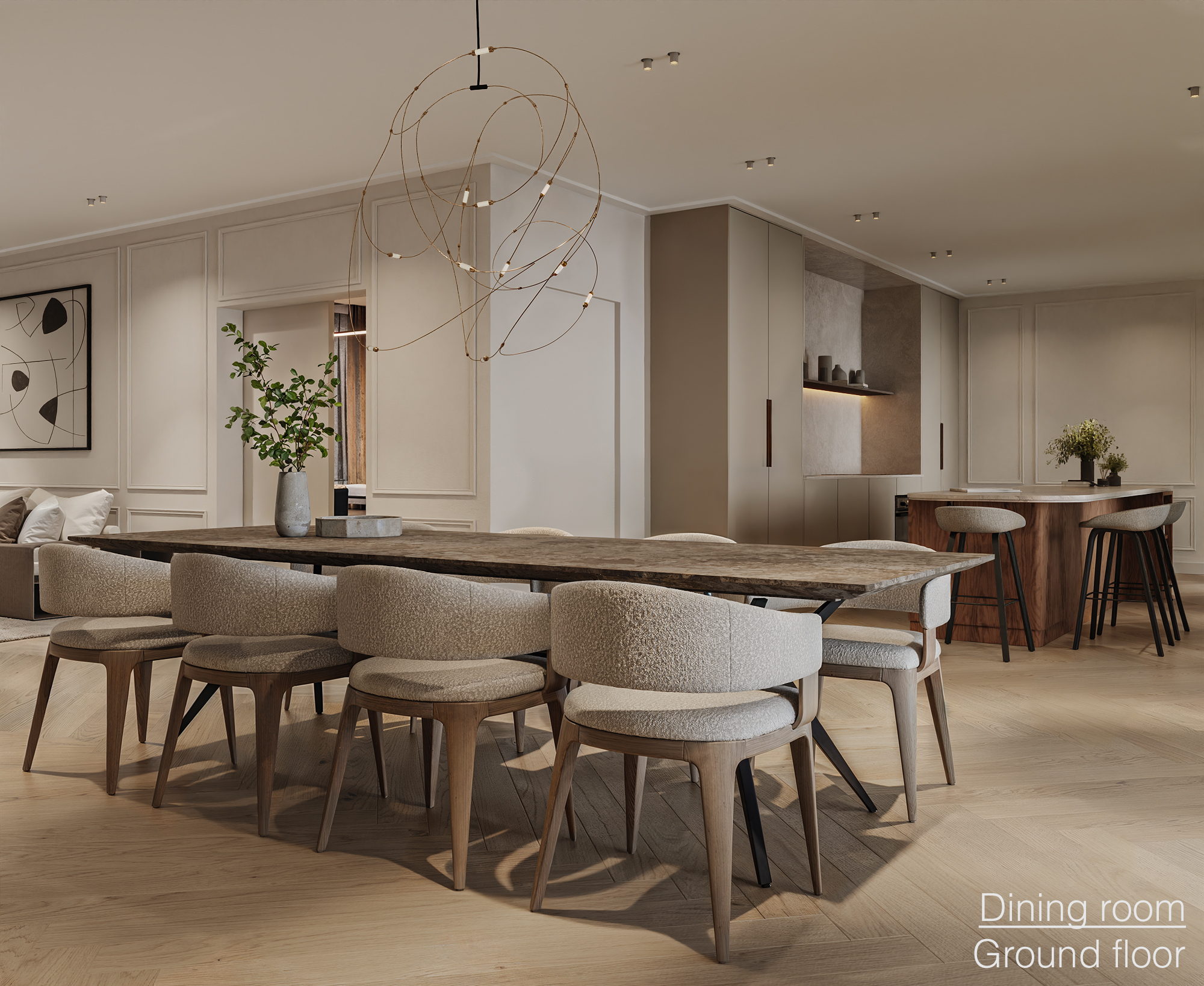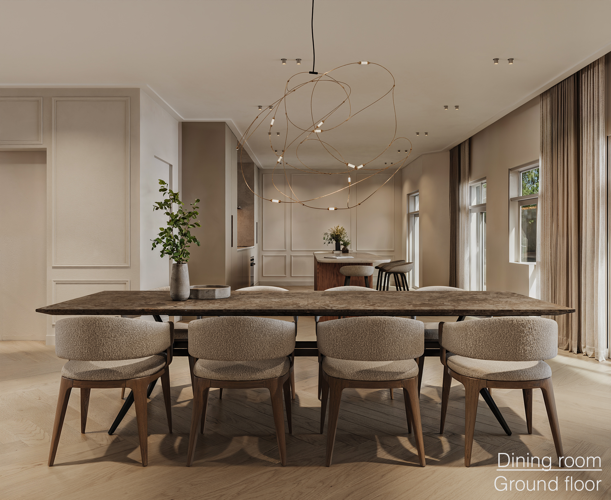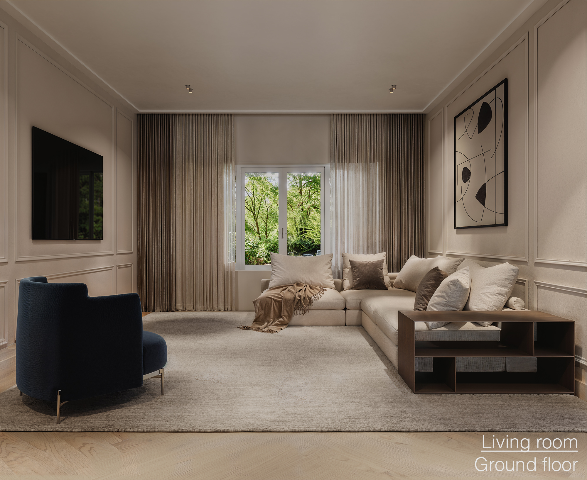 On the right side is the generous, elongated through living room that stretches from the front to the rear of the home. Thanks to the large windows on both sides, the space is flooded with natural daylight, creating a bright and pleasant living environment.