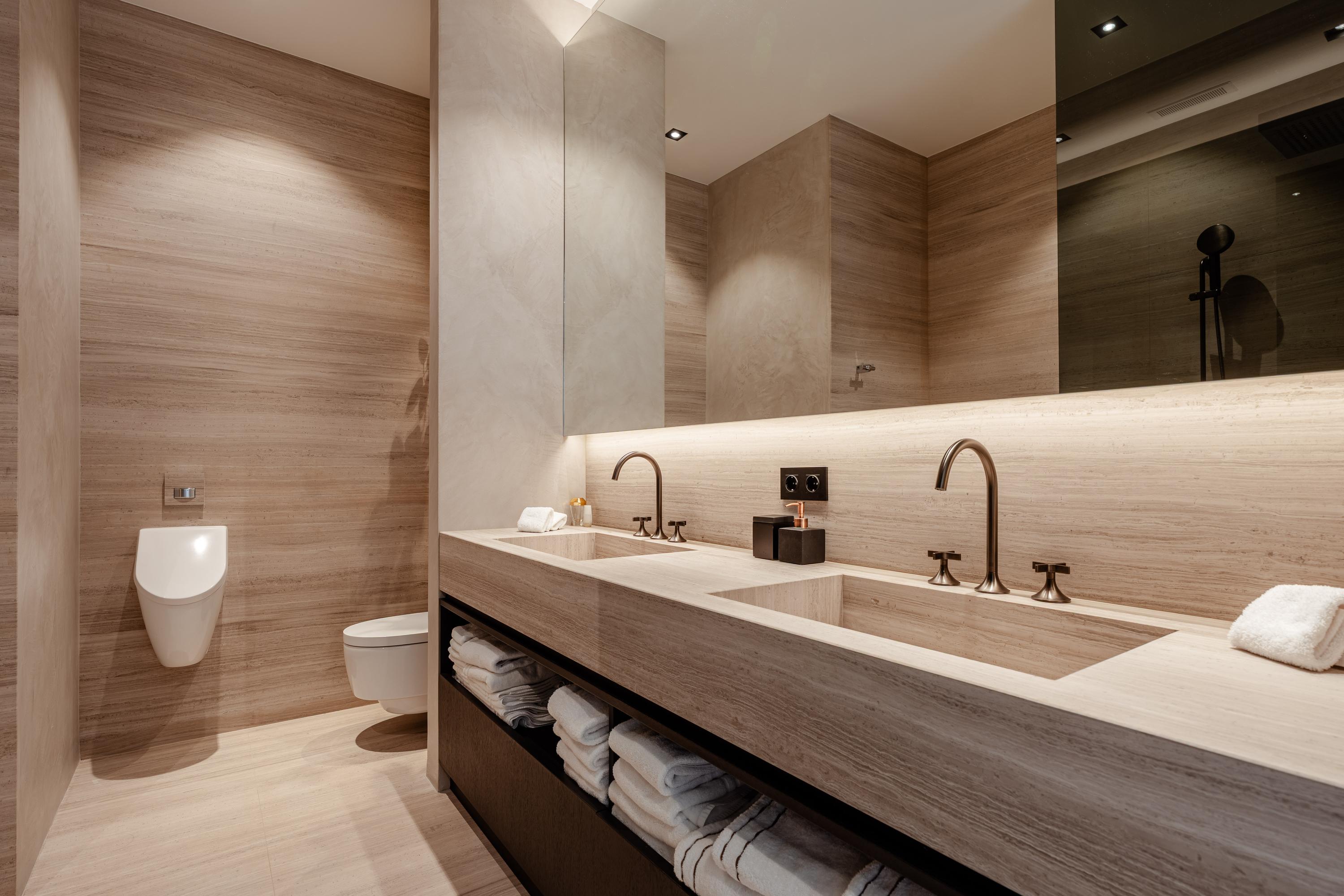 The apartment offers three bedrooms, each furnished with luxury Hästens beds. The master suite includes a private walk-in closet and a luxurious bathroom finished in marble and mosaic, featuring a bathtub, double washbasin, walk-in shower, and separate toilet. The second bathroom, designed in warm earthy tones, is also fully equipped and smartly laid out. Throughout the apartment lies a beautiful wooden floor, combined with underfloor and ceiling heating and cooling, recessed lighting, and electric sun blinds. A private storage room, as well as a technical and laundry room, are also included.
