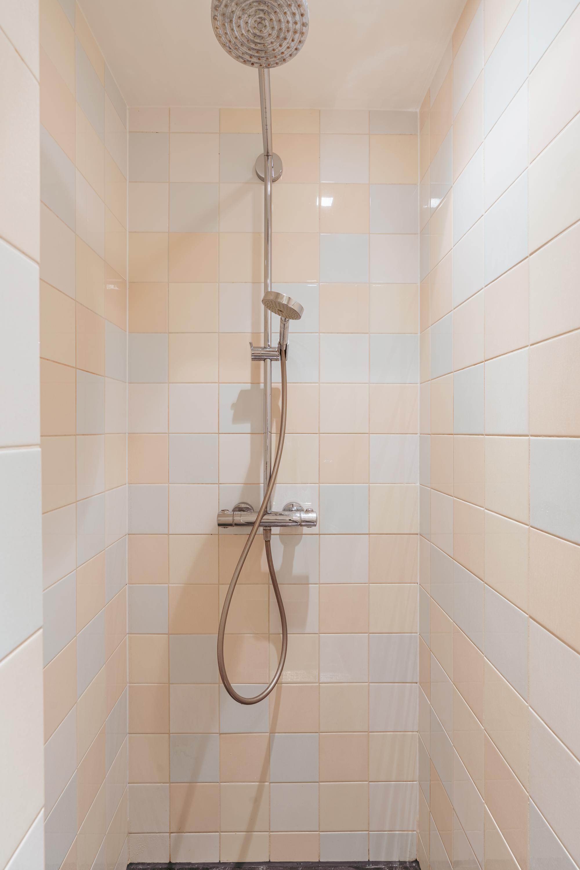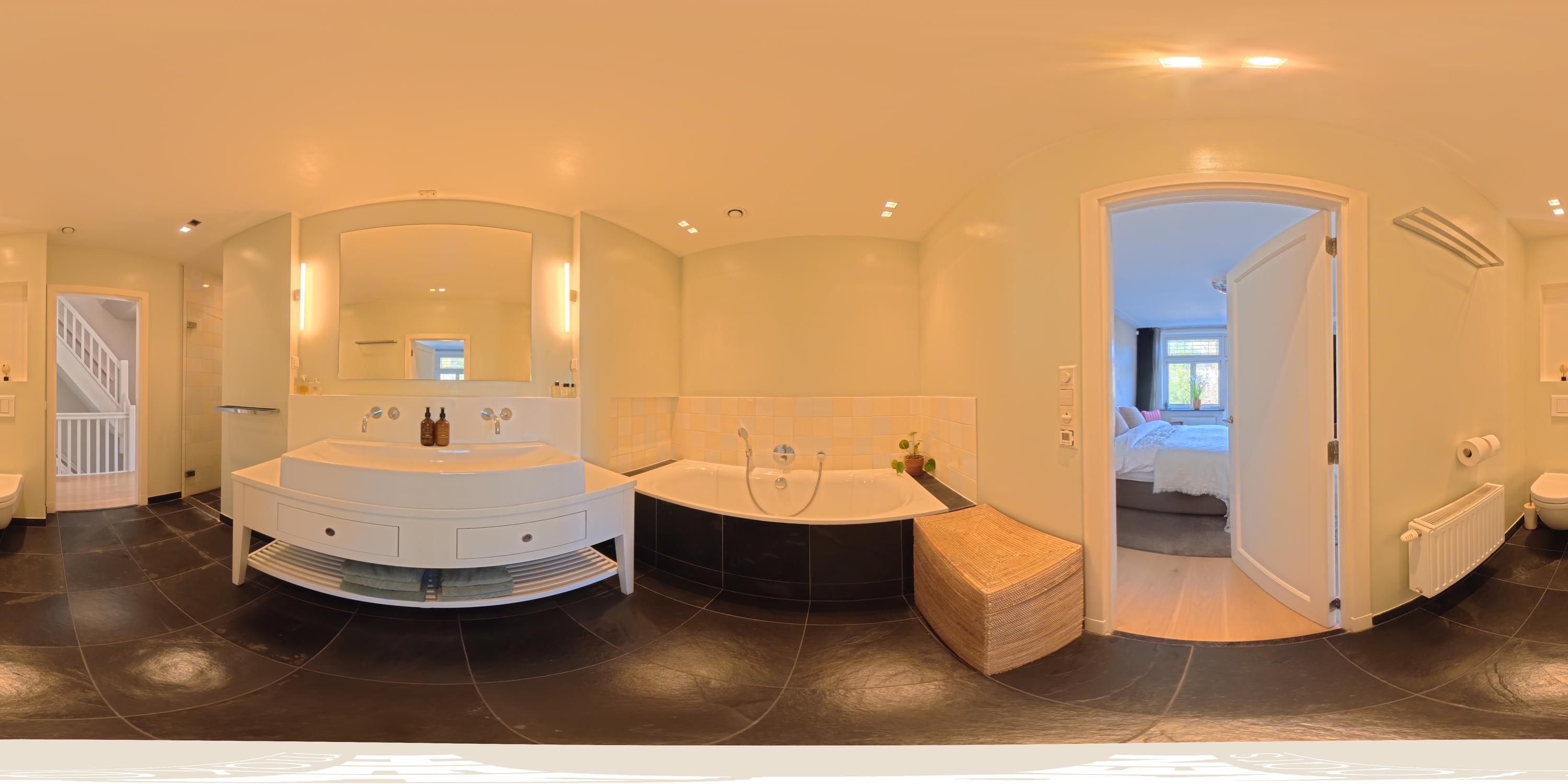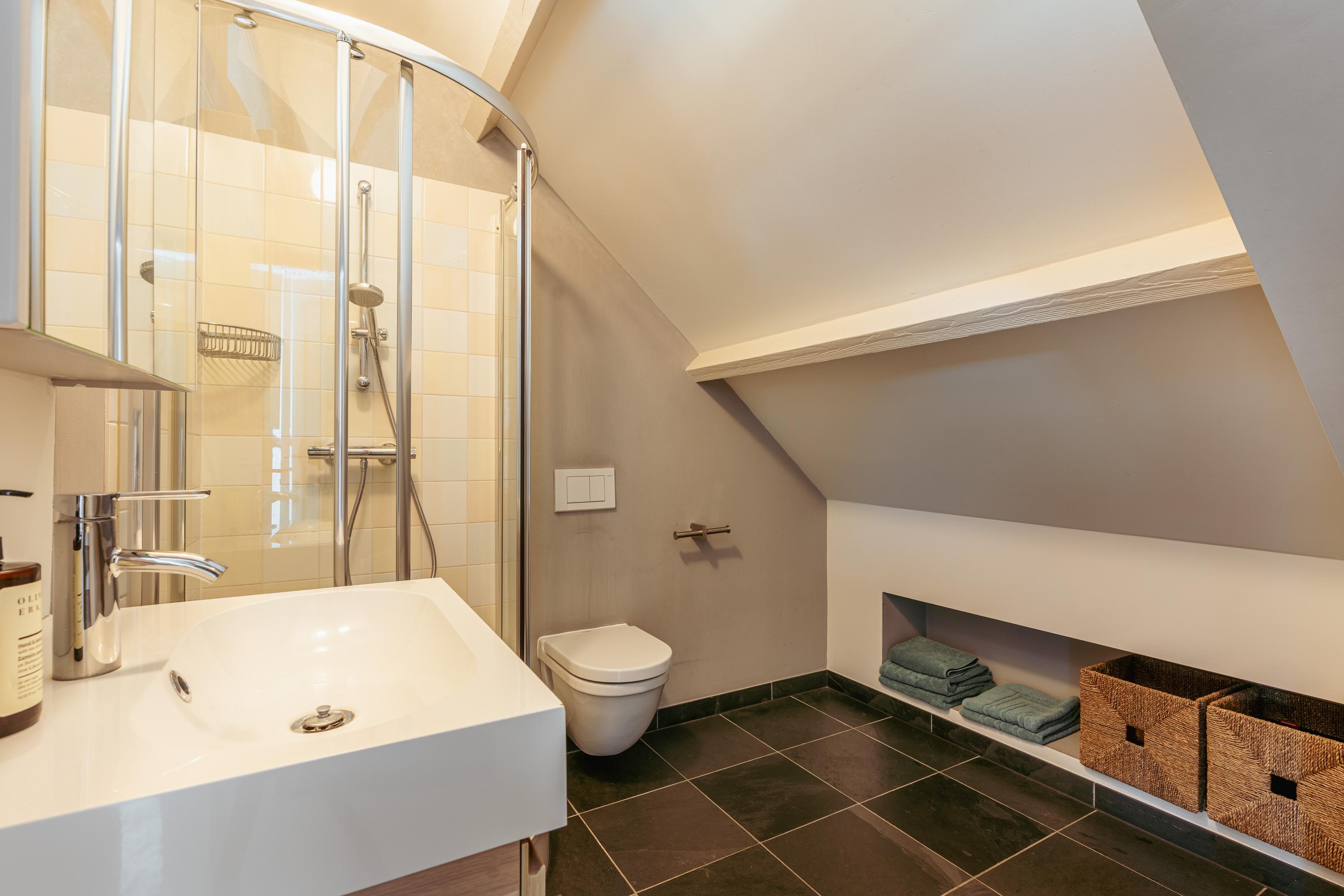 Landing with access to the fifth bedroom of this family home. The top floor boasts an impressive ceiling height and multiple windows, creating a bright and spacious atmosphere. The en-suite bathroom is fitted with a walk-in shower, washbasin with vanity unit, and toilet. A practical storage room is also accessible from the landing. This floor is highly suitable as a home office, guest room, or studio.
