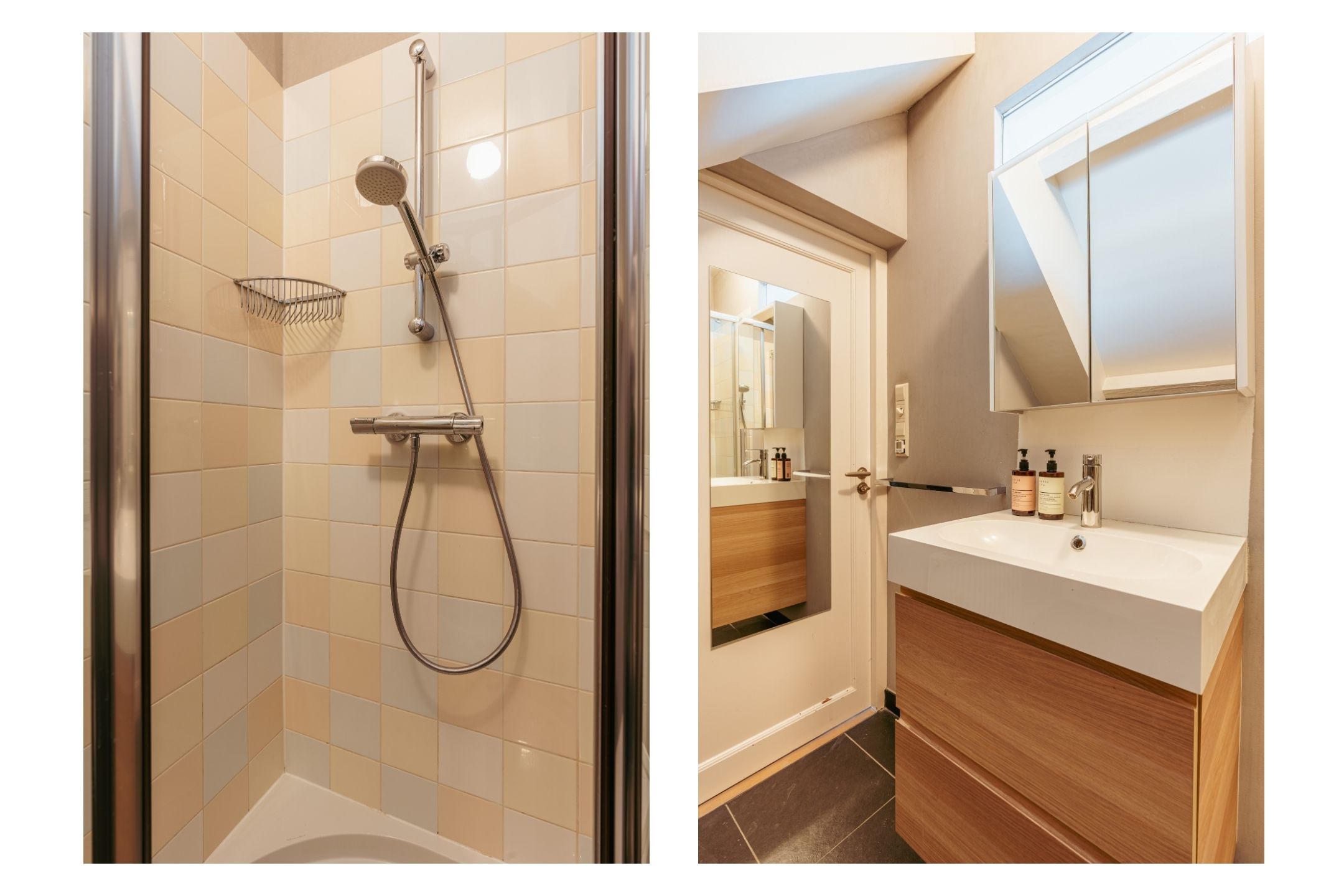 This floor also features a separate laundry room with connections for a washing machine and dryer, as well as additional storage space. The balcony is also accessible from this room. Centrally located is the bathroom, equipped with a triple washbasin with vanity unit and a walk-in shower. Additionally, there is a separate toilet with washbasin.
