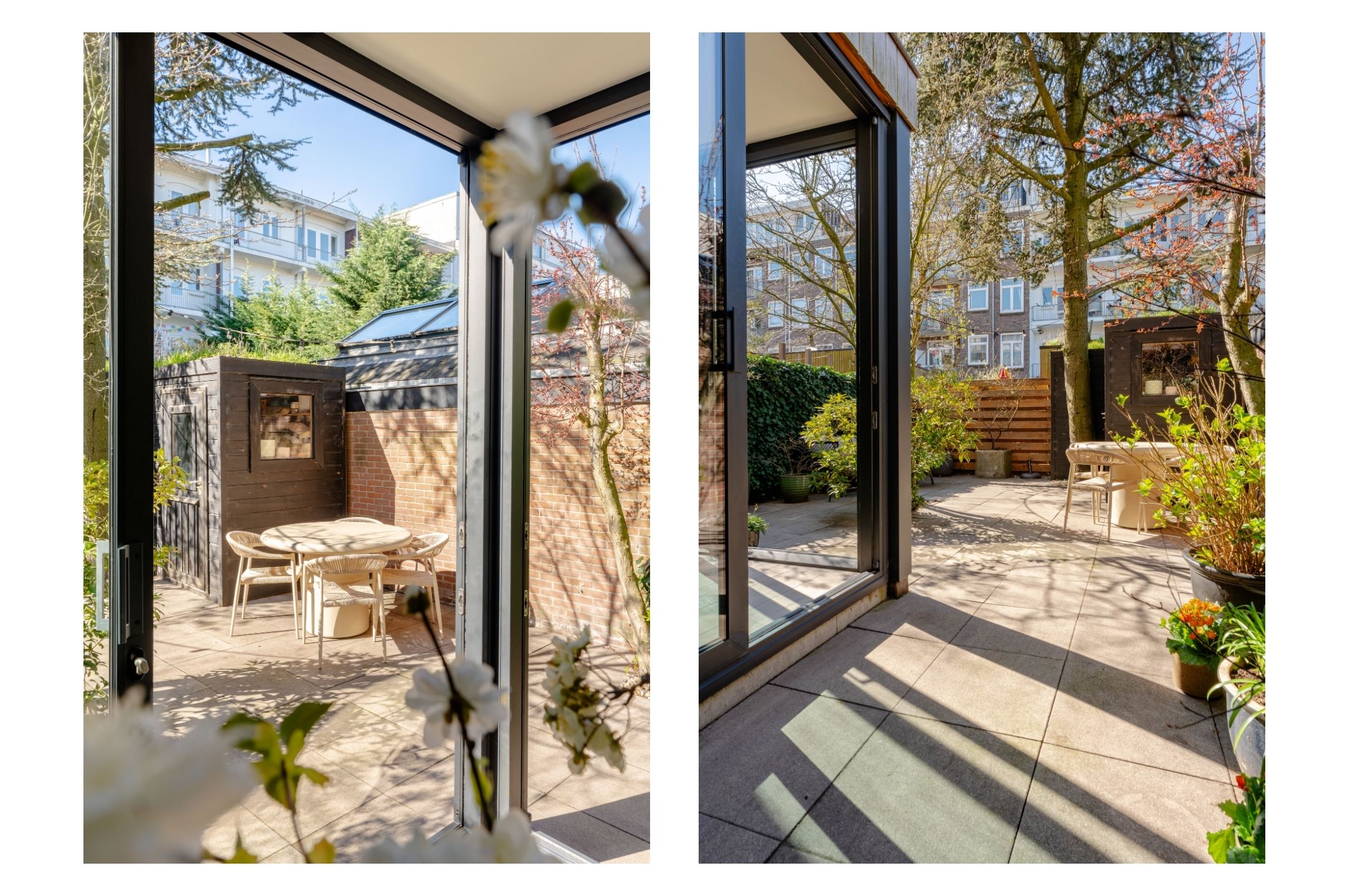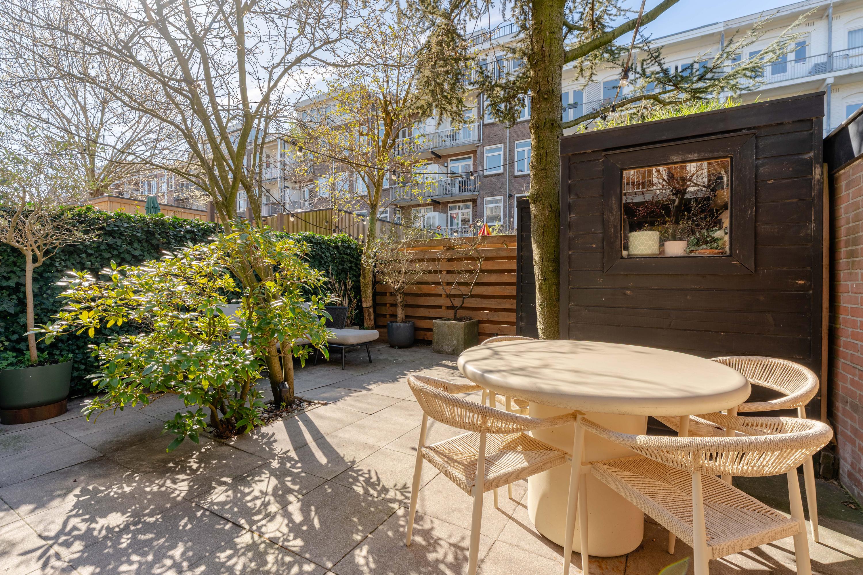 The property features a beautifully landscaped and sunny southwest-facing garden, allowing for plenty of sunshine throughout the afternoon and evening. The garden offers multiple seating areas, providing ample space for both a dining table and a lounge area.