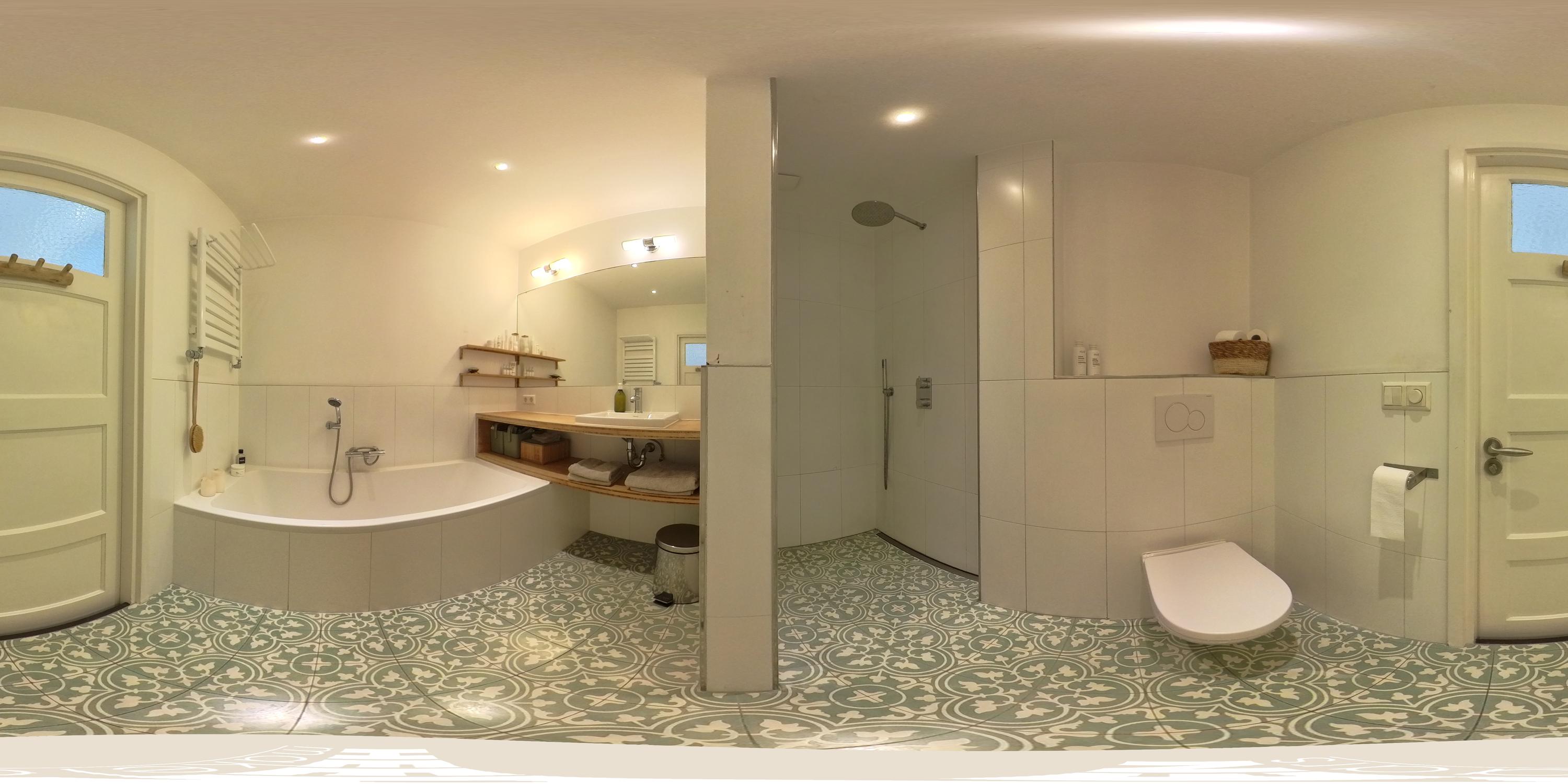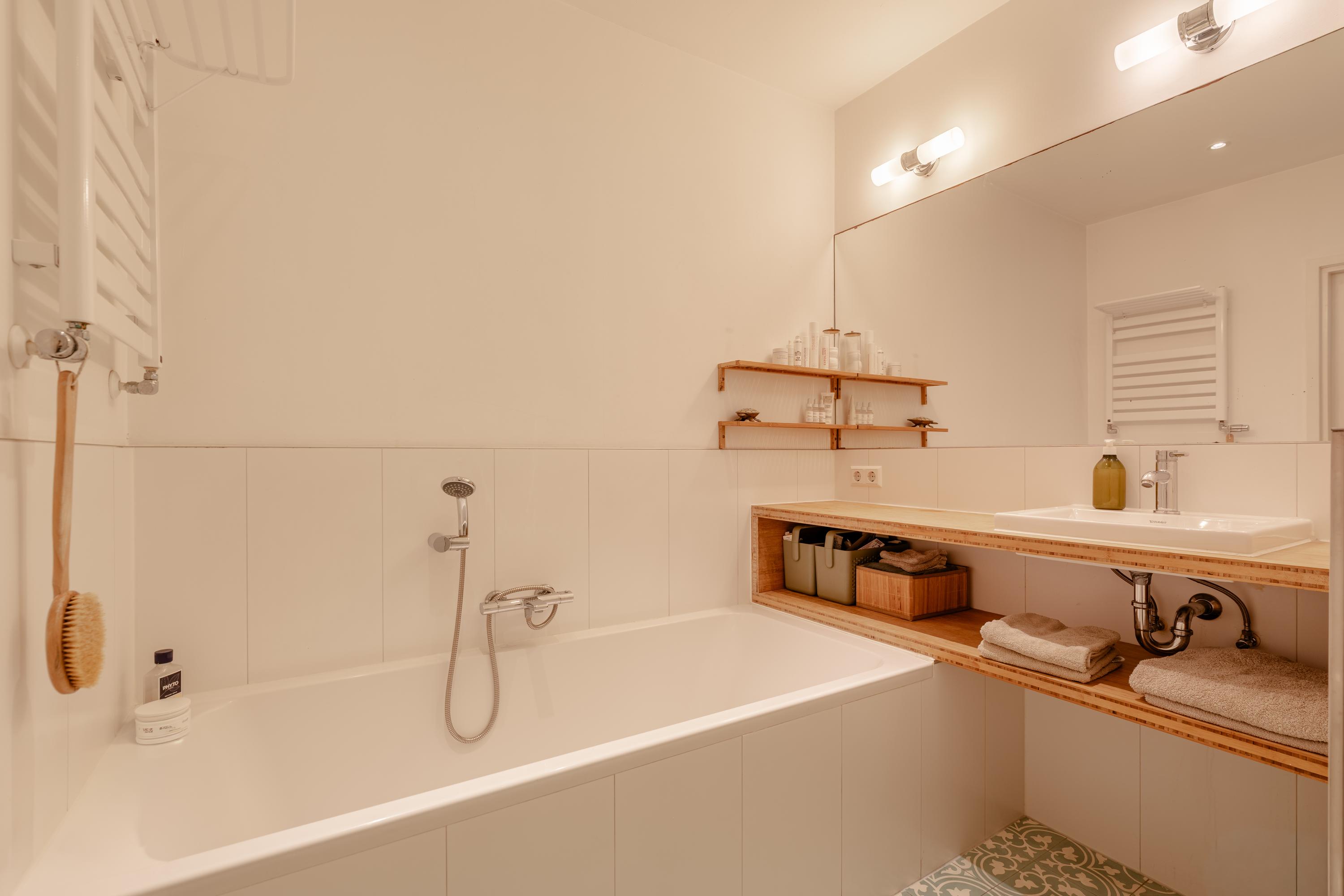 The modern bathroom is located on the landing and is finished in a calm and well-maintained style. It includes a bathtub, walk-in shower, toilet, and a stylish vanity unit with washbasin.