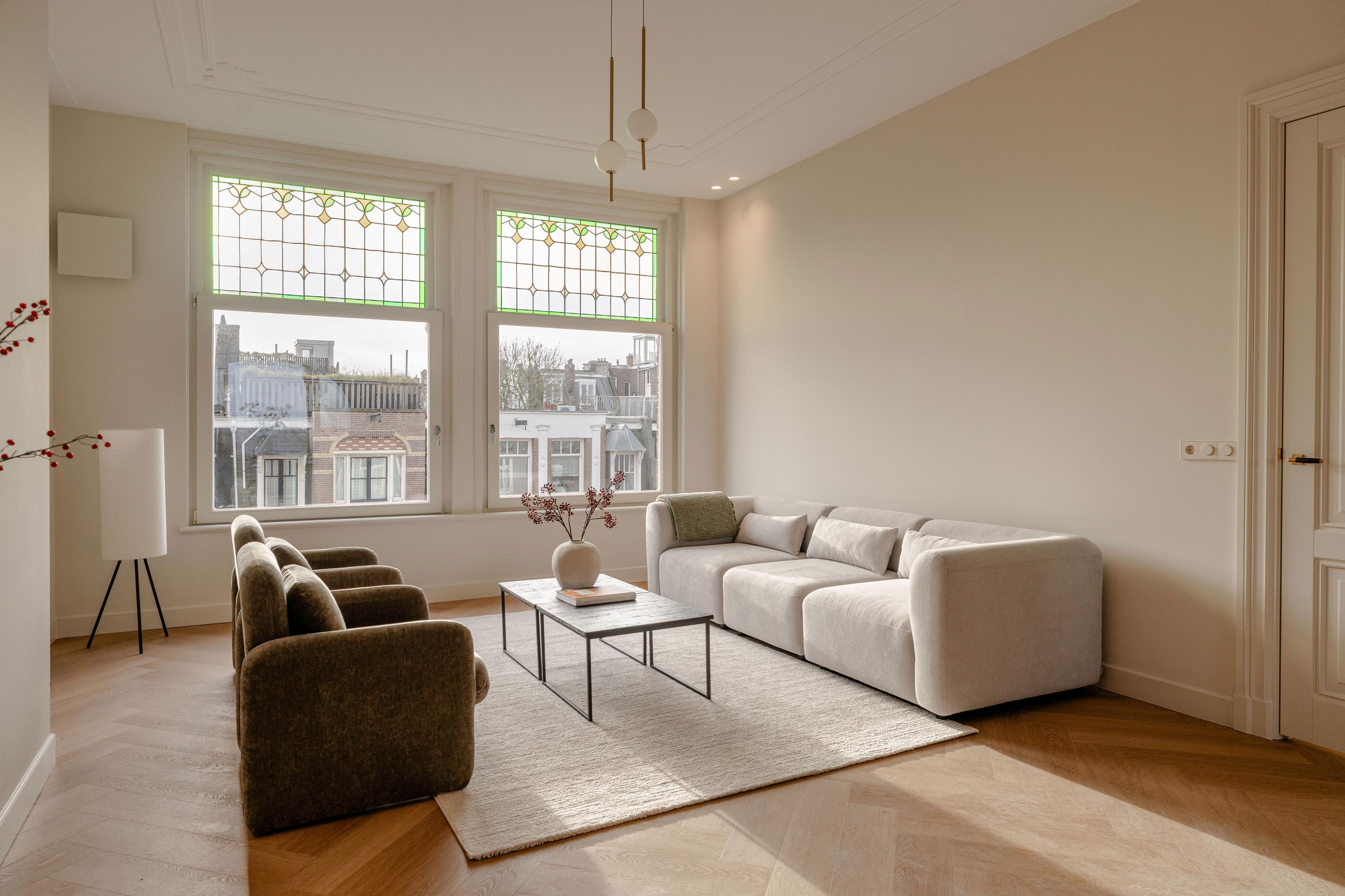 Located on the sought-after Koninginneweg in Amsterdam Oud-Zuid, this elegantly finished apartment of 87.7 m² is situated on the third floor. The property is distinguished by a generous open-plan living area, high ceilings and a quiet position with green views at the rear. With two bedrooms, two bathrooms and a covered balcony, this is a refined and comfortable home in close proximity to the Vondelpark and the Museum Quarter.
