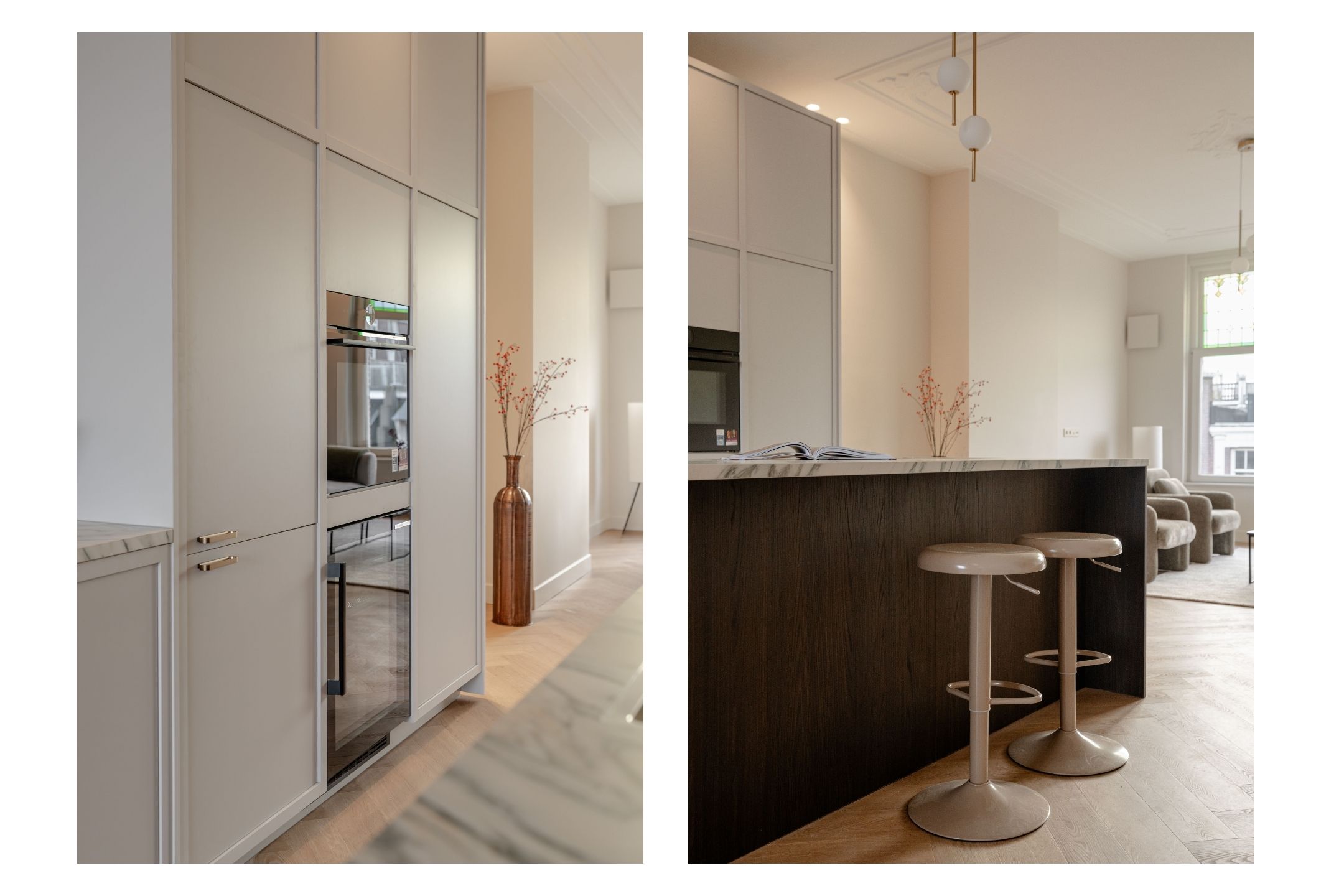 This luxurious apartment is located on the third floor and is characterised by a spacious and open layout, with large windows at both the front and rear providing pleasant natural light throughout the day. The apartment is finished to a high standard and offers a comfortable living environment with a calm and refined atmosphere. The living room is situated at the front of the apartment and features a ceiling height of approximately 3.07 metres. Together with the kitchen and dining area, it forms one generous open-plan living space. The luxurious kitchen is centrally positioned within the apartment and is designed around a spacious cooking and sink island, fitted with an induction hob, sink and Quooker. In addition, the kitchen is equipped with a refrigerator, freezer, combi oven, climate cabinet and ample cupboard space. The island also functions as a comfortable bar area. At the rear of the apartment is the covered balcony, offering attractive views over the green gardens at the back and providing a peaceful outdoor space to relax. At the front of the apartment, the hallway provides access to the first bedroom, the separate toilet, the laundry/storage room and the first bathroom. This bathroom is fitted with a walk-in shower and a double washbasin with vanity unit. The second bedroom is located at the rear of the apartment and features fixed wardrobe space and an en-suite bathroom, equipped with a walk-in shower and a washbasin with vanity unit.