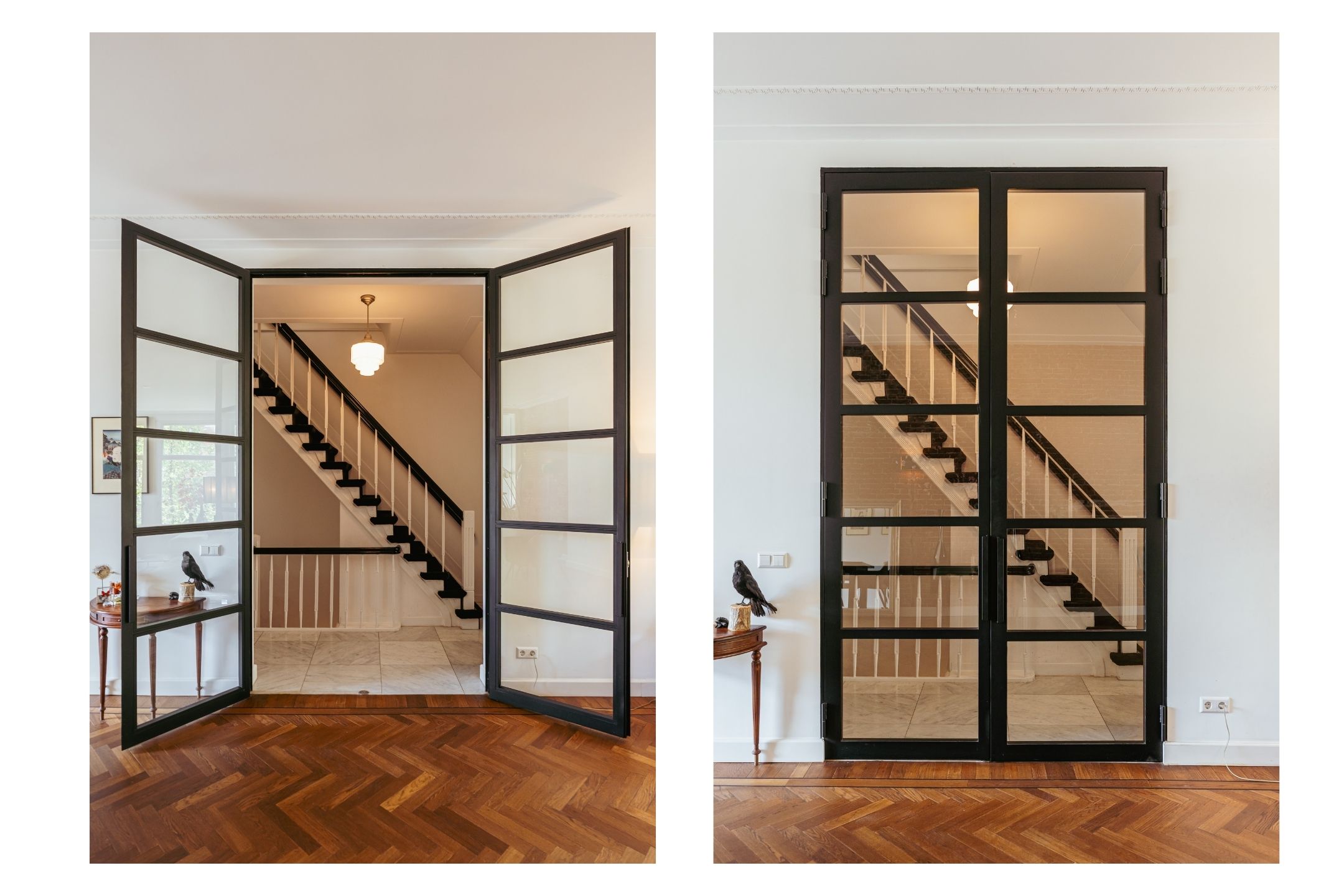 The property features its own private entrance at street level. Upon entering, both the floor and part of the walls are finished with elegant marble. Through the vestibule you reach the central hall, also laid with marble flooring. Refined steel-framed glass doors provide access to the living room, enhancing the elegant character of this floor.