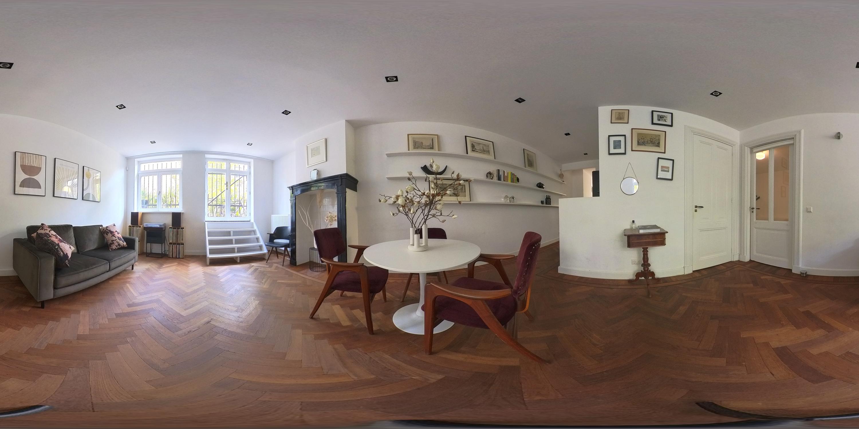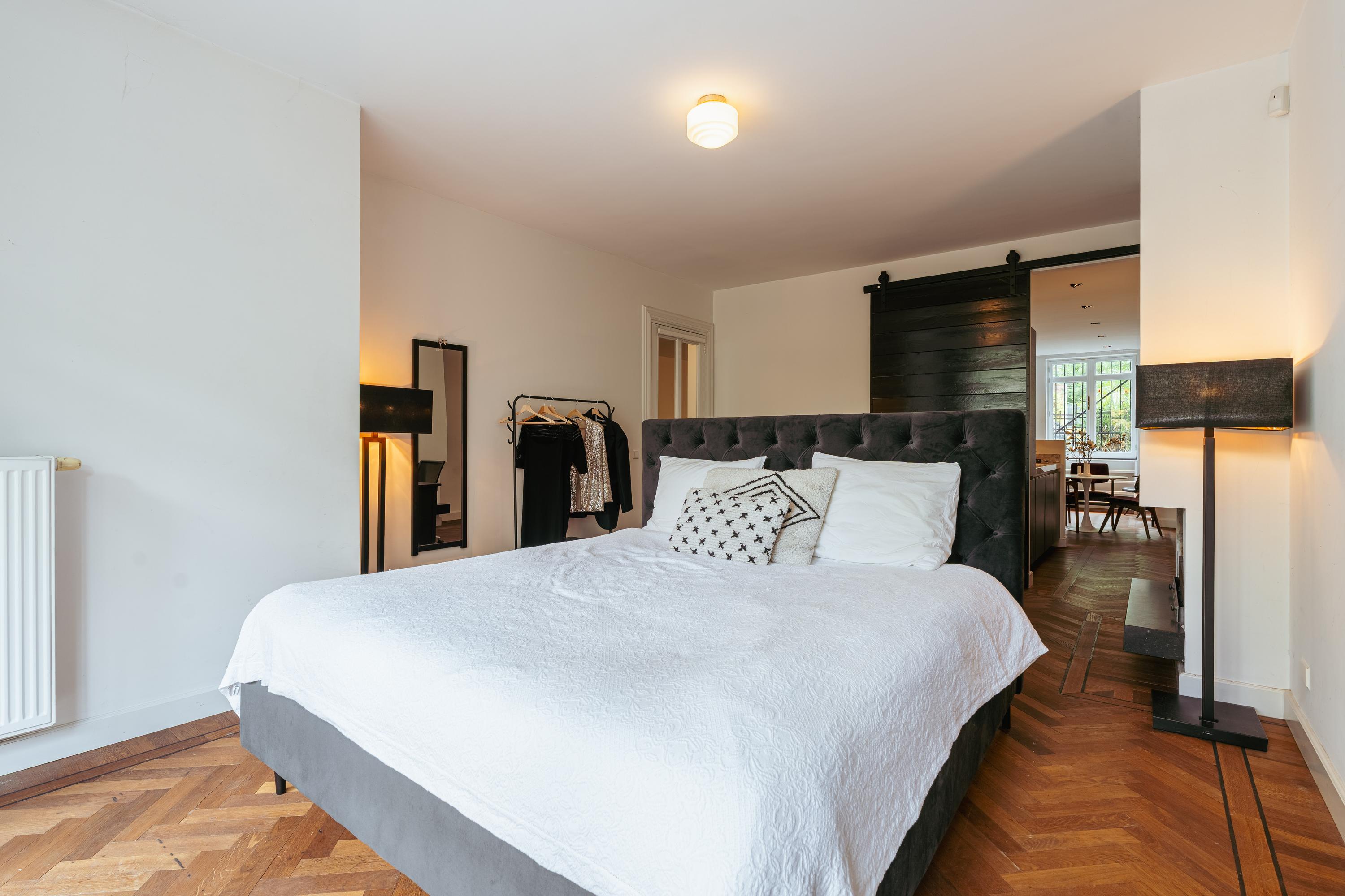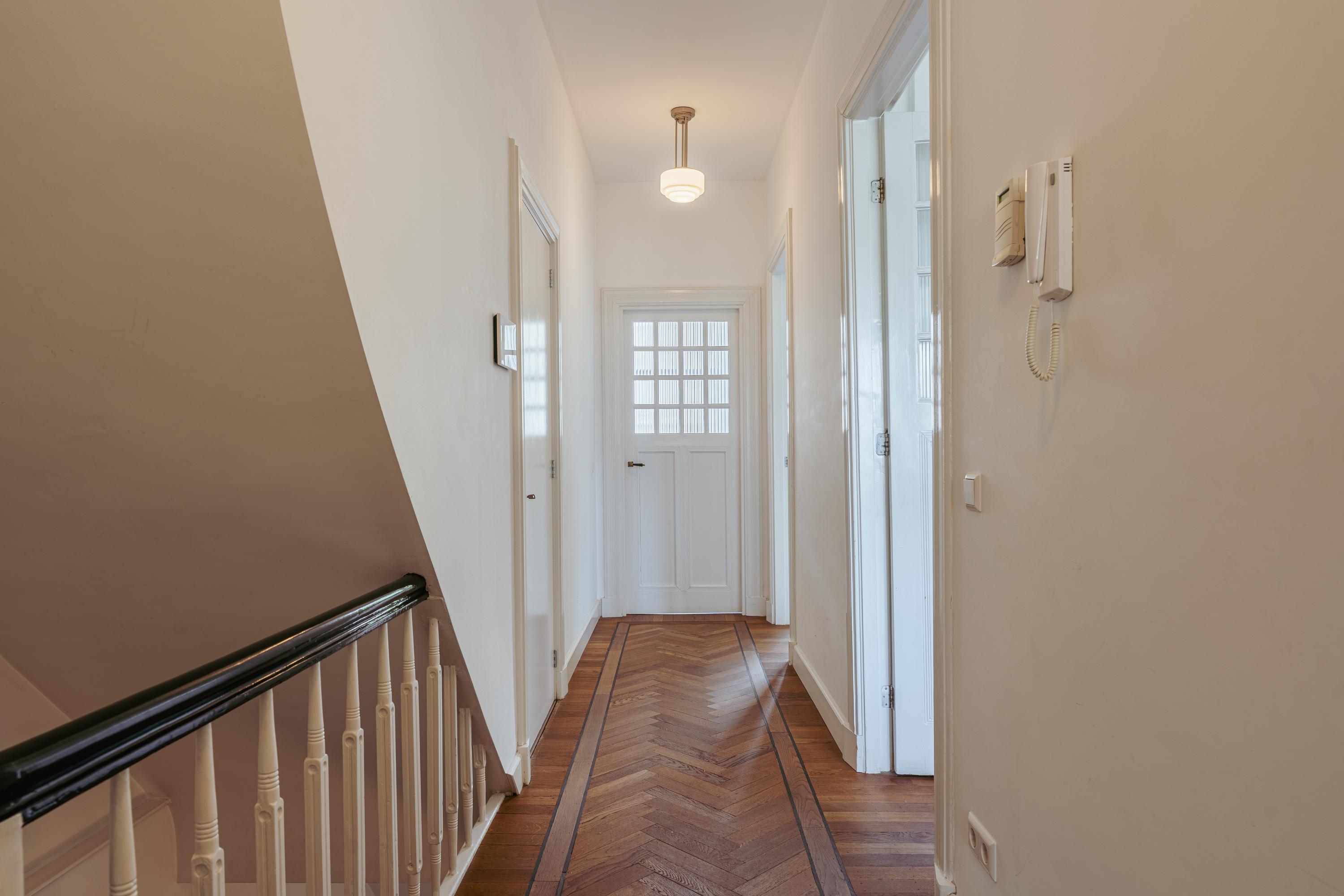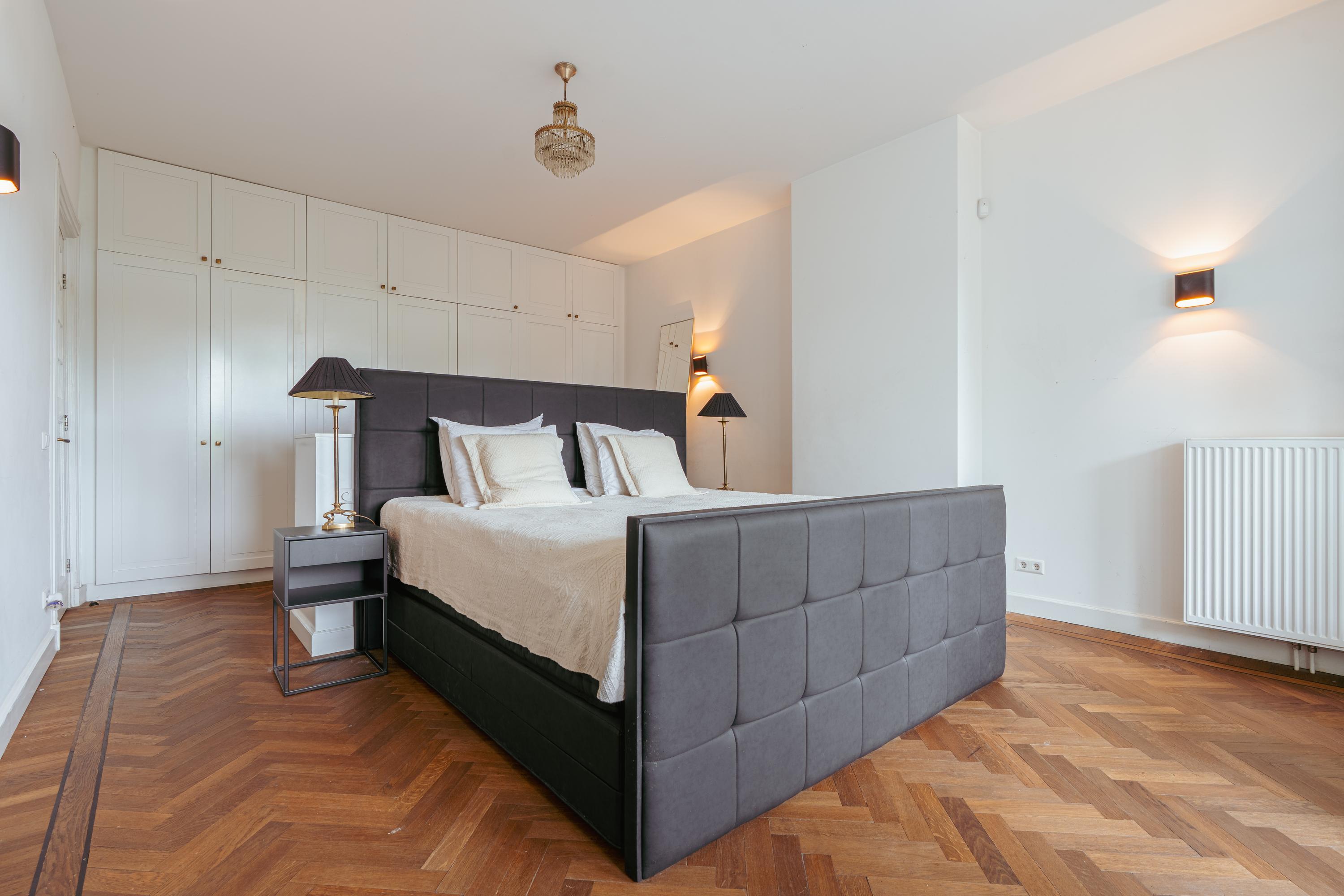 The spacious living room at the front boasts an impressive ceiling height of no less than 3.32 meters and a charming fireplace. The parquet flooring, combined with a partially exposed brick wall, creates a warm and stylish ambiance. At the rear, the dining area adjoins a sunny balcony with French doors—perfect for unwinding after a day’s work. The semi-open kitchen, directly connected to the dining area, is fully equipped. In addition to a sink, dishwasher, double oven, 6-burner gas stove, and marble countertop, the kitchen features a convivial island with bar seating—an ideal spot for a glass of wine or conversation while cooking. Large windows allow for an abundance of natural light and offer pleasant views of the surrounding greenery.