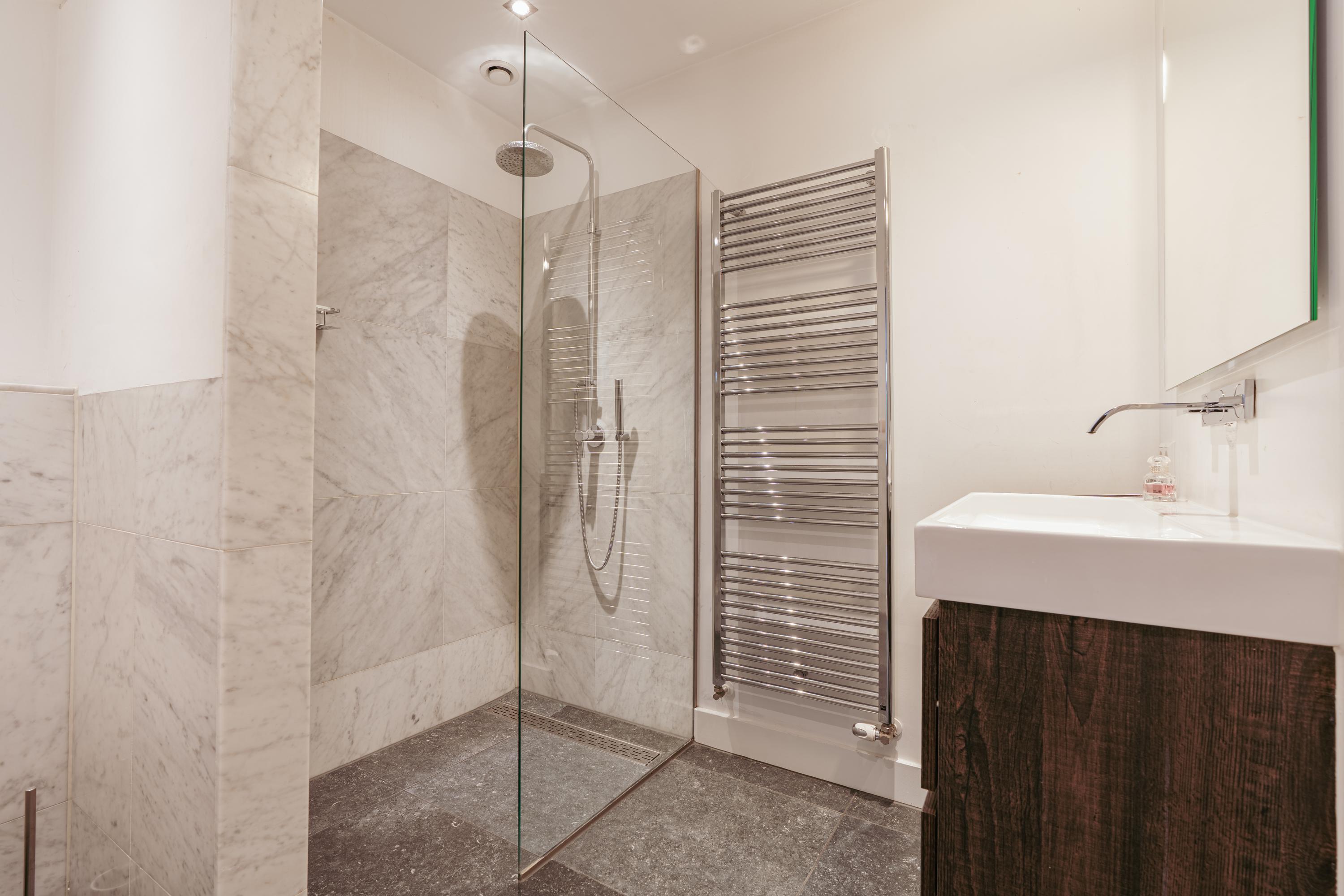 The full-sized basement level offers two well-proportioned bedrooms. The largest bedroom is particularly special with its authentic fireplace. Both bedrooms enjoy direct access, via French doors, to the deep and sheltered rear garden of approximately 56 m², where you can relax in complete privacy.