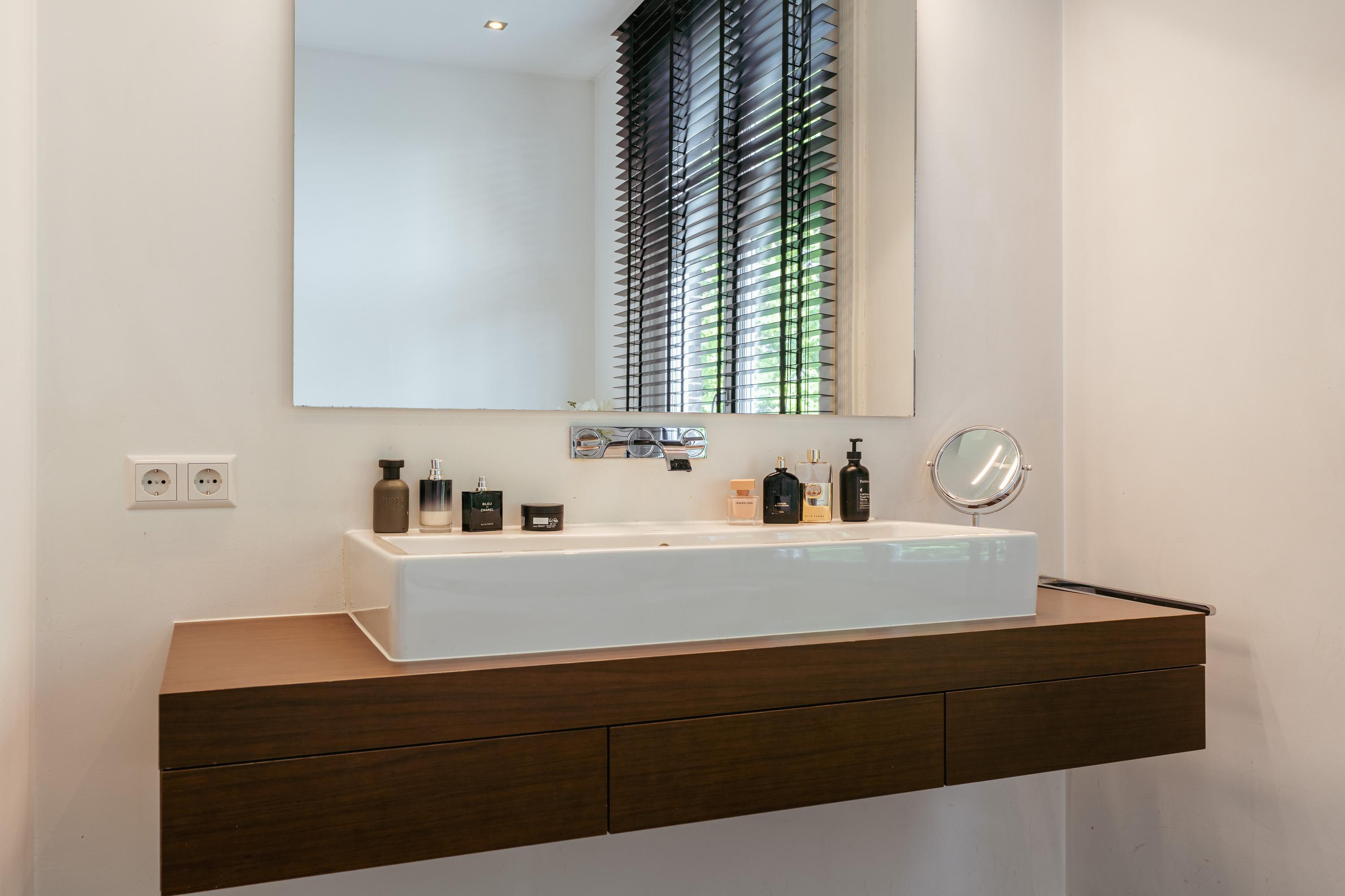 At the front of this level is a second living room with its own entrance, making this floor highly suitable for guests, an au pair, or even dual living. The second kitchen is fitted with a sink, 2-burner gas stove, fridge-freezer combination, and marble countertop. This floor also includes a bathroom with shower, washbasin, and toilet, as well as a separate utility room with laundry area and connections for both washer and dryer.