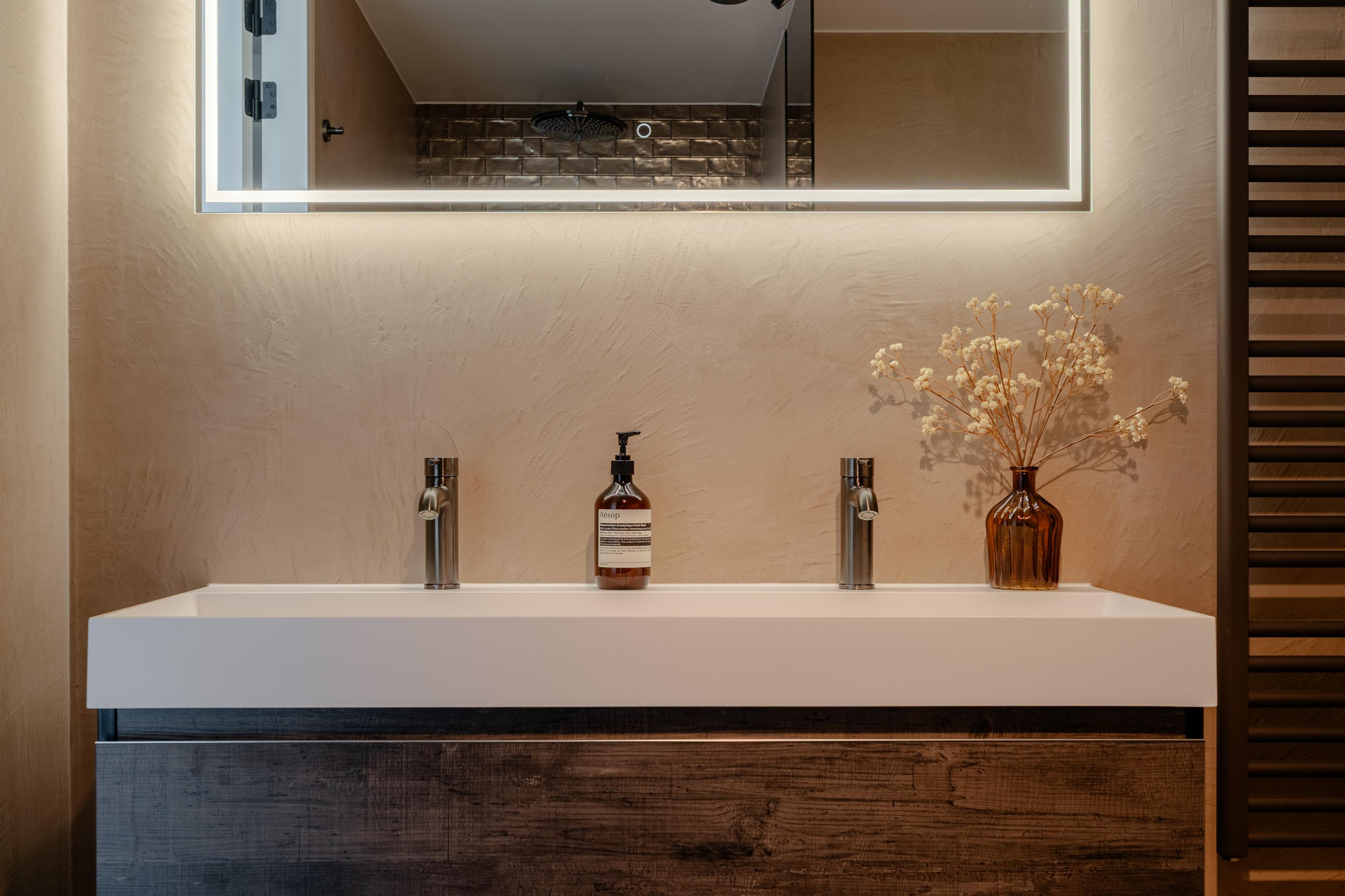 The apartment is accessed via the shared entrance, either by lift or staircase. Upon entering, you arrive in a spacious hallway that provides access to nearly all rooms of the property. From here, you reach the generous living room with open kitchen, three bedrooms, a bathroom, and a separate toilet. The living room is distinguished by its unique triangular layout and the extensive floor-to-ceiling windows along the façade, which ensure excellent natural light and offer unobstructed views towards the River Amstel. The space is generously proportioned and easily accommodates a comfortable seating area and a large dining table. From the living room, there is access to the spacious, covered balconyan inviting outdoor area with beautiful views over the city and the water. The open kitchen is centrally positioned within the living area and designed in a modern, sleek style. It is equipped with high-quality built-in appliances, including an induction cooktop with integrated extraction, a Quooker, a climate-controlled wine cabinet, a fridge/freezer combination, a dishwasher, and two Gaggenau ovens. The apartment features three well-proportioned bedrooms. The largest bedroom benefits from an en-suite bathroom, luxuriously finished with a washbasin and vanity unit, walk-in shower, and toilet. The second bathroom is accessible from the hallway and includes a walk-in shower, double washbasin, and a light, contemporary finish. In addition, there is a separate toilet.