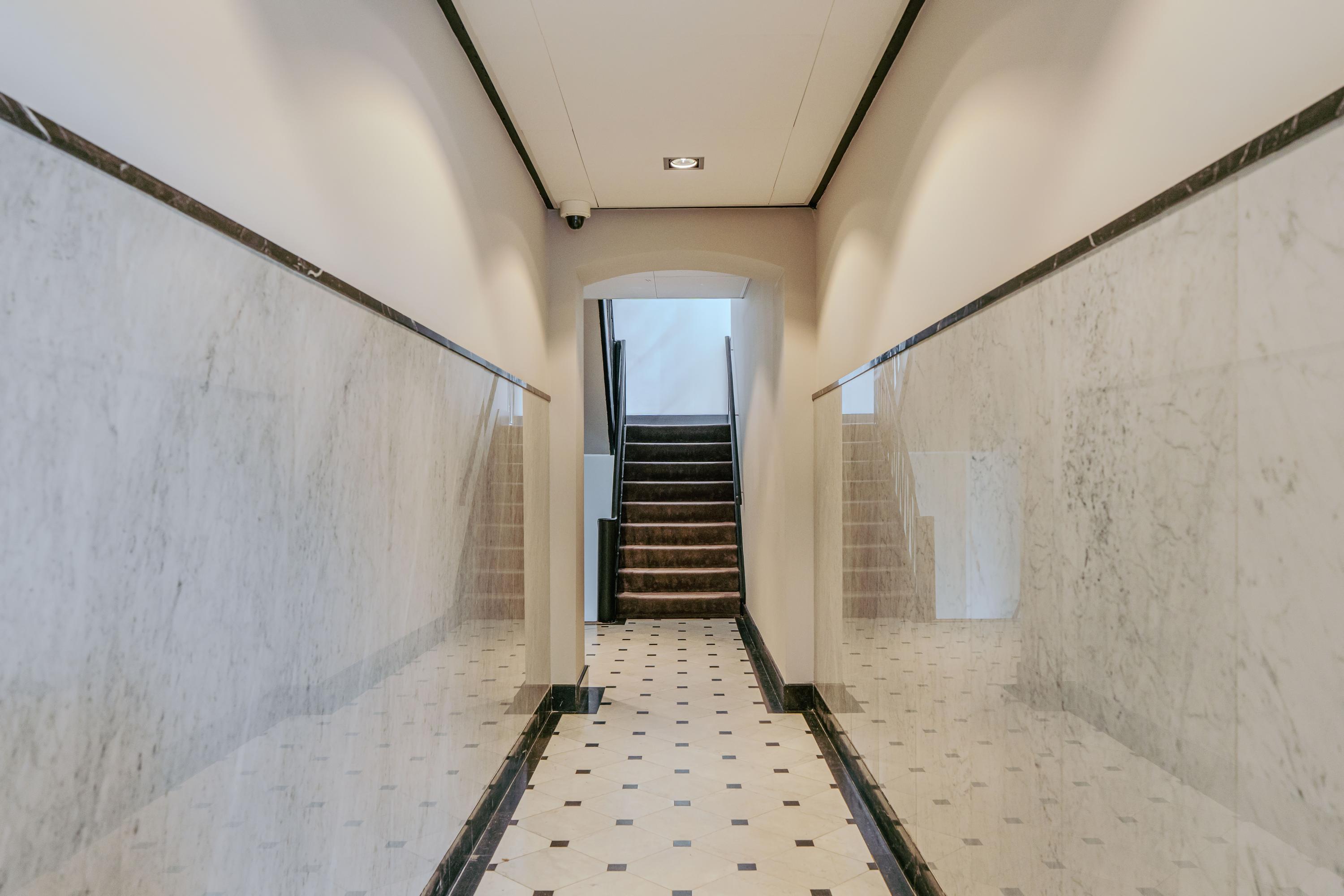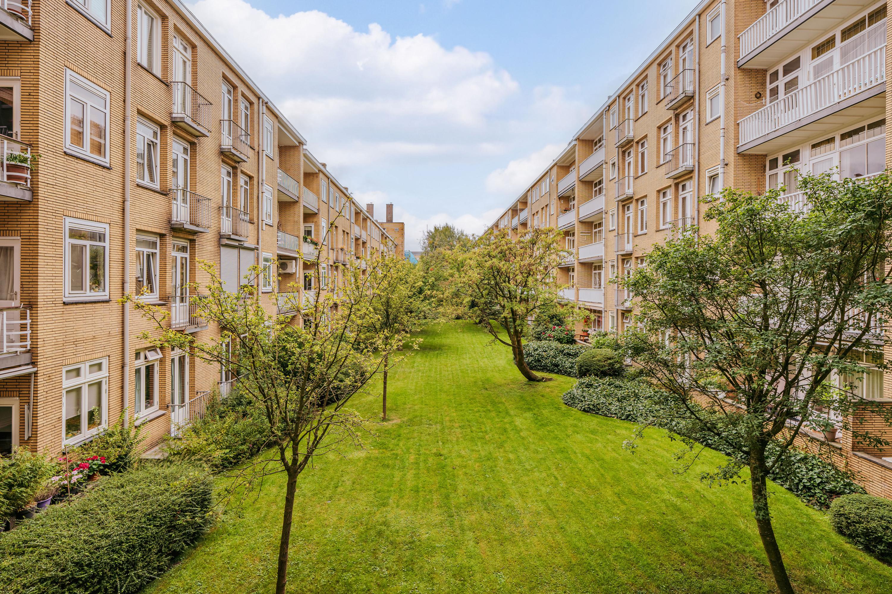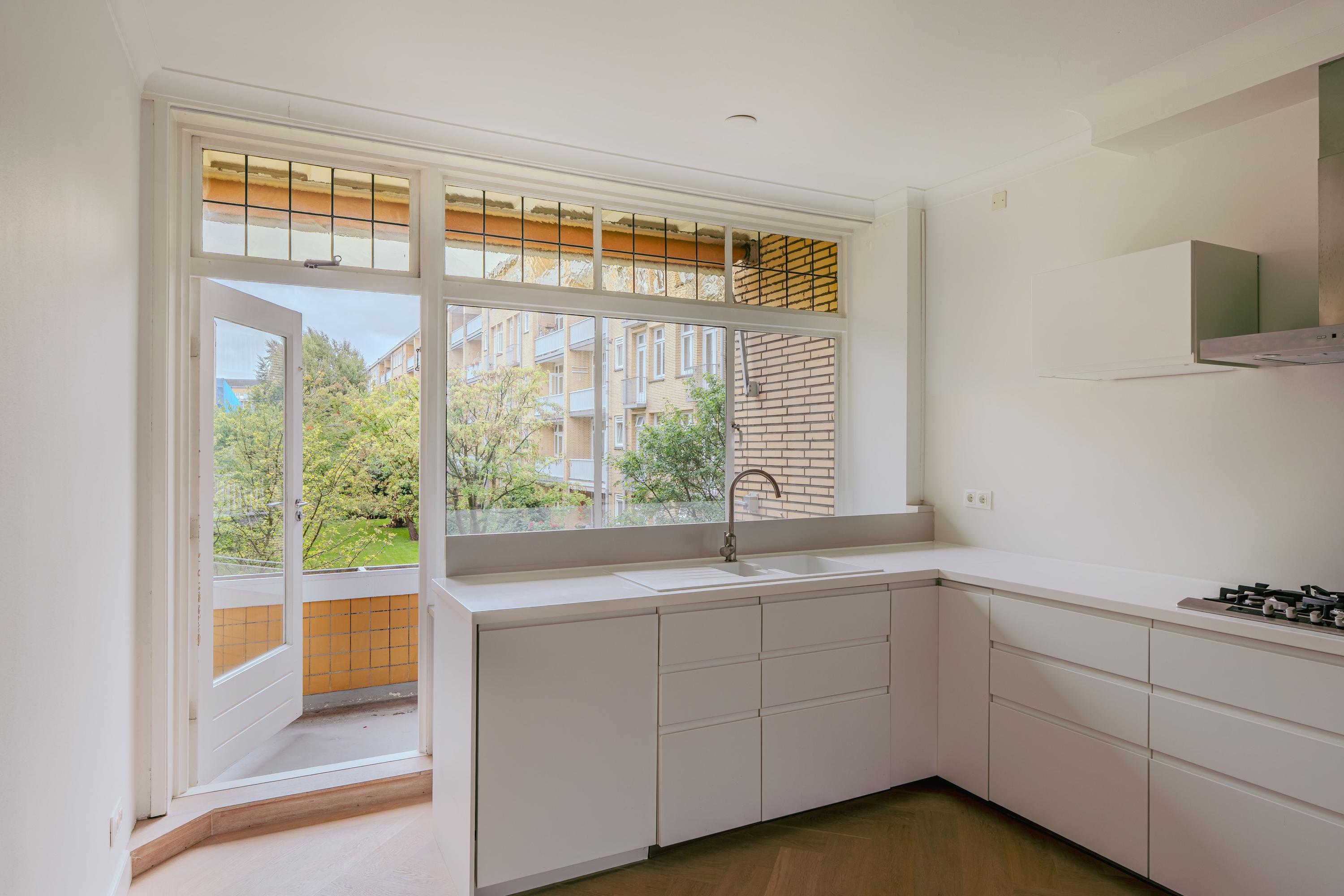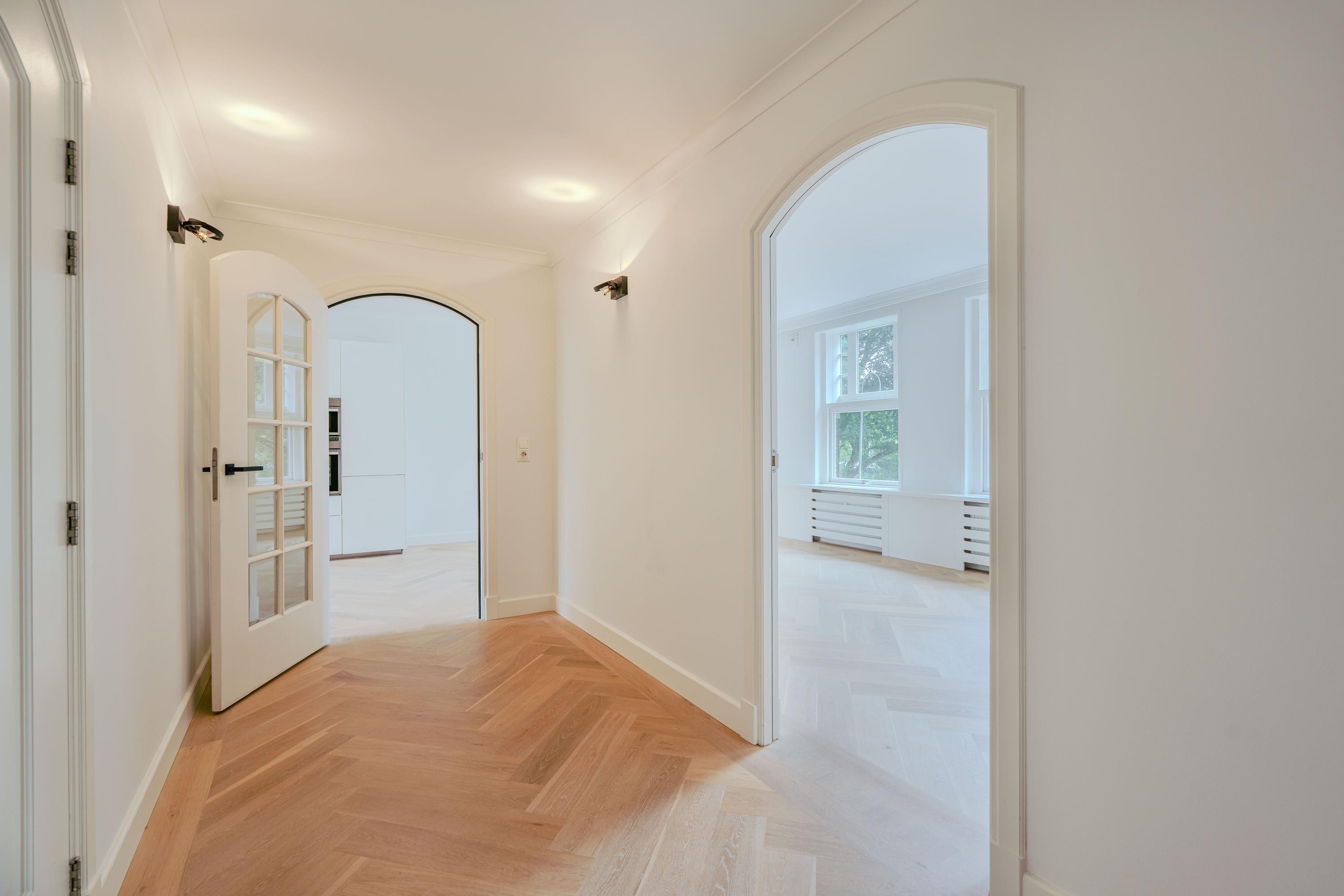 Via the well-maintained communal entrance with staircase and lift, you reach the apartment on the first floor. You enter into a spacious hallway from which all rooms are accessible. The living room is laid out in an L-shape and is particularly bright thanks to the many windows overlooking the beautiful Minervaplein. At the rear is the open kitchen, fitted with all necessary built-in appliances. The balcony is accessible from the kitchen and overlooks the beautifully landscaped garden of the Muzenhof.