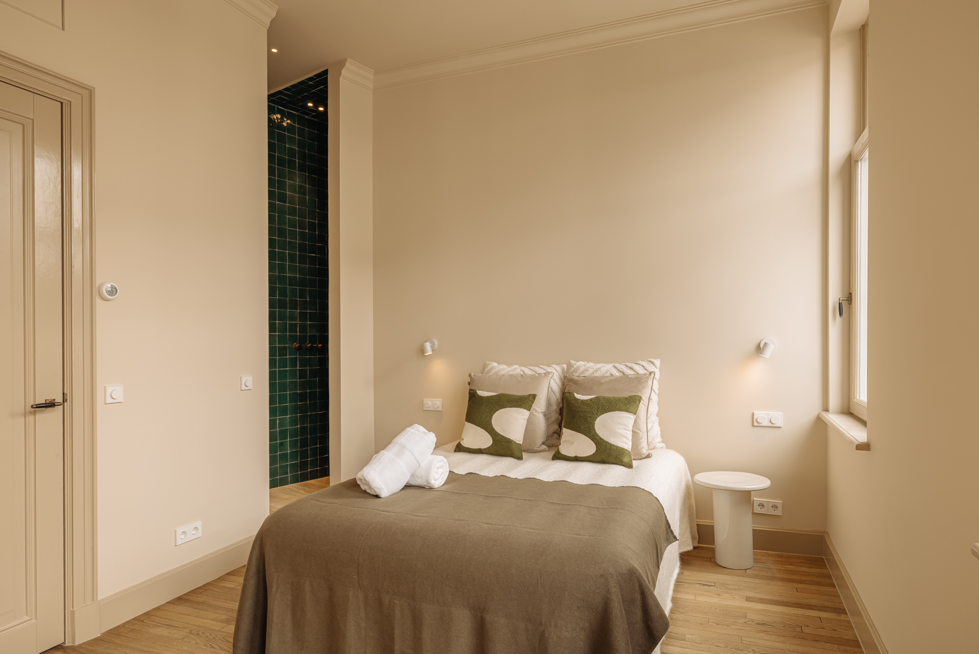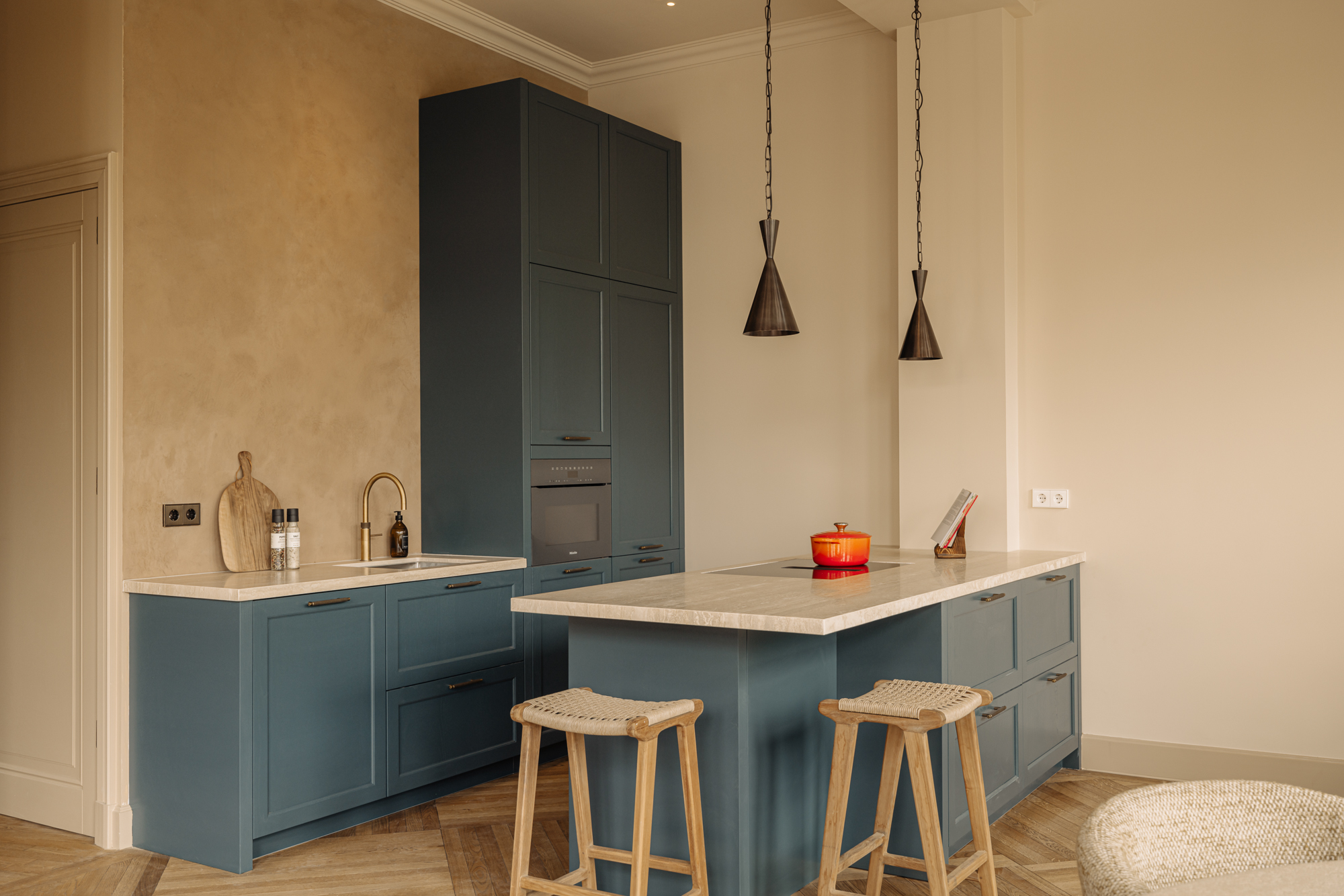 Upon entering the flat on the second floor, you immediately step into the spacious and bright living room. This stands out because of its impressive ceiling height and the large windows that extend over the full width of the front facade - on both the Nieuwe Spiegelstraat and Keizersgracht sides. The modern open kitchen is equipped with high-quality built-in appliances, including an induction hob with integrated extractor system, a fridge-freezer, combination oven, dishwasher and a Quooker. The stylish kitchen island with a travertine top forms the central element of the room.