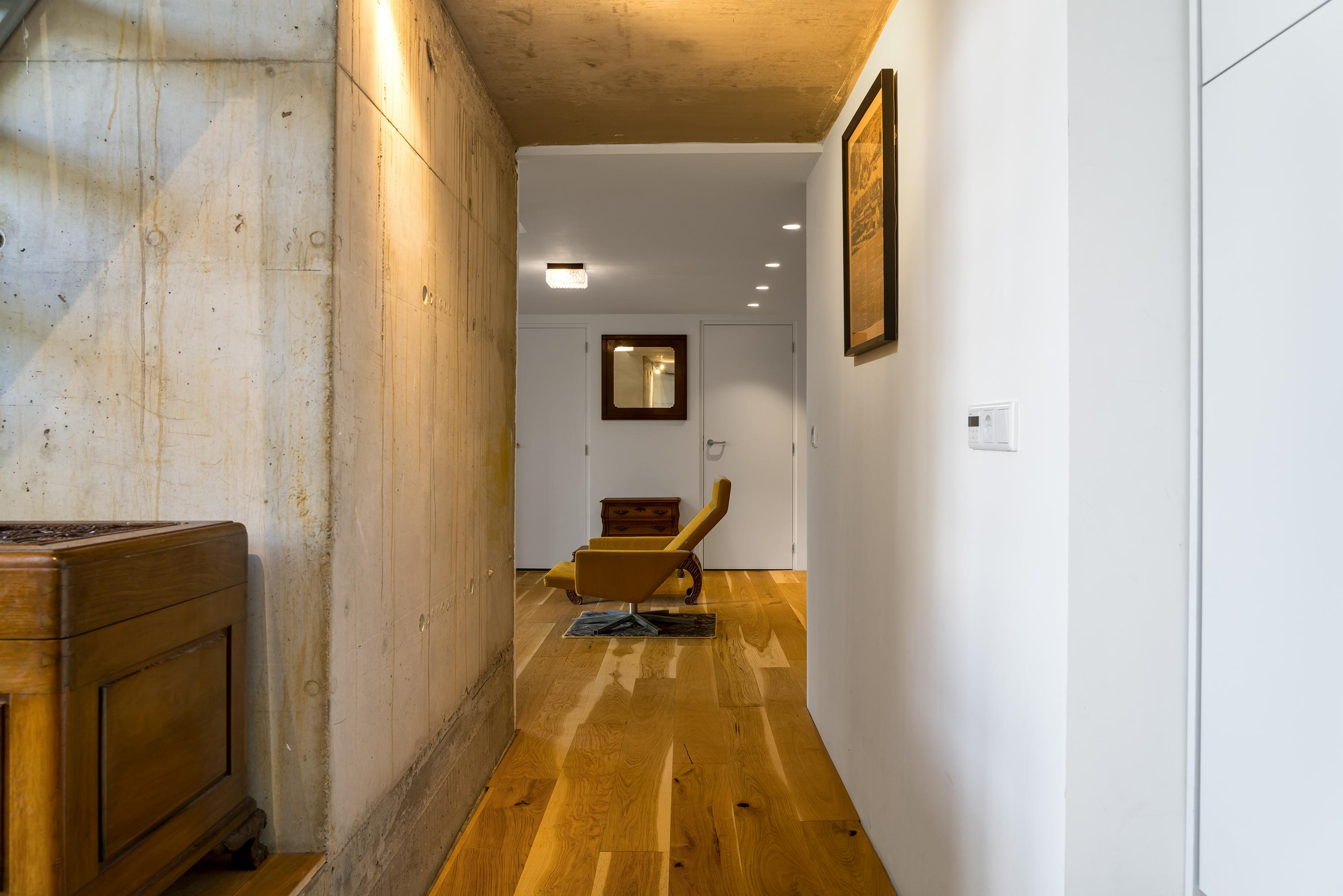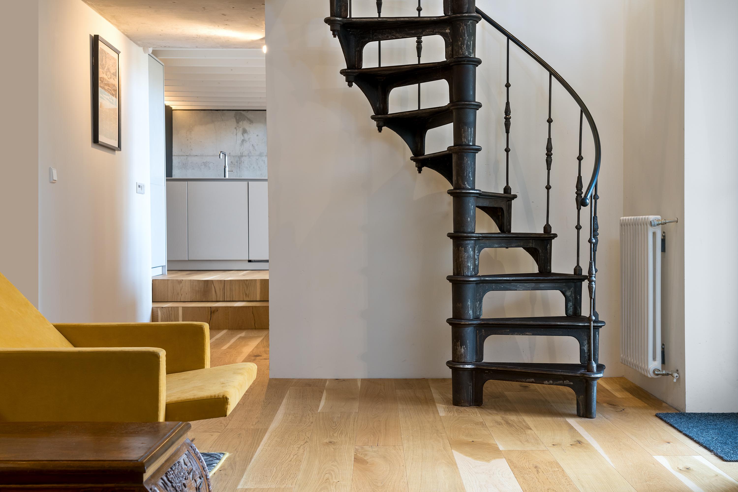 Inside, the home is just as cool. Old and modern materials were used in the new construction/renovation. Tough wooden construction beams, raw concrete, oak floorboards, classic member radiators and the steel spiral staircase are some examples.