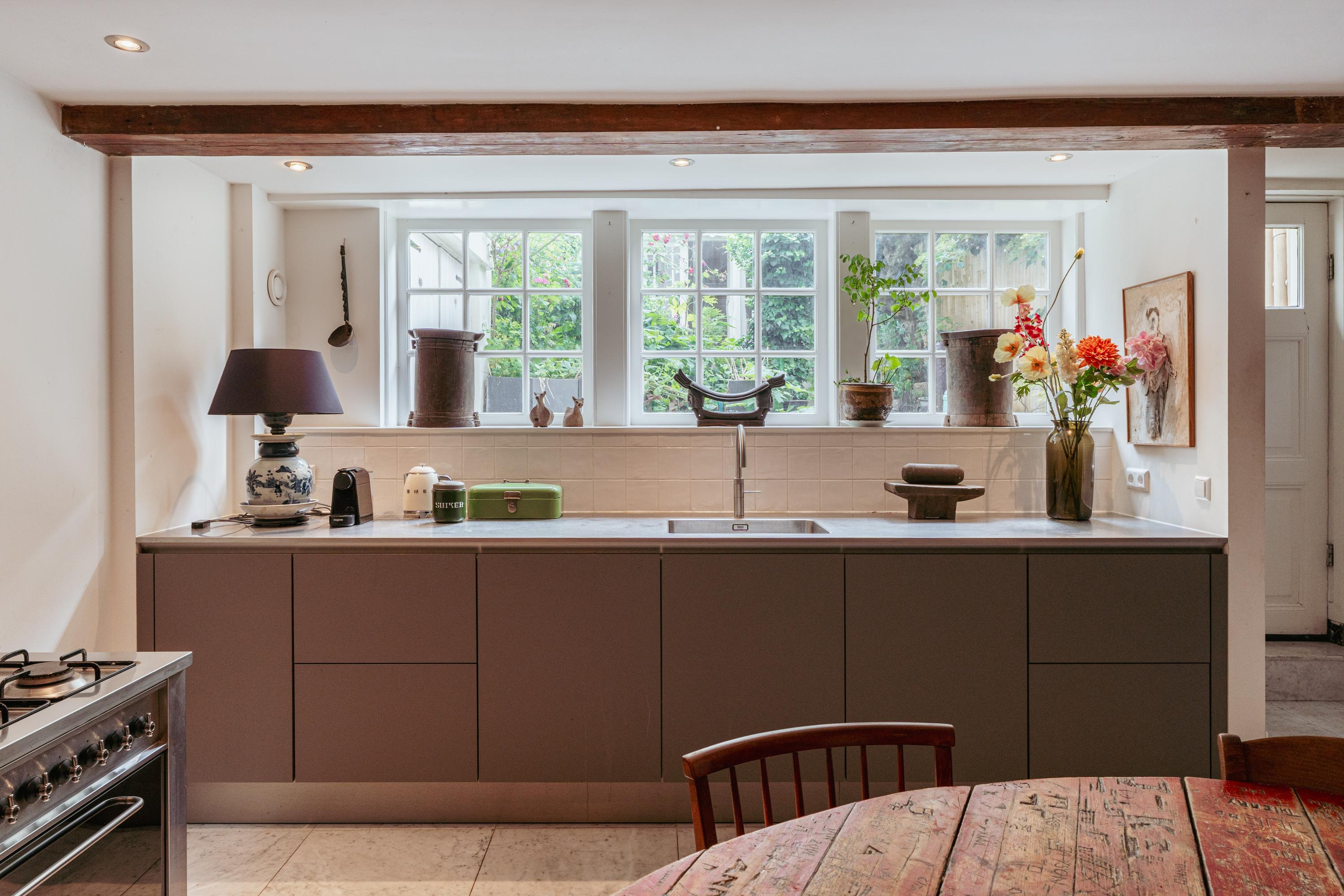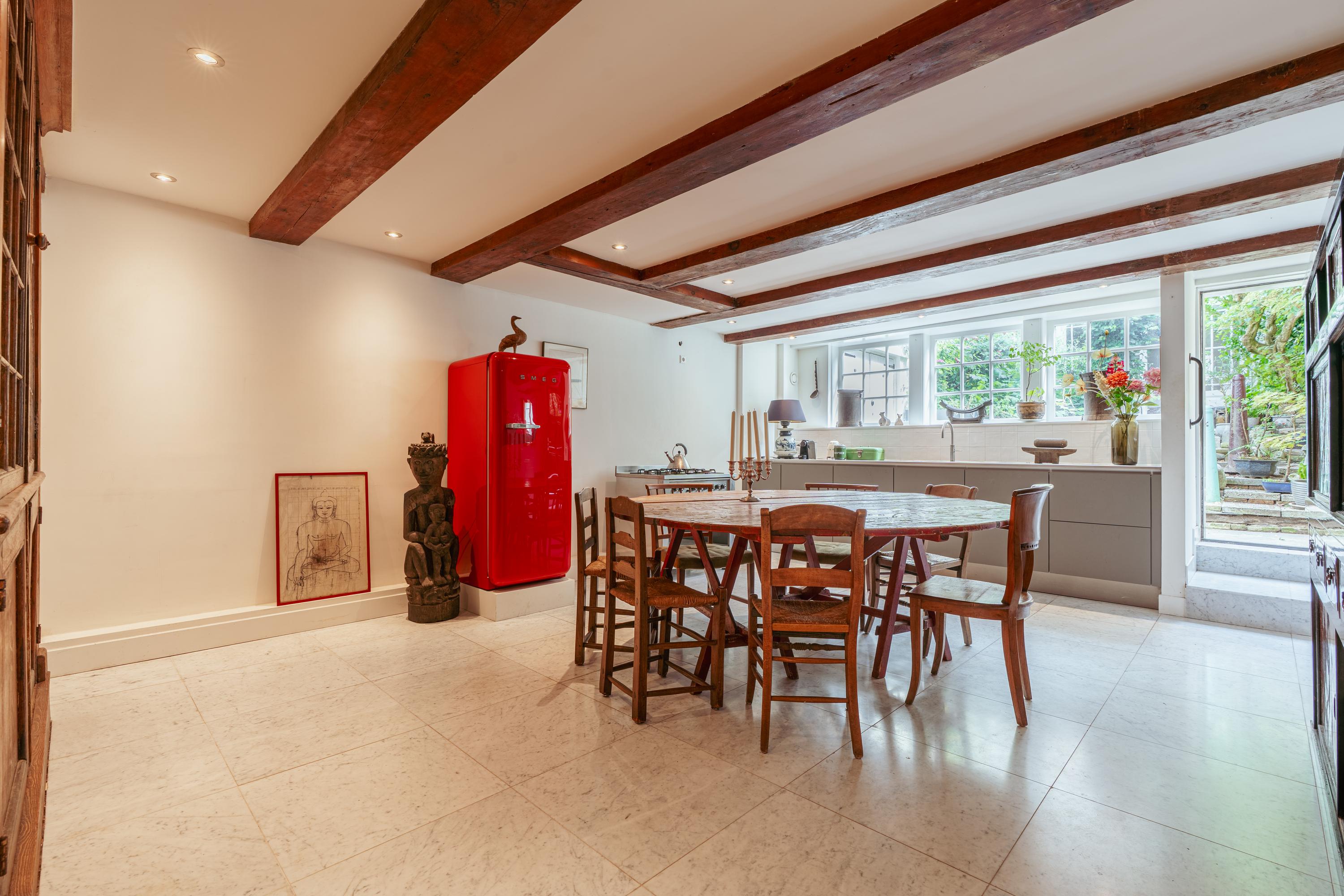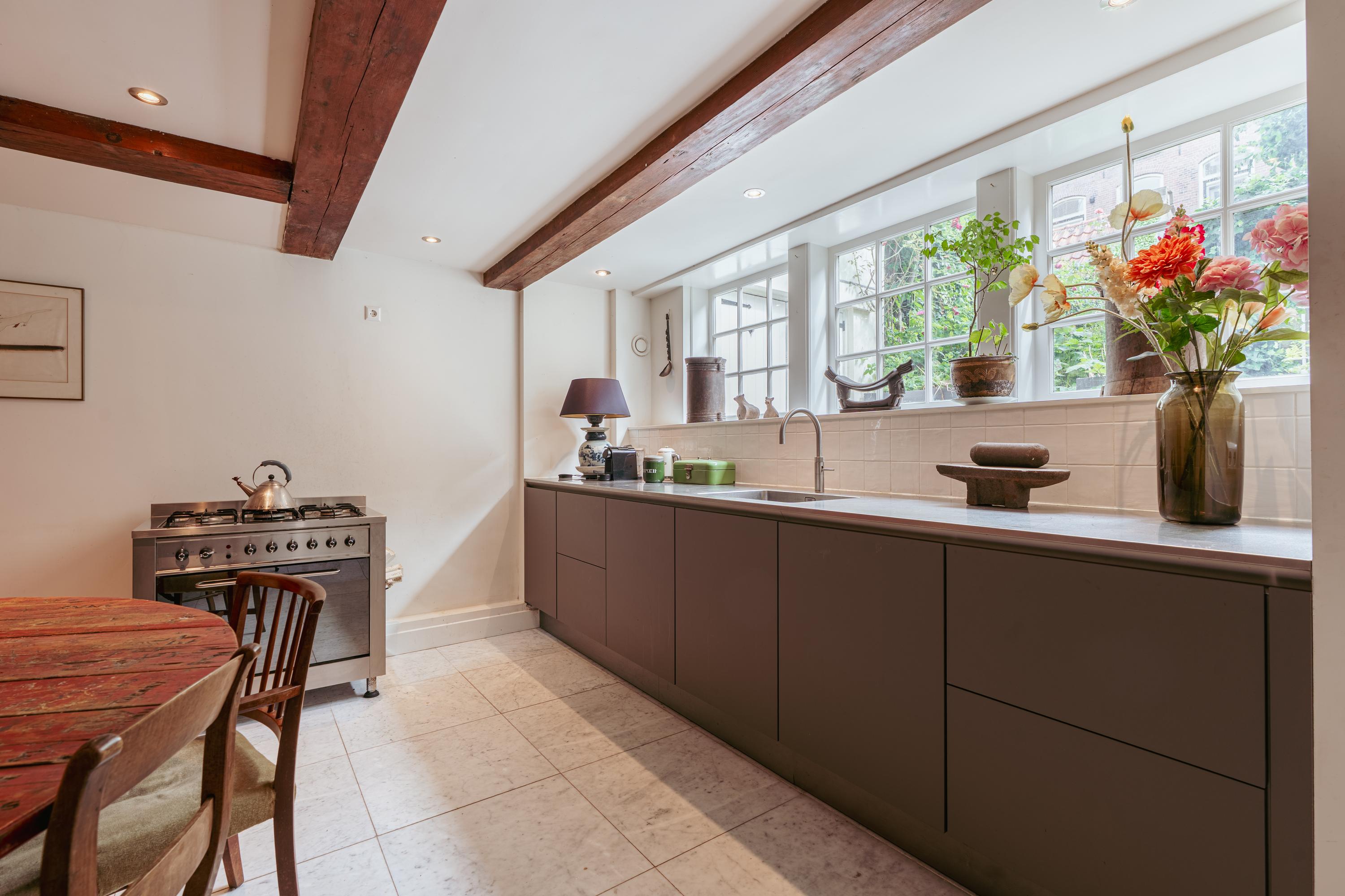 The basement is reached via the internal staircase and is spacious and functionally laid out. At the rear is the dining room with adjoining kitchen. The kitchen is located on the garden side and offers direct access to the deep rear garden, creating a pleasant connection between indoor and outdoor living. The kitchen is equipped with a Quooker, dishwasher, a freestanding gas stove with oven and a fridge-freezer combination. In addition, the kitchen features beautiful built-in wooden cabinets, ideal for extra storage space. From the kitchen there is access to a separate room with connections for a washing machine and dryer.