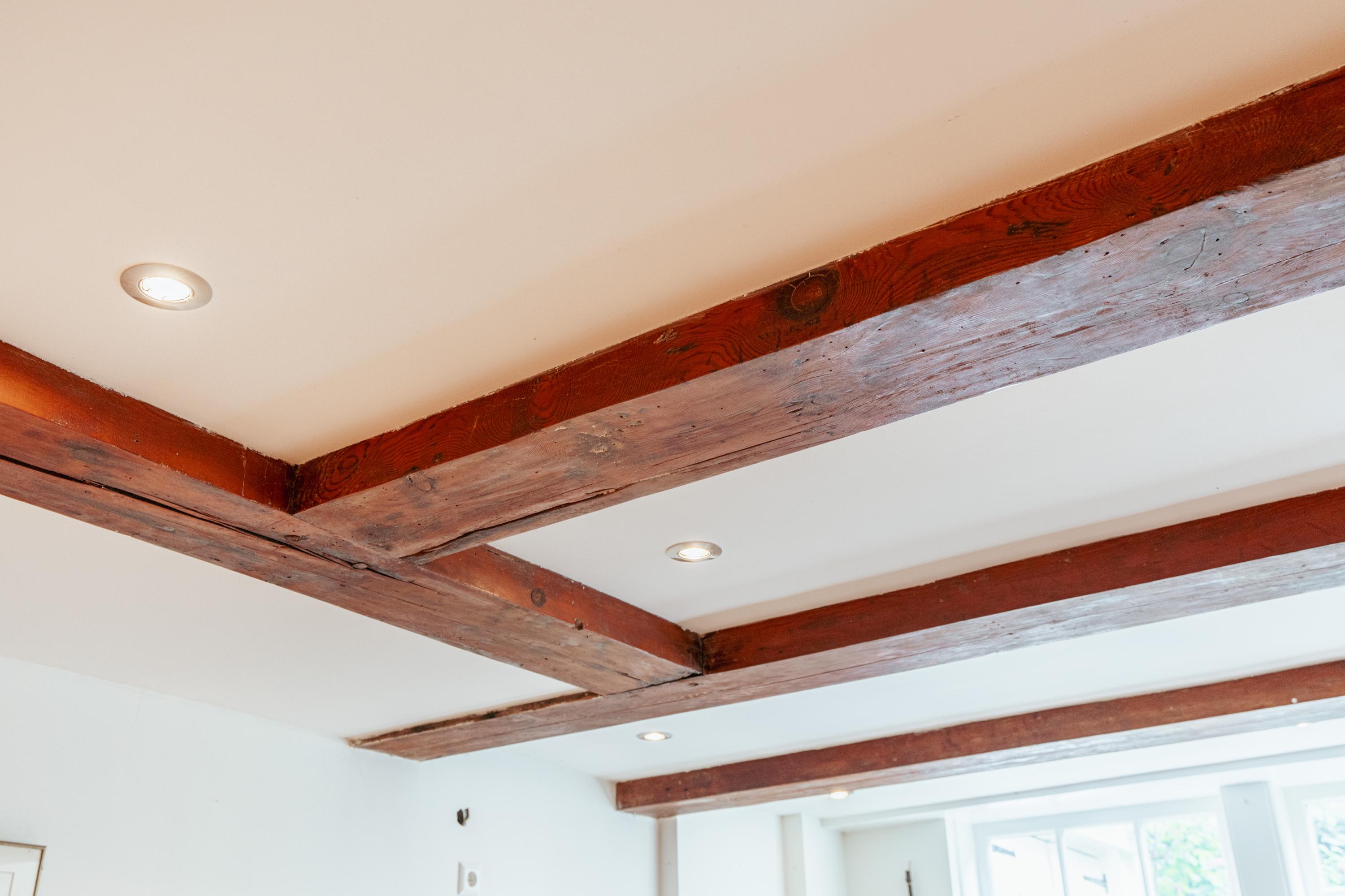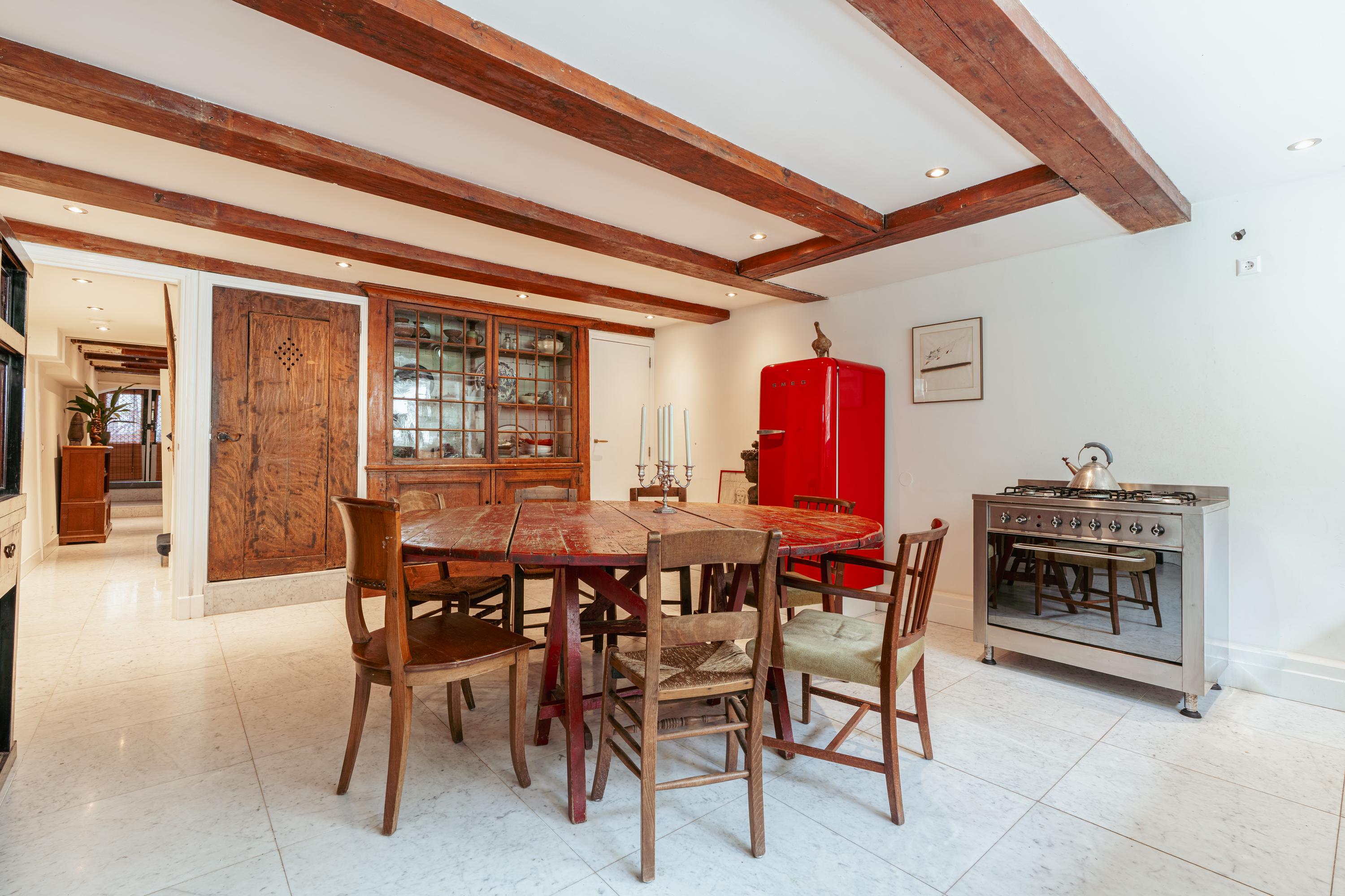 At the front of the apartment is a spacious room, ideal as a home office or separate dining room. This room also has its own private entrance from the communal hallway. At the rear is the living room overlooking the inner garden. Both rooms feature characteristic wooden beams and high windows, creating a pleasant influx of daylight.