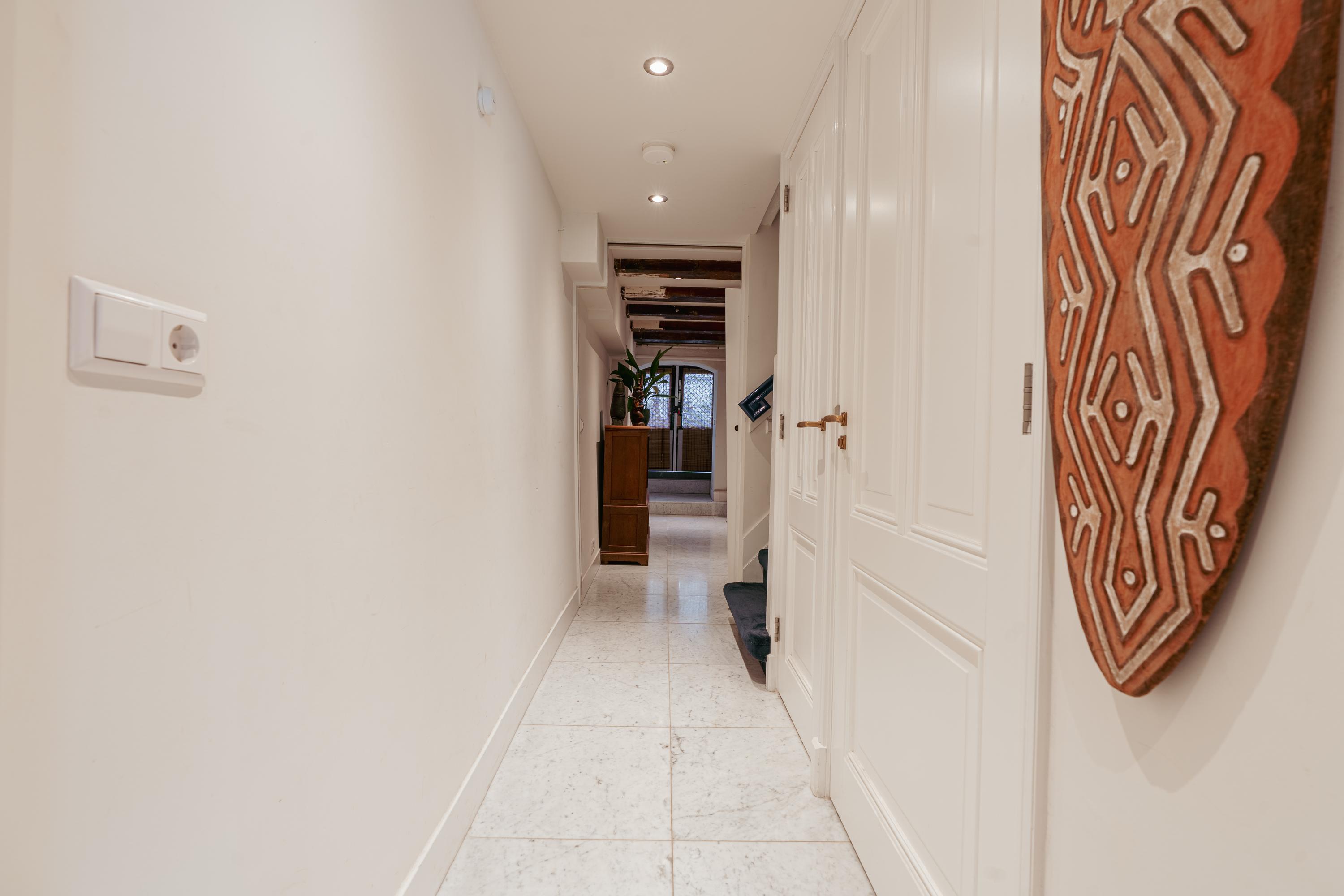 Via the communal entrance on the Prinsengracht, you reach the apartment on the bel-etage at the end of the hallway. You enter a hall with a separate cupboard, providing access to the rooms on this floor as well as the staircase to the basement. The bel-etage has a warm, characterful appearance with plenty of natural light and unobstructed views of the canal.