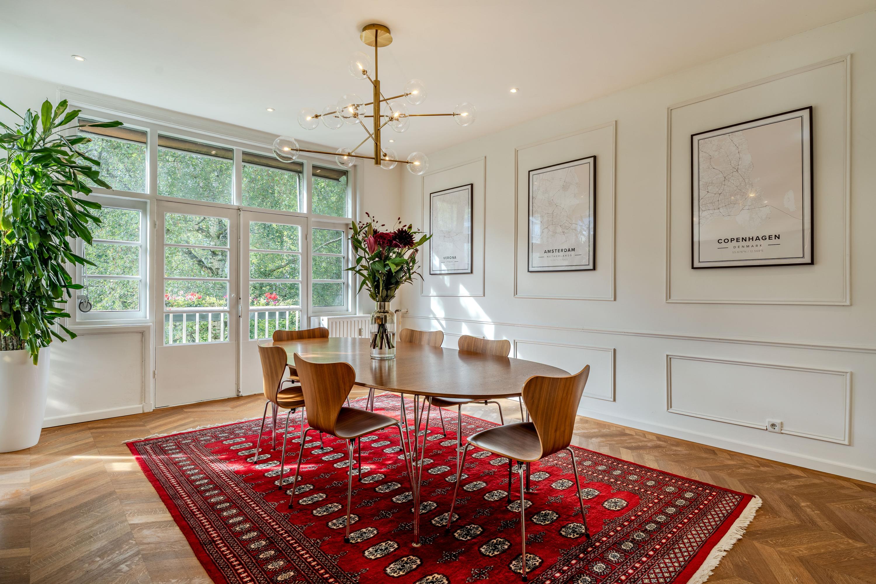 The spacious main living floor combines charm with modern comfort. At the front is the atmospheric living room featuring a bay window, built-in cabinets, and a cozy fireplace. Adjacent is the spacious dining kitchen with room for a large dining table, equipped with an island, sink, induction cooktop, dishwasher, combi-oven, fridge, and freezer. Between the kitchen and the second sitting room, a stylish bar has been installed, featuring two climate-controlled wine cabinets. The kitchen also provides access to the rear balcony. A separate toilet is located on this floor as well.