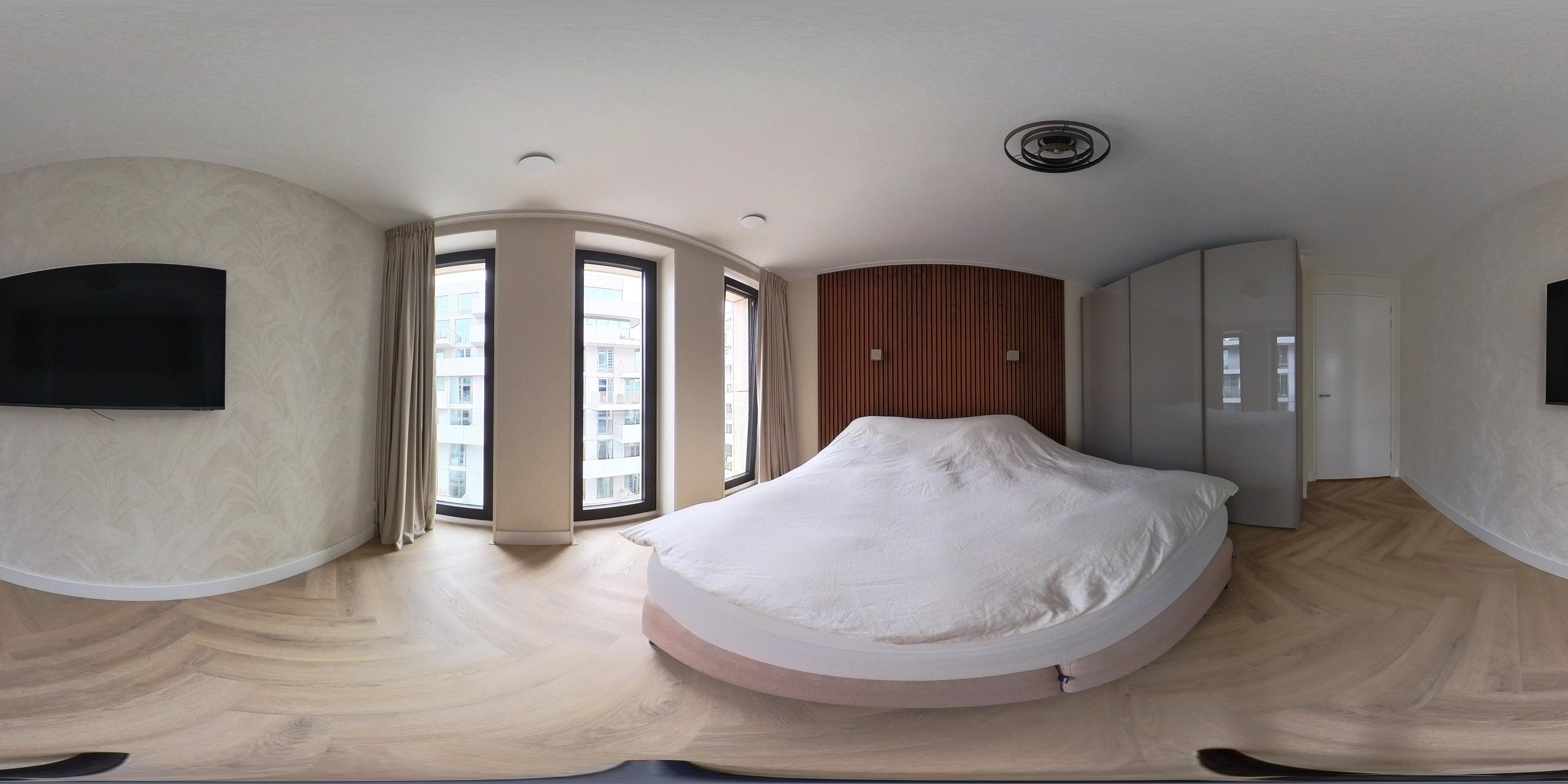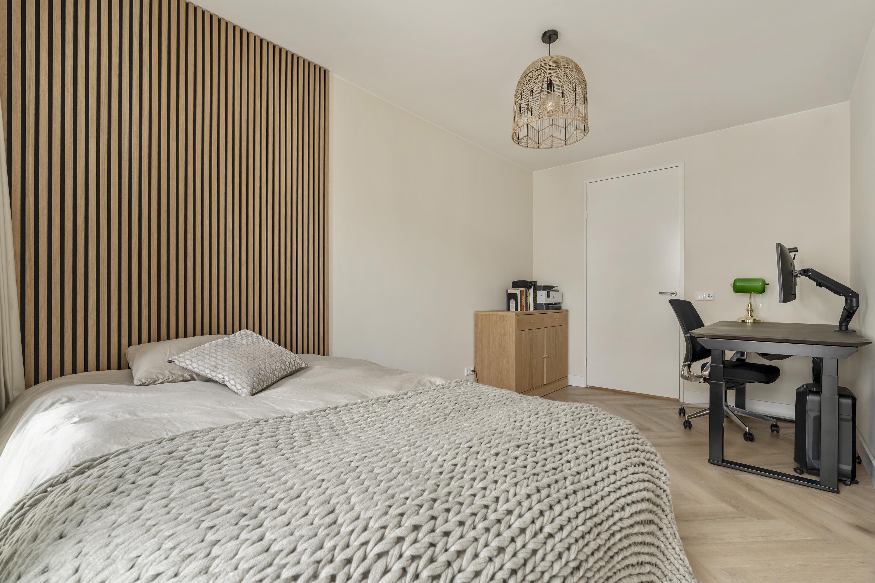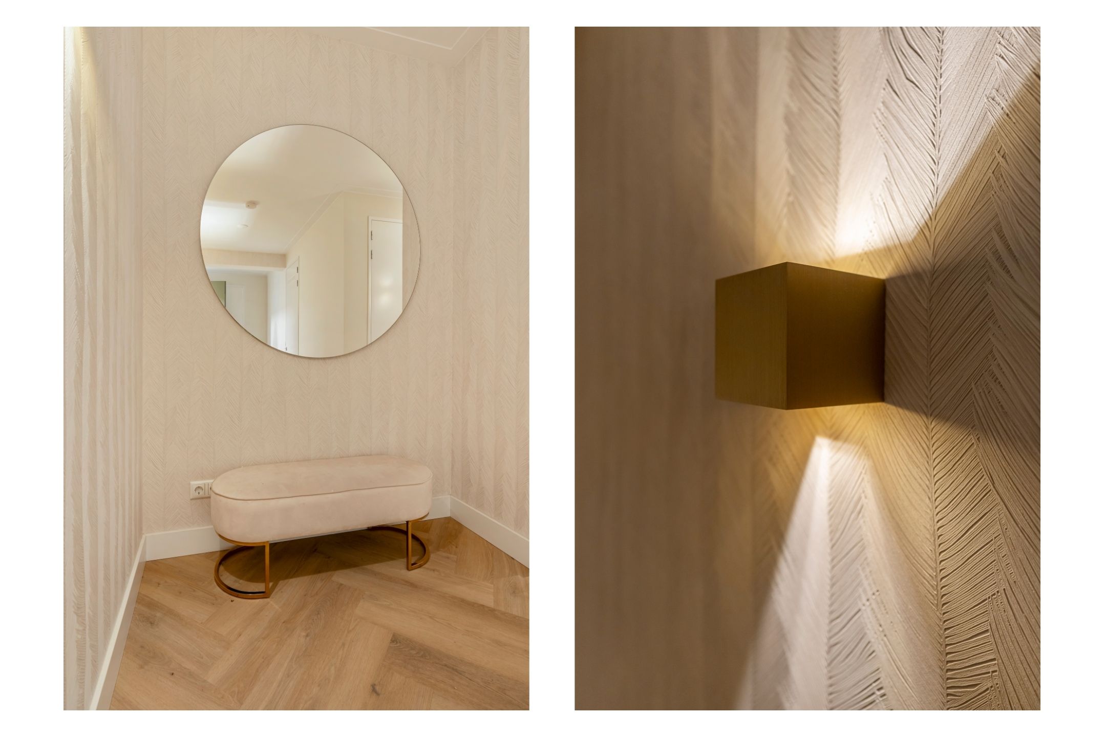 Bij binnenkomst in de ruime hal valt direct de verzorgde afwerking op: een lichte visgraatvloer, zachte tinten en subtiele wandverlichting geven het geheel een rustige, moderne uitstraling. De hal biedt toegang tot alle vertrekken en beschikt over een ruime berging, een aparte wasruimte met aansluitingen voor wasmachine en droger en een separaat toilet met fontein. De drie naast elkaar gelegen slaapkamers zijn licht en sfeervol dankzij de hoge ramen en warme kleurtonen. De kamers zijn goed bemeten en voorzien van imposante raampartijen.