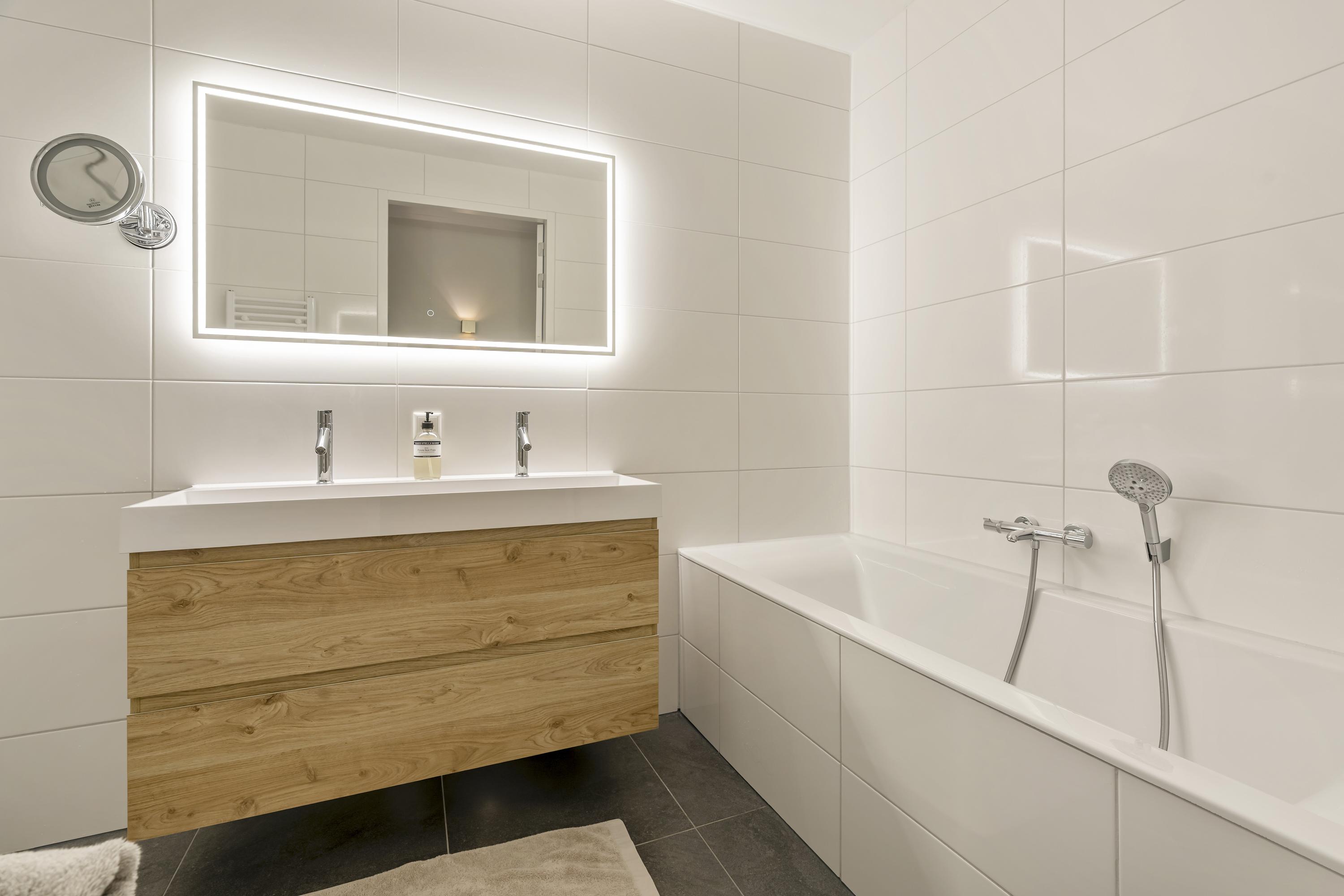 De badkamer is modern en comfortabel ingericht met een inloopdouche, ligbad, dubbel wastafelmeubel en een grote spiegel met geïntegreerde verlichting en verwarming. Aan het einde van de hal bevindt zich de lichte woonkamer met grote raampartijen rondom – een fijne leefruimte met uitzicht op de omliggende omgeving en het groen. De woonkamer en open keuken lopen vloeiend in elkaar over en bieden samen een prettige, open indeling.