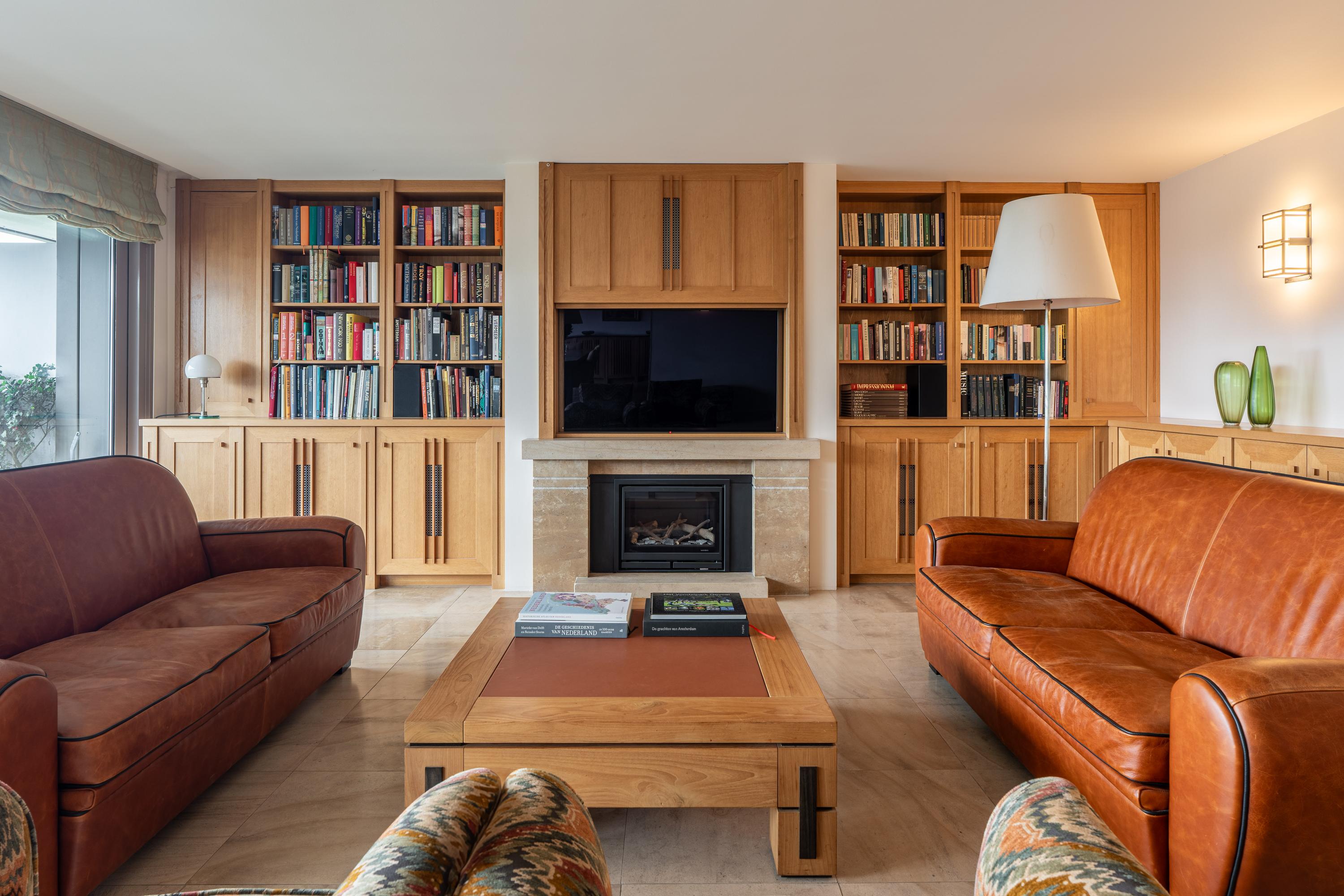 Next to the dining area is the expansive living room with a gas fireplace and built-in cabinetry. The TV can be concealed behind a wooden sliding panel, creating the perfect ambiance for cozy evenings by the fire. Adjacent to the living area is a comfortable workspace with ample storage.