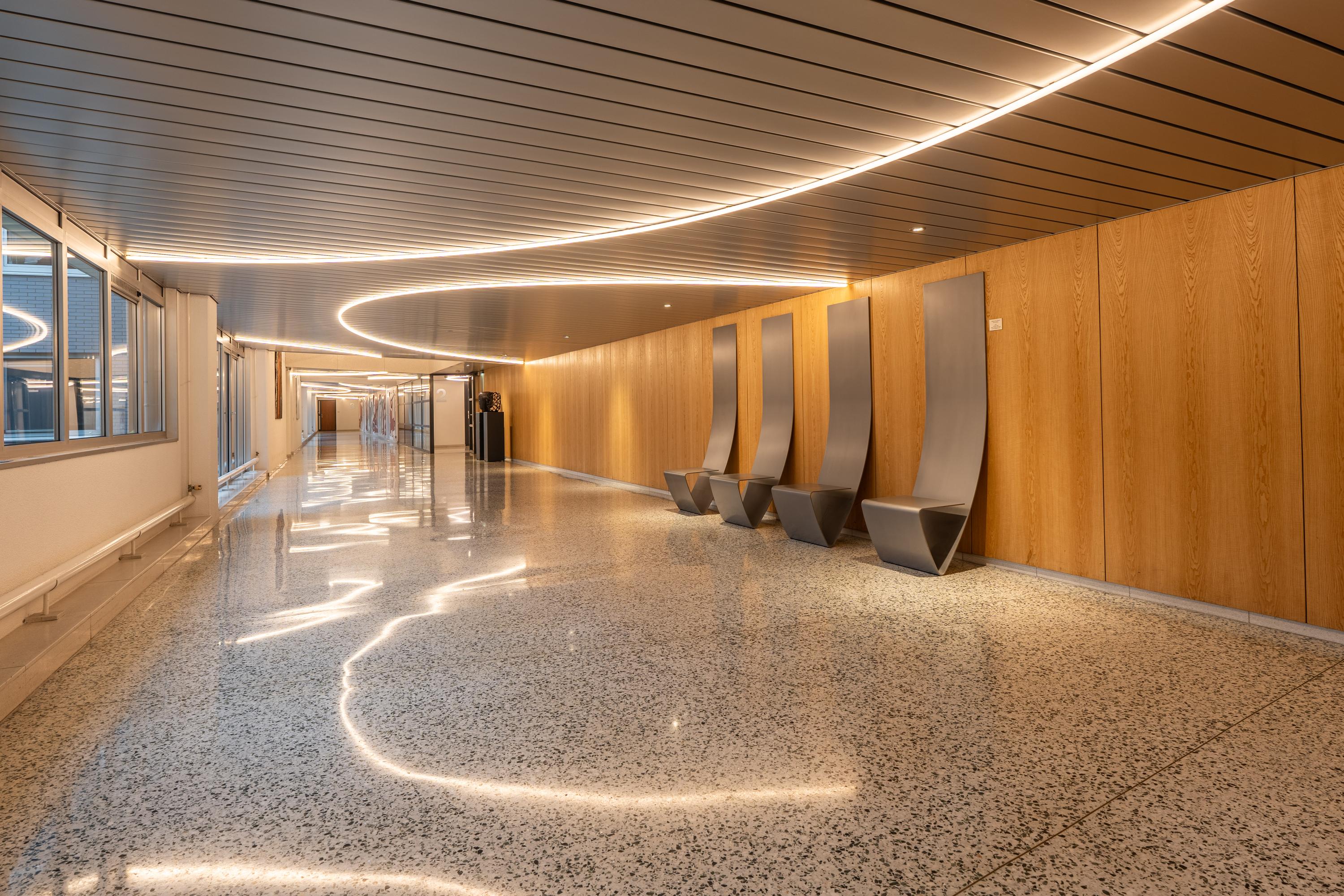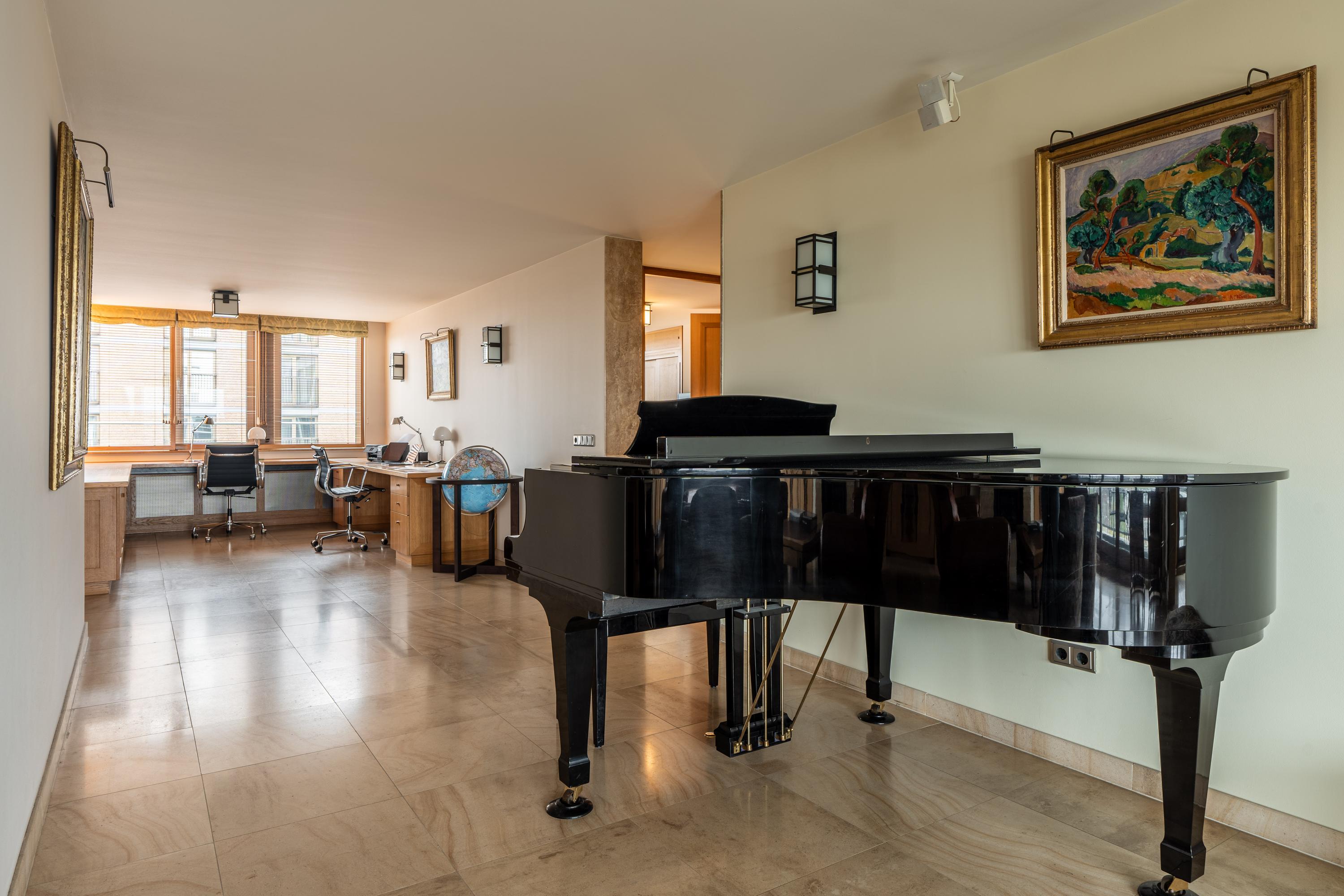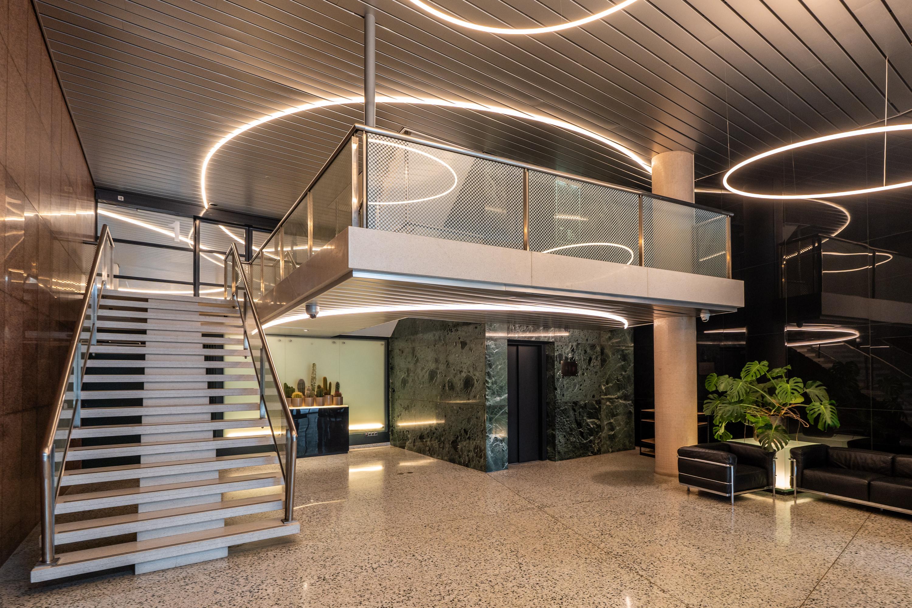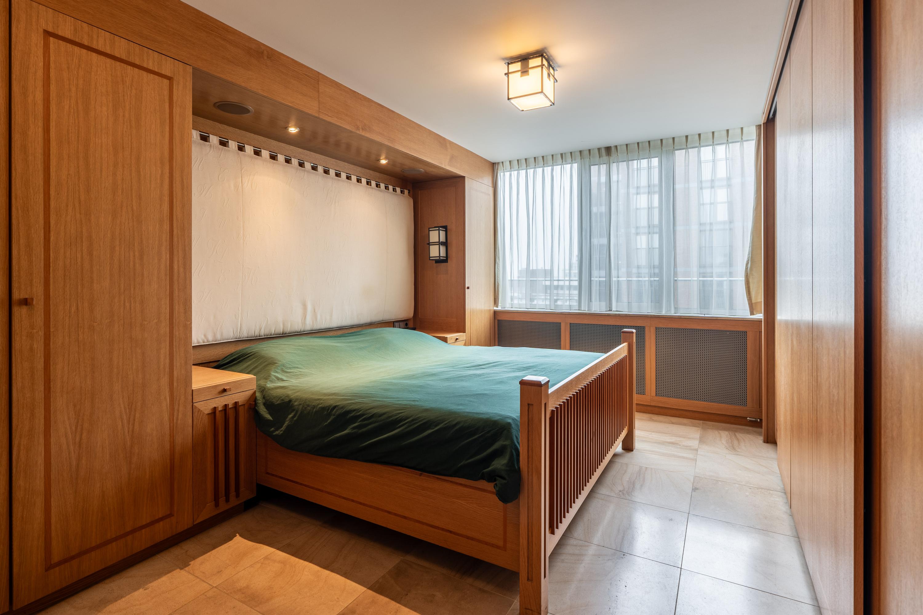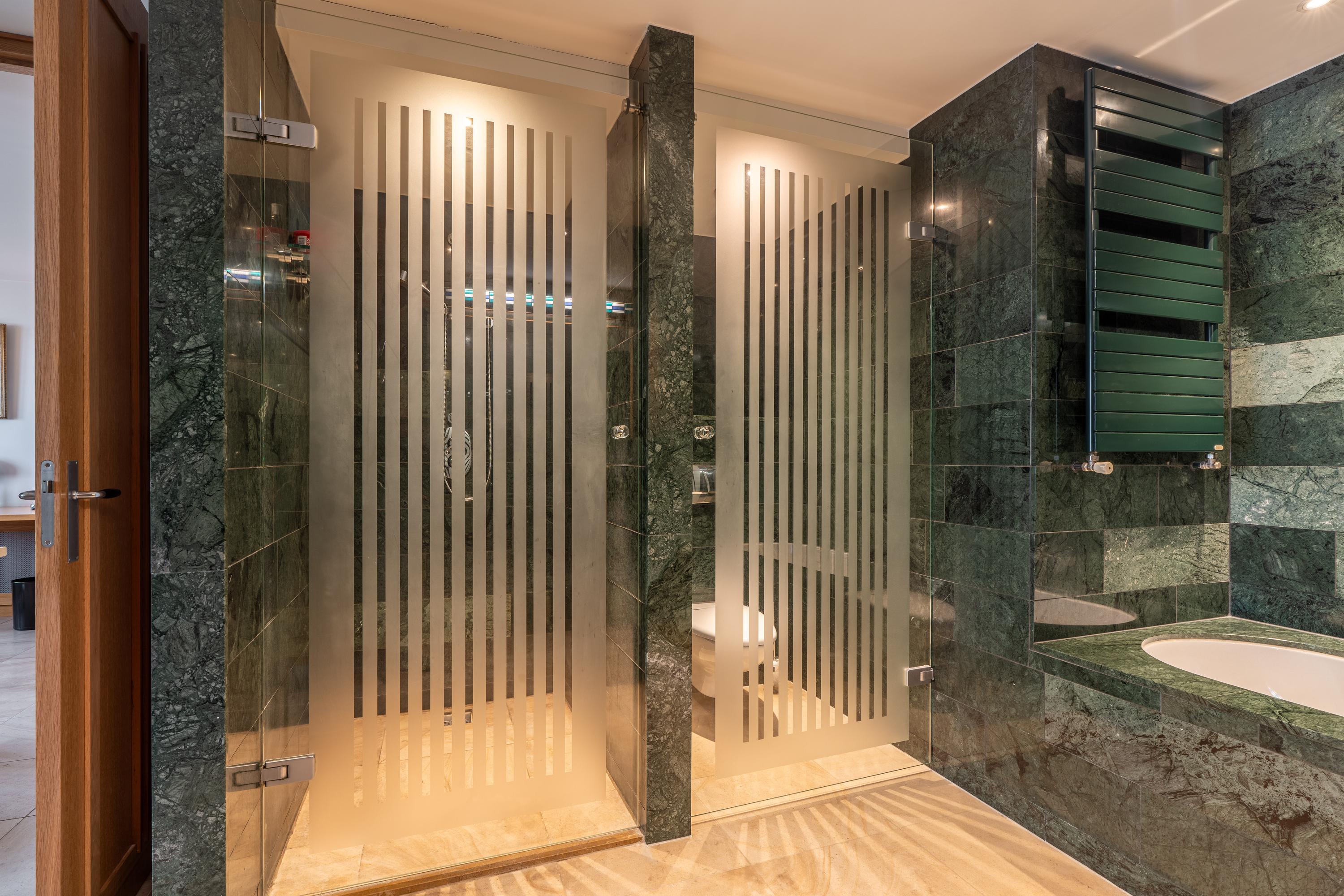This modern apartment building, *Byzantium*, is located on the eighth floor. Designed by the world-renowned architect Rem Koolhaas, the complex features a luxurious natural stone entrance. The elegant hall includes an elevator and a well-maintained staircase. Security is top-notch, with 24-hour surveillance and a concierge. Both the ground-floor entrance and the parking garage are monitored. From the parking garage, residents have direct access to the stairwell and can reach their homes internally. The garage also includes a bicycle storage area and a car wash. Additionally, the homeowners’ association maintains a shared, beautifully landscaped and furnished rooftop garden on the first floor.