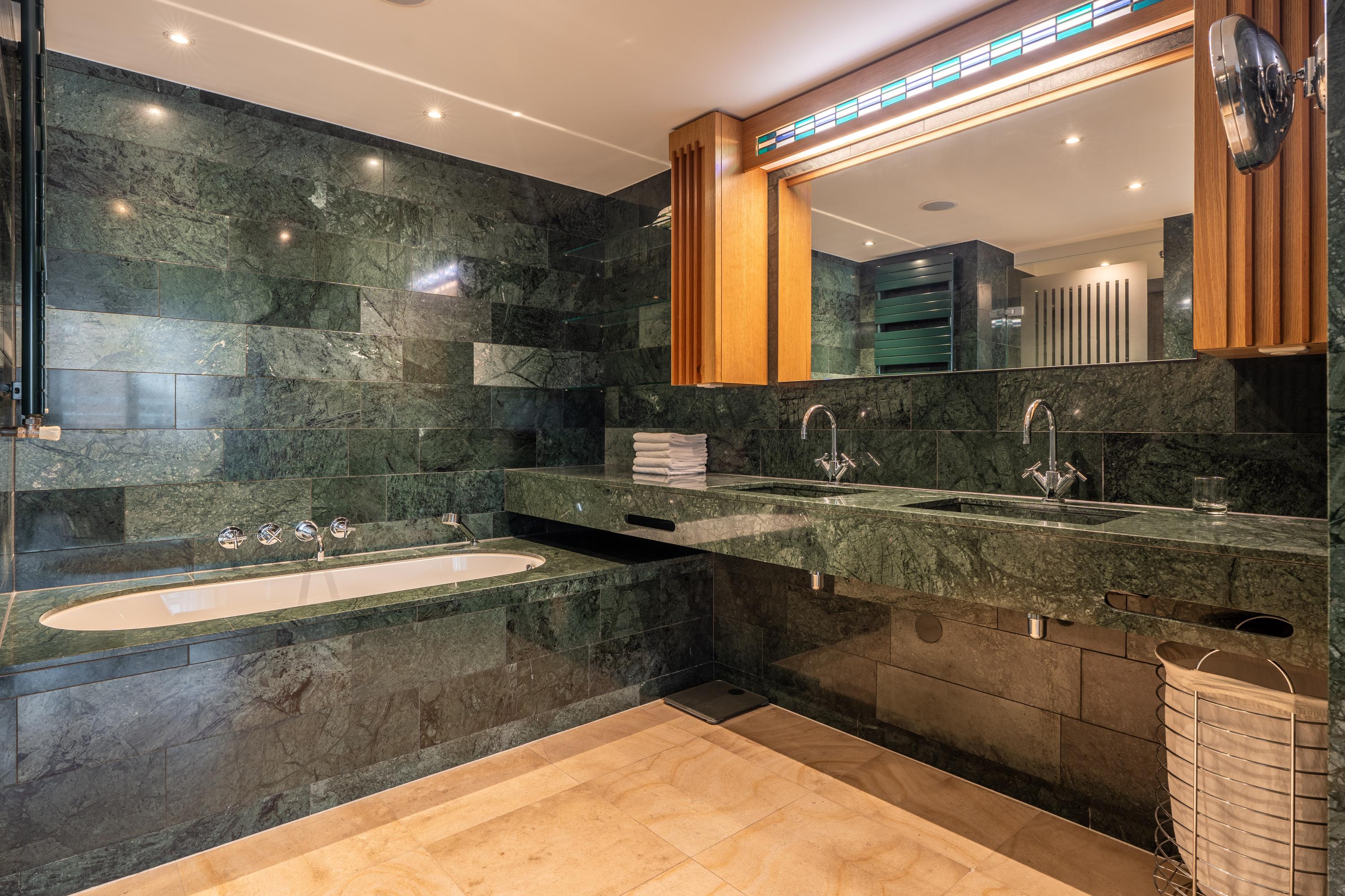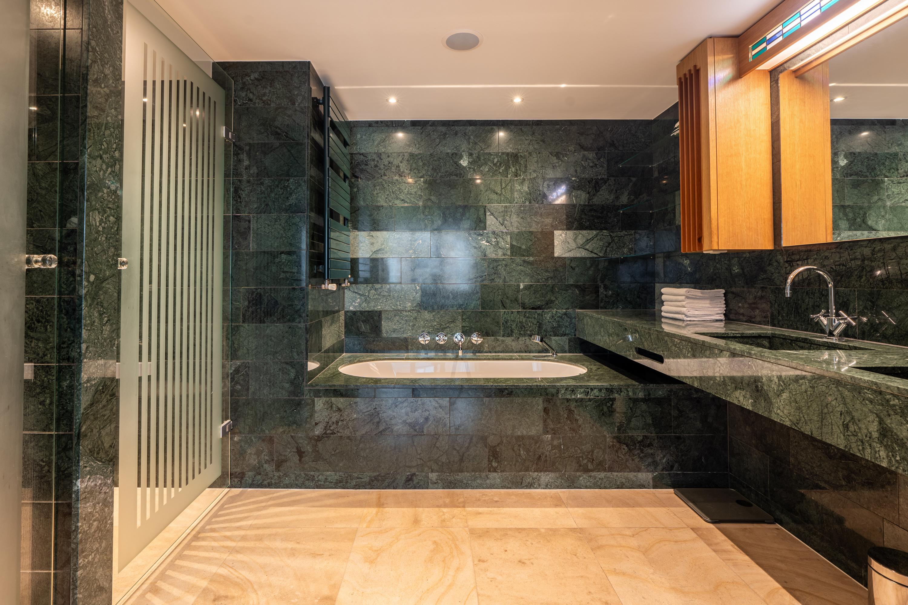 The primary bedroom, located in the northwest corner, includes spacious built-in wardrobes, air conditioning, built-in speakers, and an en-suite bathroom. The bathroom features exquisite green marble, a double vanity unit, a bathtub with a showerhead, a toilet, and a walk-in shower.