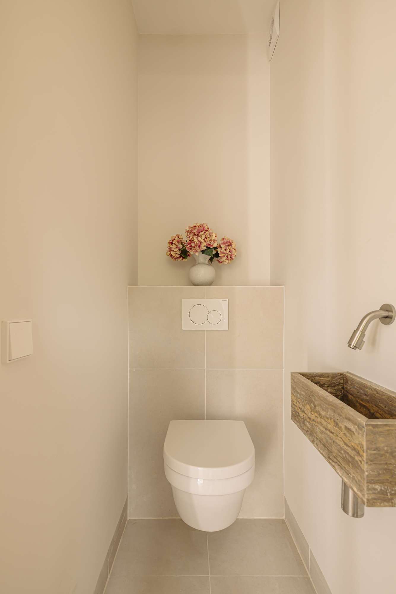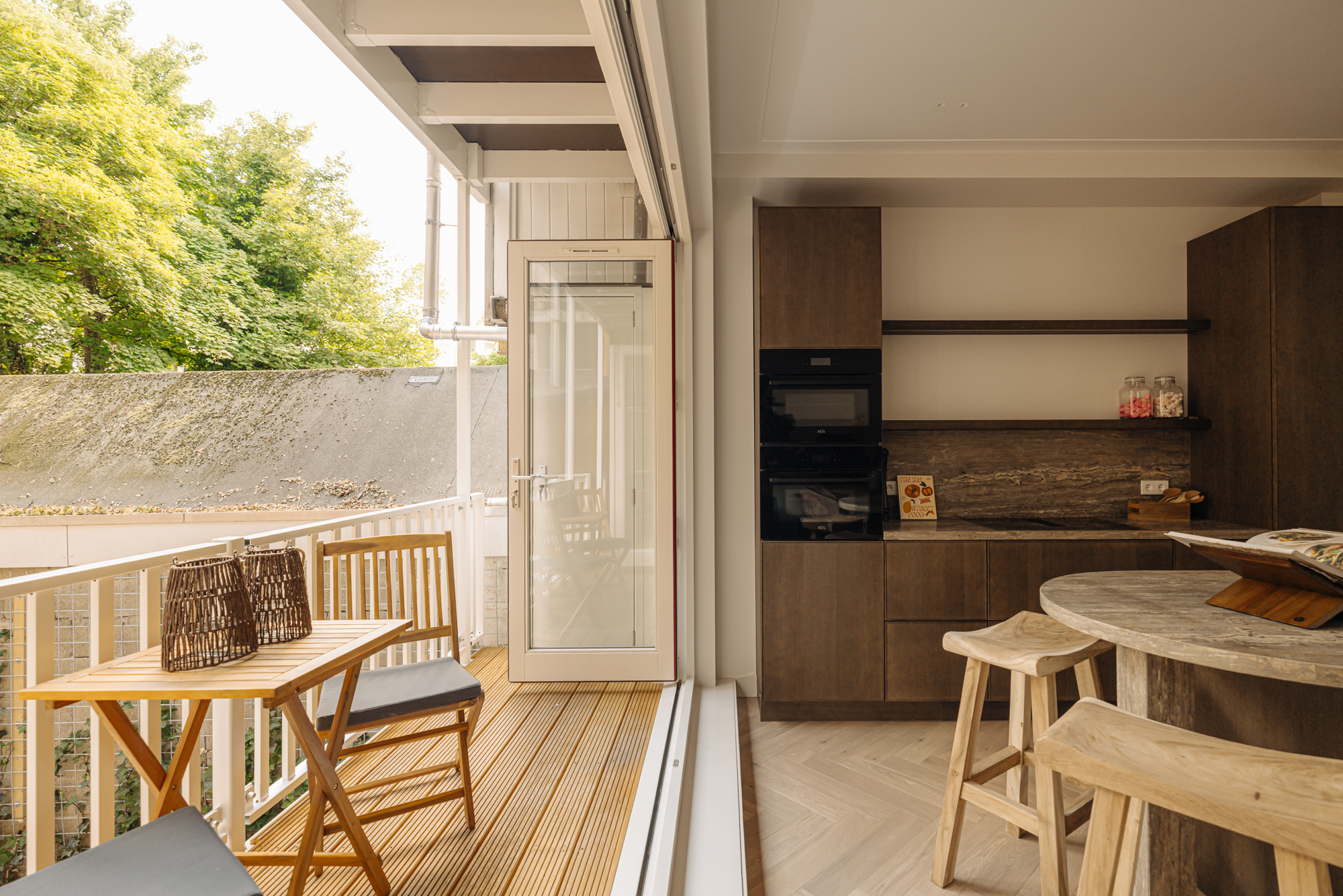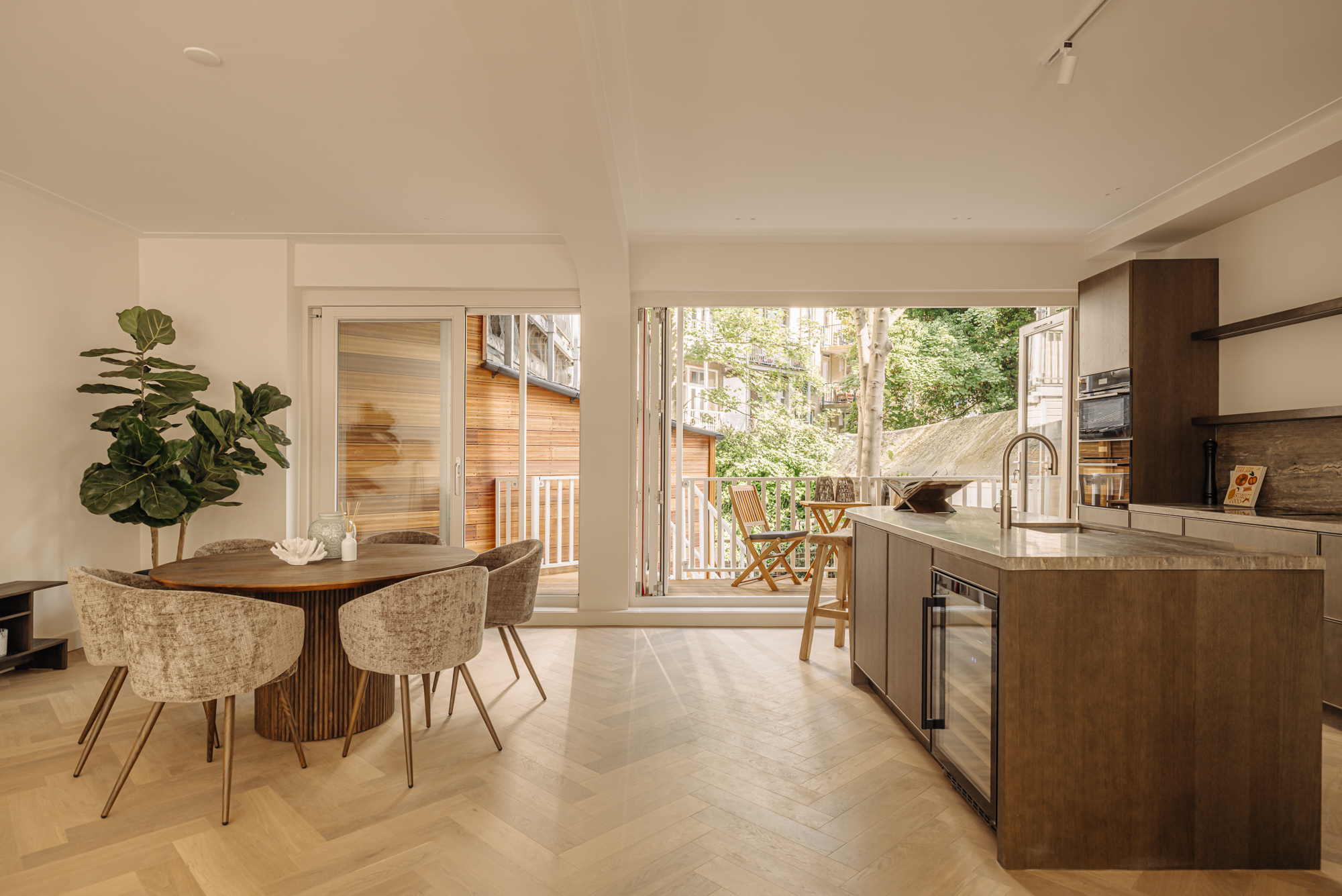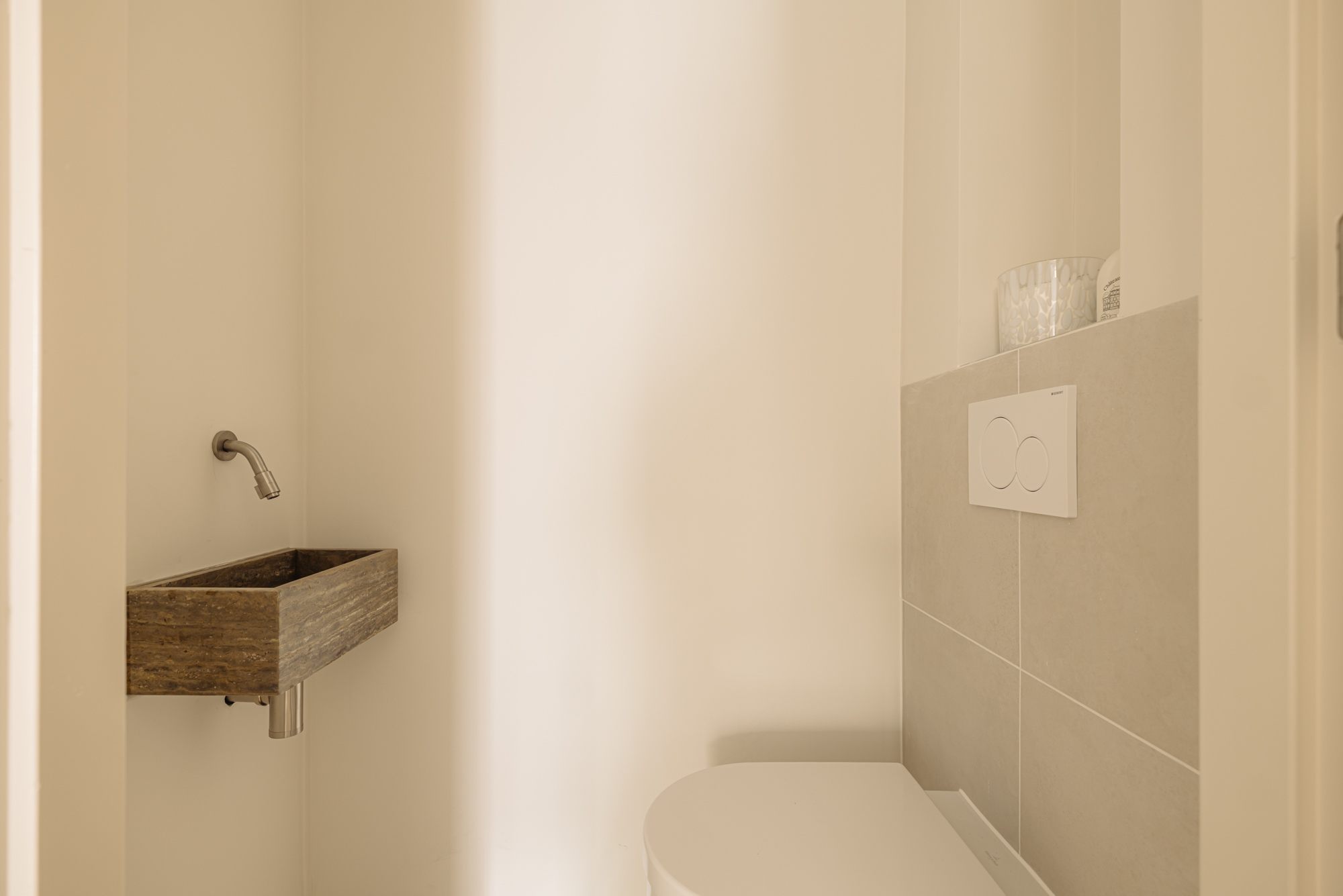 Upon entering, you'll step directly into the spacious living room located at the front. At the rear, you'll find a modern open kitchen with a central island and access to a wide west-facing balcony (approx. 9 m²), overlooking the beautifully landscaped garden of approx. 34 m², accessible via stairs from the balcony. The kitchen is finished with high-end materials and includes a 4-zone induction hob with integrated extractor, two combi ovens, a dishwasher, a fridge-freezer, a wine climate cabinet, and a Quooker. The island also features a cozy breakfast bar. Centrally located is a separate toilet with washbasin and the staircase leading down to the lower level.