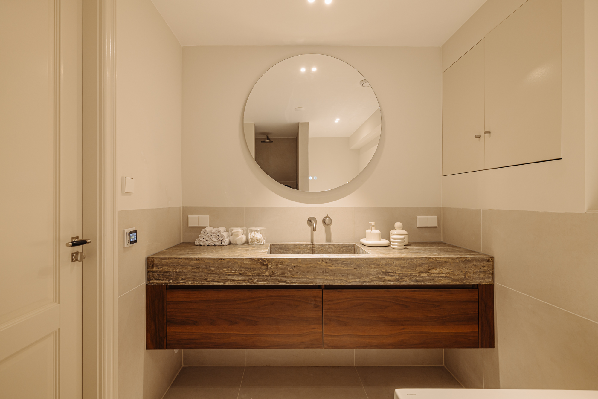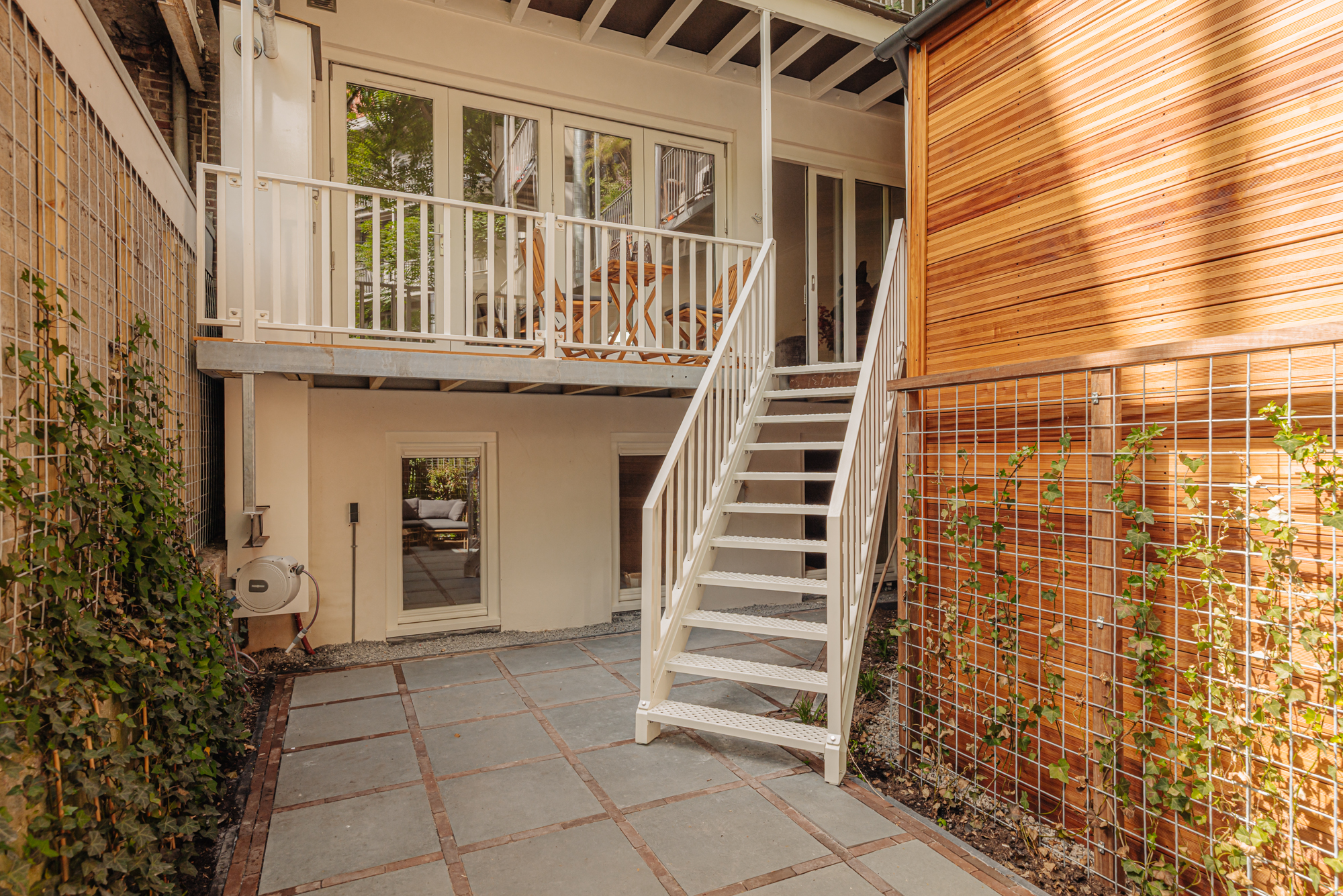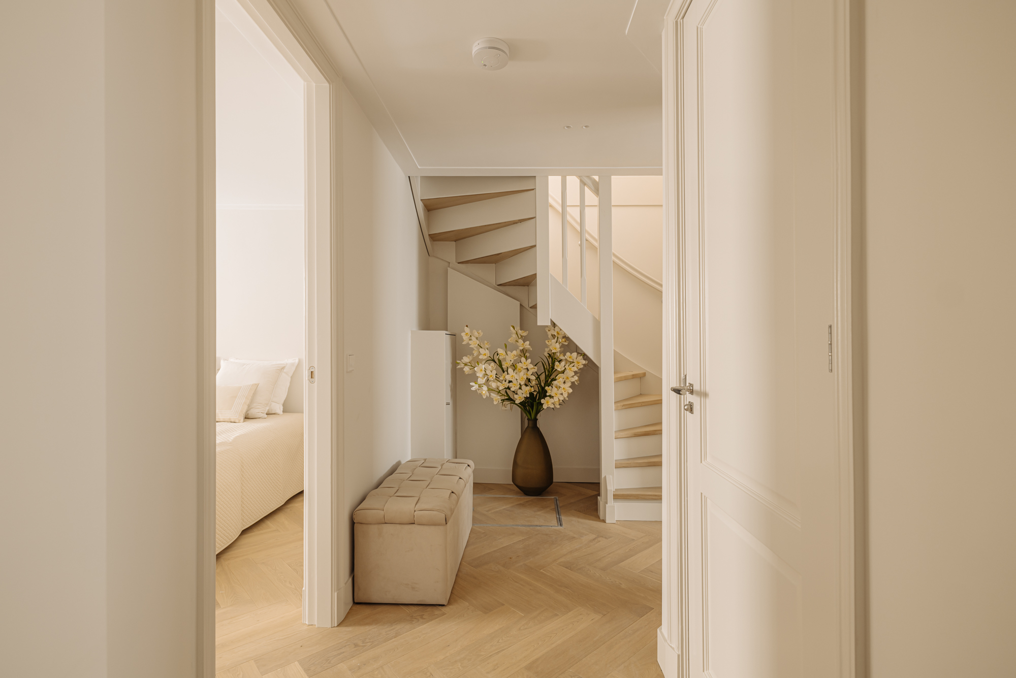 Private entrance on the ground floor. An open hallway with stairs leads up to the main living level (bel-etage).