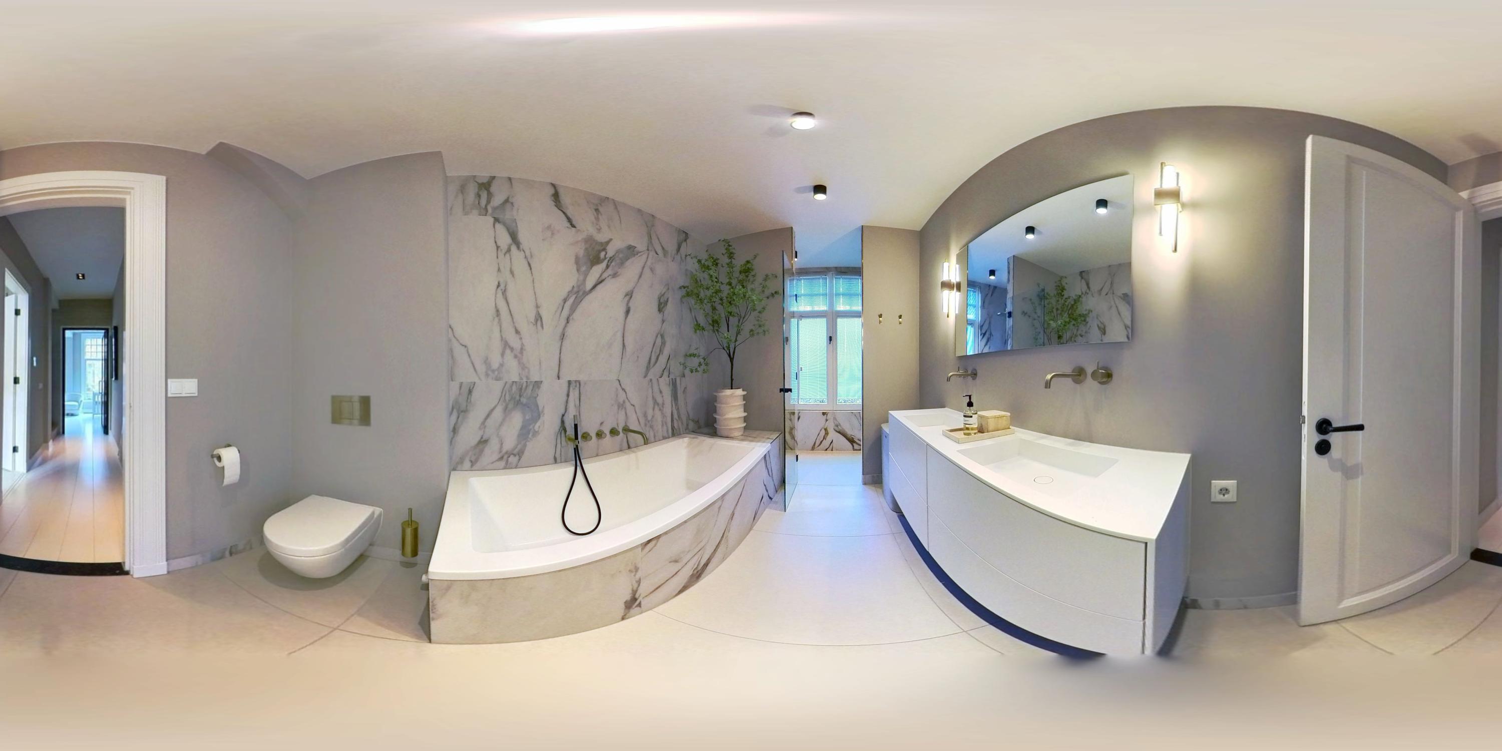 A staircase leads to the first floor. The central landing gives access to two bedrooms and the luxurious bathroom. At the front is a bedroom fitted with neat built-in wardrobes and a charming bay window, complete with custom-made cushions to create a cosy seating nook. At the rear is the master bedroom, also featuring built-in wardrobes and air conditioning, with direct access to a balcony overlooking the green inner gardens. The bathroom on this floor is fully finished in the same style as the other sanitary spaces and includes a double shower, double washbasin with cabinet, bathtub and toilet.