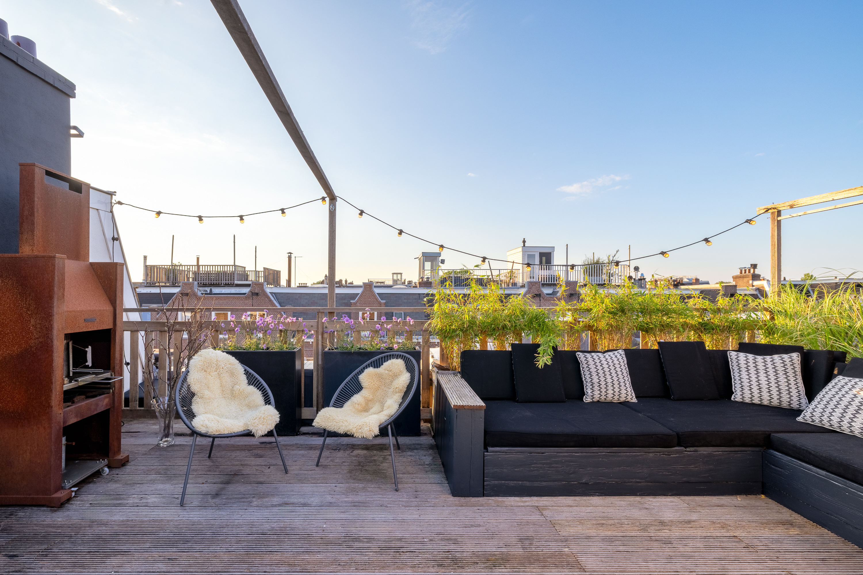 At a fantastic location in the popular Amsterdam Oud-Zuid, we offer this wonderfully bright and spacious double upper house. The beautiful roof terrace provides plenty of privacy, and you can enjoy the sun all day long. Multiple seating areas can be created. The house has three bedrooms, a spacious walk-in closet, and a roof terrace structure that can also be set up as a home office or yoga space. At the front of the house, there is also a lovely balcony.
