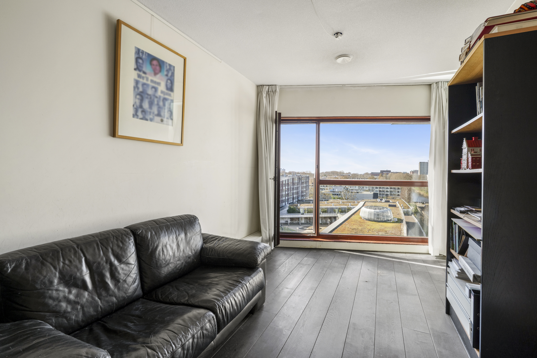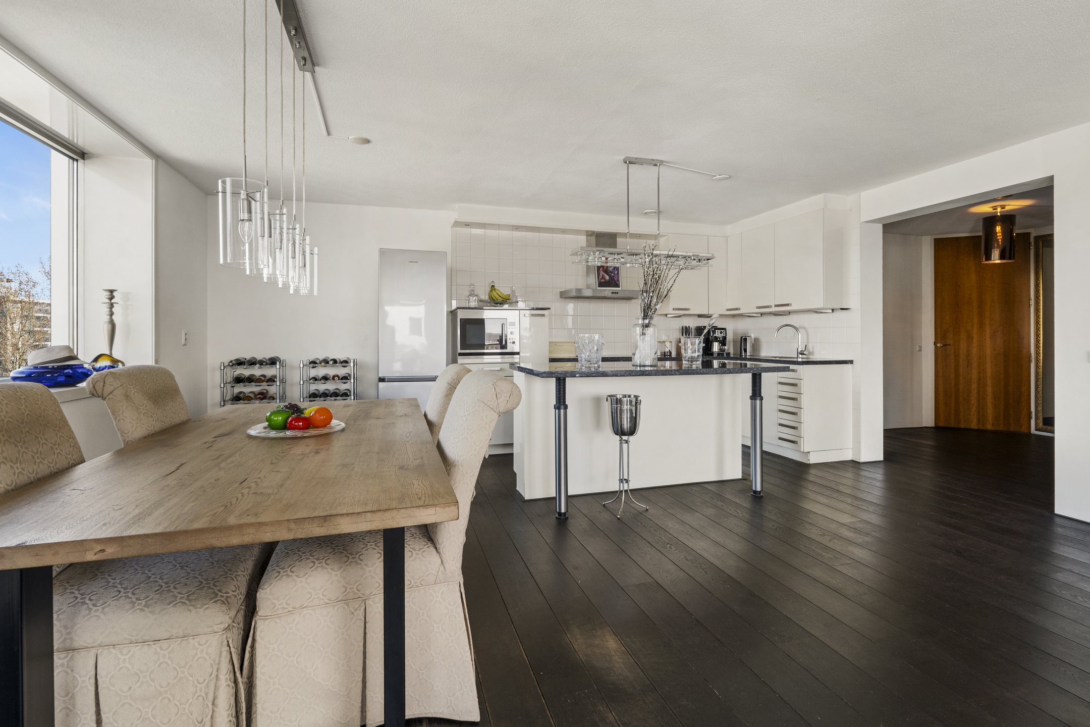 Apartment Amsterdam on the seventh floor of the Gelderhof complex offers 117 m² of refined living space and panoramic views over the water and the Zuidas skyline. This corner residence is designed for abundant natural light, with southwest and north-facing floor-to-ceiling windows that frame the city and waterfront vistas. The property features two spacious bedrooms, currently configured as a main suite with walk-in closet, a luminous living area with glass walls and fold-away façade, and a high-spec kitchen with island, solid oak parquet, and built-in appliances, all executed with clarity and purpose.